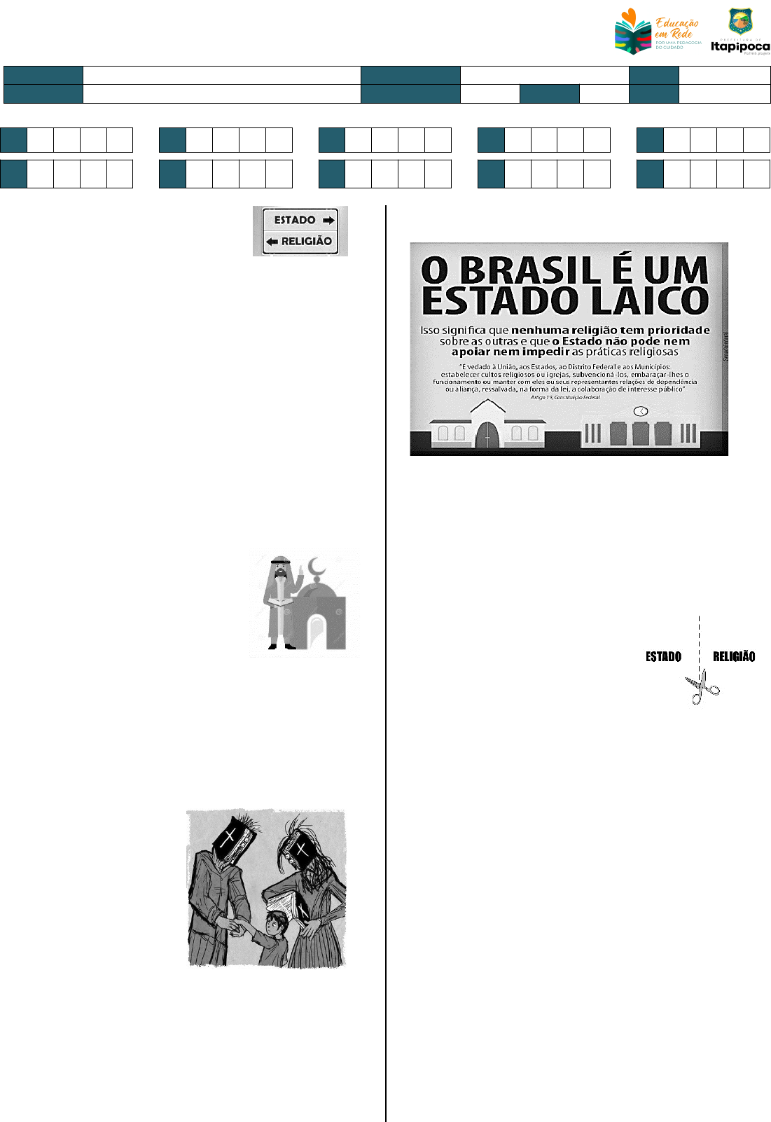 ESCOLA: PROFESSOR (A): NOTA: ALUNO (A): ANO/SÉRIE: TURMA: DATA: --------------------------------------------------------------------------- Cartão de Respostas --------------------------------------------------------------------------- 1 A) B) C) D) 2 A) B) C) D) 3 A) B) C) D) 4 A) B) C) D) 5 A) B) C) D) 6 A) B) C) D) 7 A) B) C) D) 8 A) B) C) D) 9 A) B) C) D) 10 A) B) C) D) ESTADO DO CEARÁ3º SIMULADO DE ENSINO RELIGIOSO 8º ANO DO ENSINO FUNDAMENTAL – 2023 PREFEITURA DE ITAPIPOCA SECRETARIA DE EDUCAÇÃO BÁSICA COORDENADORIA PEDAGÓGICA ANOS FINAIS DO ENSINO FUNDAMENTAL ---------------------------------------------------------------------------------------------------------------------------------------------------------------------------------- 1) Assinale a opção correta sobre o conceito de laicidade: A) As leis de um país devem ser feitas de acordo com a religião da maioria da população. B) Laicidade é uma forma de relação política entre o cidadão e o Estado e entre os próprios cidadãos. Ela permite que haja separação entre a sociedade civil e as religiões, de forma que o Estado não exerça nenhum poder religioso e as igrejas não exerçam poder sobre o governo. C) Laicidade é sinônimo de anti religiosidade. É possível para uma pessoa, ao mesmo tempo, ter fé religiosa e ser laica. D) Um Estado laico deve encontrar meios para garantir que todas as pessoas, todos os grupos religiosos e todas as filosofias de vida possuam a mesma religião. 2) O Estado que adota as premissas de uma tradição religiosa como fundamento para suas leis é chamado de: A) Estado democrático. B) Estado fanático. C) Estado sistemático. D) Estado teocrático. 3) Qual religião foi a religião oficial do Brasil, por força de lei, até a proclamação da República, em 1889? A) Cristianismo católico; B) Cristianismo protestante; C) Umbanda; D) Candomblé. 4) Defender de forma ofensiva, ou tentar converter outras pessoas a todo custo é um ato de: A) Laicidade B) Responsabilidade C) Amor D) Fanatismo 5) Leia o cartaz com atenção. Assinale a alternativa correta: A) Significa que o Estado pode interferir positivamente nas questões religiosas; B) Significa que as religiões podem e devem interferir nas questões políticas; C) Significa que Estado e Religião seguem separados em suas atividades, sem interferência; D) Significa que há proibição de ateísmo, pois o cidadão precisa fazer a sua escolha espiritual. 6) Analise as situações abaixo. São ações compatíveis com um Estado laico EXCETO: A) O Estado pode escolher qual será a religião da população; B) Deve haver plena liberdade religiosa, com direitos iguais para todas as tradições e filosofias de vida; C) A escolha religiosa de uma pessoa não pode afetar seus direitos de cidadão; D) As pessoas devem ser livres para escolher se querem seguir alguma religião ou filosofia de vida. 7) Leia: “As organizações são relacionadas ao governo. Como no Brasil nossos governantes são escolhidos de forma democrática, é comum que haja alterações nas suas organizações de acordo com os governantes que foram escolhidos. Os seus gestores devem atuar seguindo regulamentos e normas, que são estabelecidos pelo governo para o funcionamento de cada instituição”. BRASIL, Taciana. Espiritualidade e mística. In: SECRETARIA DE ESTADO DA EDUCAÇÃO DE MINAS GERAIS. Plano de Estudos Tutorado. 8º ano. Ensino Religioso. v. 3. Belo Horizonte: SEEMG, 2021, pág. 186. O texto acima refere-se ao: A) Primeiro Setor; B) Segundo Setor; C) Terceiro Setor; D) Todas as alternativas anteriores. 8. Cada um de nós tem a sua própria identidade religiosa, que influencia nossa forma de ver o mundo, e a forma como nos portamos politicamente. Os balões acima mostram frases de políticos com ideias: A) Fundamentalistas; B) Pluralistas; C) Fanáticas; D) Kardecistas. 9) Analise o infográfico sobre os símbolos religiosos presentes nas bandeiras dos países da ONU. Conforme nossos estudos assinale a alternativa INCORRETA: A) O símbolo judaico aparece em apenas uma bandeira; B) Os símbolos budistas aparecem em duas bandeiras; C) Os símbolos budistas e hindus aparecem em três bandeiras; D) Os símbolos cristãos aparecem em seis bandeiras mundo afora. 10) Sobre aquelas pessoas que expressam descrença em relação à existência de divindades, consideradas ateias, devem ser consideradas: A) Anormais; B) Hereges; C) Como qualquer outro cidadão; com direitos e deveres; D) Pagãs. Gabarito – 8º Ano 1 B 6 A 2 D 7 A 3 A 8 B 4 D 9 D 5 C 10 C