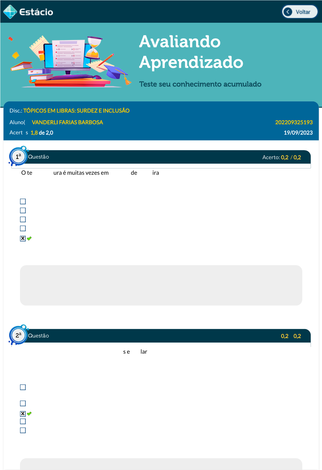Avaliando Aprendizado Teste seu conhecimento acumulado Disc.: TÓPICOS EM LIBRAS: SURDEZ E INCLUSÃO Aluno(a): VANDERLI FARIAS BARBOSA 202209325193 Acertos: 1,8 de 2,0 19/09/2023 Acerto: 0,2 / 0,2 O termo cultura é muitas vezes empregado de maneira erronea ou simplista. Assumindo que é através da cultura que se buscam soluções para os problemas cotidianos, que se interpreta a realidade e se produzem novas formas de interação social, quais aspectos abaixo são presentes na cultura surda no Brasil? Sonoridade, visualidade e literatura surda Associações literárias, visualidade e sonoridade Associações, Visualidade e sonoridade Sonoridade, literatura e Associações culturais Visualidade, comunidade e literatura surda Respondido em 19/09/2023 13:12:19 Explicação: Para Gladis Perlin, primeira doutora surda do Brasil na área dos estudos surdos (deaf studies), subárea dos estudos culturais, existe sim uma cultura dos surdos que é fruto da sua forma de ver o mundo e alguns de seus aspectos mais signi�cativos são Visualidade, comunidade e literatura surda Acerto: 0,2 / 0,2 As políticas inclusivas estão estabelecidas em pilares, atualmente onze pilares, com a �nalidade de alcançar a inclusão total. São exemplos destes pilares o conceito de que é inclusivo deve ser para todos, com todos e para todos; o valor humano é o maior objetivo a ser alçando; e o enfrentamento ao preconceito. Está correto a�rmar que: Políticas inclusivas devem favorecer pessoas sem necessidades especiais, pois estas são a maioria da sociedade. São agentes de inclusão e de exclusão apenas educadores e trabalhadores governamentais. A acessibilidade inclusiva é imprescindível para garantir condições plenas de participação na sociedade. A comunidade surda já está estabelecida e, portanto, não há preconceitos a serem enfrentados. O preconceito deve ser relativizado, considerando onde, quando e por quem foi realizado. Respondido em 19/09/2023 13:23:33 Explicação: Questão1 a Questão2 a https://simulado.estacio.br/alunos/inicio.asp javascript:voltar(); Todas as pessoas, sem exceção, são agentes da inclusão e da exclusão, o preconceito a comunidade surda ainda existe e não deve ser relativizado e as políticas inclusivas estabelecem a equiparação de direitos e de oportunidades, não devendo favorecer a nenhum grupo. Acerto: 0,2 / 0,2 O conceito de homogeneidade linguística advém de uma concepção estruturalista que consiste na ideia de que a língua, por um lado, é um sistema fechado de combinações e associações e, por outro lado, é vista como o lugar da não regularidade, onde surgem múltiplas formas, inclusive as menos legitimadas de uso da língua. Já a Sociolinguística se dedica ao estudo da língua como objeto: homogêneo, abstrato e formal. homogêneo e socialmente orientado heterogêneo e socialmente orientado. homogêneo, formal e socialmente orientado. heterogêneo, formal e socialmente orientado. Respondido em 19/09/2023 13:30:03 Explicação: A resposta correta é: heterogêneo e socialmente orientado. Acerto: 0,0 / 0,2 A Língua Brasileira de Sinais se constitui a partir de parâmetros. Considerando sua estrutura e seus parâmetros, avalie as asserções abaixo e a relação entre elas. I. Quando se altera um dos 5 parâmetros modi�ca-se o signi�cado do sinal. PORQUE II. Os classi�cadores marcam concordância com pessoas, objetos ou animais e todas as con�gurações das mãos são usadas como classi�cadores. Assinale a alternativa correta: A asserção I é uma proposição falsa, e a II é uma proposição verdadeira. As asserções I e II são proposições verdadeiras, e a II é uma justi�cativa da I. A asserção I é uma proposição verdadeira, e a II é uma proposição falsa. As asserções I e II são proposições falsas. As asserções I e II são proposições verdadeiras, mas a II não é uma justi�cativa da I. Respondido em 19/09/2023 13:36:51 Explicação: Ao alterar um dos cinco parâmetros modi�ca-se o signi�cado de um sinal. É essencial entender que nem todas as con�gurações de mãos são usadas como classi�cadores Questão3 a Questão4 a Acerto: 0,2 / 0,2 Questão5 a A discussão sobre surdez, educação e língua de sinais vem sendo ampliada nos últimos anos por pro�ssionais envolvidos com a educação de surdos, como também pela própria comunidade surda. A educação e inserção social dos surdos constituem um sério problema, e muitos caminhos têm sido seguidos na busca de uma solução. A o�cialização da Língua Brasileira de Sinais (LIBRAS) em abril de 2002 (Lei n. 10.436, de 24 de abril de 2002) começa a abrir novos caminhos, sem, no entanto, deixar de gerar polêmicas por pro�ssionais que trabalham com surdos e por surdos oralizados, que não se sentem parte de uma comunidade surda e não vêem mérito nessa vitória para a comunidade surda. DIZEU, L. C. T. DE B.; CAPORALI, S. A. A língua de sinais constituindo o surdo como sujeito. Educação & Sociedade, v. 26, n. 91, p. 583¿597, ago. 2005. A respeito da comunidade surda, biliguismo, erros e concepções, analise as a�rmativas. I. O termo surdo-mudo é correto do ponto de vista metodológico, uma vez que descreve a comunidade como um todo II. No caso dos surdos brasileiros a língua da comunidade ouvinte, o português, é considerdada como segunda língua, uma vez que a língua de sinais é aprendida de forma natural com o contato com seus pares III. O aprendizado da língua de sinais antes da língua da comunidade ouvinte, pode prejudicar a apreensão da segunda, uma vez as necessidades de comunicação já estão supridas pela lingua de sinais. IV. A linguagem de sinais não se limita ao alfabeto manual. É correto o que se a�rma em: I, II, III e IV. II e III, apenas. I e III, apenas. II e IV, apenas. I e IV, apenas. Respondido em 19/09/2023 13:15:59 Explicação: I. O termo correto é apenas "Surdo", e com frequência escrito c