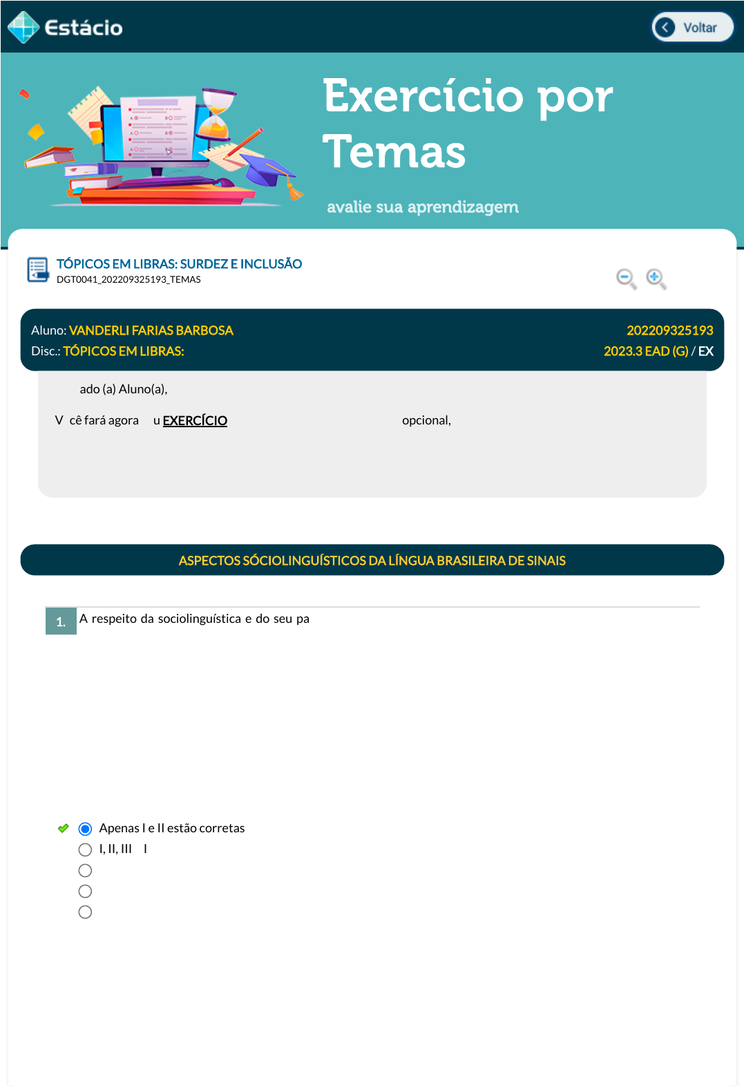 Exercício por Temas avalie sua aprendizagem A respeito da sociolinguística e do seu papel social para explicar e entender as variações linguísticas, analise as a�rmativas abaixo: I. Willian Labov, um dos maiores linguistas da história, desenvolveu 2 grandes estudos na década de 1960. II. Com os estudos de Willian Labov superou-se a ideia de que as variações linguísticas aconteciam de maneira aleatória e não sistêmica III. Willian Labov contribuiu fortemente através de seus estudos na comunidade Cajun. IV. As pesquisas de Willian Laobov com os nativos canadenses provaram que as variações linguísticas não obedecem a regras e in�uências sociais Assinale a alternativa correta: TÓPICOS EM LIBRAS: SURDEZ E INCLUSÃO Lupa DGT0041_202209325193_TEMAS Aluno: VANDERLI FARIAS BARBOSA Matr.: 202209325193 Disc.: TÓPICOS EM LIBRAS: 2023.3 EAD (G) / EX Prezado (a) Aluno(a), Você fará agora seu EXERCÍCIO! Lembre-se que este exercício é opcional, mas não valerá ponto para sua avaliação. O mesmo será composto de questões de múltipla escolha. Após responde cada questão, você terá acesso ao gabarito comentado e/ou à explicação da mesma. Aproveite para se familiarizar com este modelo de questões que será usado na sua AV e AVS. ASPECTOS SÓCIOLINGUÍSTICOS DA LÍNGUA BRASILEIRA DE SINAIS 1. Apenas I e II estão corretas I, II, III e IV estão corretas Apenas II e III estão corretas Apenas I e IV estão corretas Apenas I, II e IV estão corretas Data Resp.: 29/08/2023 15:37:04 Explicação: A partir dos estudos de Labov, foi superada a ideia de que a variação linguística seria aleatória e não sistêmica. A ideia de que a variação seria ordenada tornou-se um contraponto ao pensamento de que a língua se organizaria estruturalmente a despeito de seus falantes e seus usos diversos. Uma grande investigação sobre o inglês falado na ilha Martha''''s Vineyard, em Massachusetts, Estados Unidos. Um estudo de mesma natureza, com o dialeto falado na cidade de Nova York. javascript:voltar(); javascript:voltar(); javascript:diminui(); javascript:aumenta(); Usuários da Libras mais novos podem usar os sinais PAI, SIM e NUNCA, dessa língua, de forma diferenciada da de falantes mais velhos, por não terem sido expostos às suas formas datilológicas originais. Sobre esse assunto é correto dizer que: O conceito de homogeneidade linguística advém de uma concepção estruturalista que consiste na ideia de que a língua, por um lado, é um sistema fechado de combinações e associações e, por outro lado, é vista como o lugar da não regularidade, onde surgem múltiplas formas, inclusive as menos legitimadas de uso da língua. Já a Sociolinguística se dedica ao estudo da língua como objeto: Os estudiosos da área interacional da sociolinguística buscam a compreensão de como os usuários da língua replicam, em nível micro, crenças sociais do nível macro. A base da construção dialógica é formada pela conjunção de quais fatores? 2. trata-se de um caso de variação diastrática, por serem diferenças de usos entre usuários de diferentes per�s sociais. cabe à escola o ensino sobre uma forma única e correta de uso correto desses sinais. o uso das novas formas pelos usuários mais novos evidencia soletração individual. há diferença de forma e de sentido entre os sinais usados pelos diferentes grupos. não existe variação linguística em línguas de sinais, portanto, tal fenômeno é um caso isolado nesse contexto. Data Resp.: 29/08/2023 15:39:32 Explicação: A resposta correta é: trata-se de um caso de variação diastrática, por serem diferenças de usos entre usuários de diferentes per�s sociais. 3. heterogêneo e socialmente orientado. homogêneo, formal e socialmente orientado. heterogêneo, formal e socialmente orientado. homogêneo, abstrato e formal. homogêneo e socialmente orientado Data Resp.: 29/08/2023 15:40:14 Explicação: A resposta correta é: heterogêneo e socialmente orientado. 4. Comportamentais, �losó�cos e ideológicos Comportamentais, linguísticos e ideológicos Comportamentais, neurolinguísticos e sociais Comportamentais, linguísticos e �losó�cos Filosó�cos, linguísticos e ideológicos Data Resp.: 29/08/2023 15:41:04 Explicação: A respeito da sociolinguística avalie as asserções abaixo e a relação entre elas. I. As pesquisas de Labov em uma abordagem estruturalista, mostrou que a homogeneidade linguística poderia ser questionada. PORQUE II. Pode-se veri�car em qualquer língua natural que a variação linguística é controlada por diversos fatores, em um conceito chamado de heterogeneidade sistematizada. Assinale a alternativa correta. Estudos sociolinguísticos de orientação diacrônica podem atestar mudança, ao detectarem tendência de implantação de uma forma em detrimento do desaparecimento de outra. Sobre a mudança linguística é possível a�rmar que: A conjunção de fatores linguísticos com fatores comportamentais e ideológicos é a base da construção dialógica e permeia todo o pensamento sociolinguístico interacional. Os estudiosos dessa área trabalham na busca do entendimento sobre como os usuários da língua criam, reforçam e replicam, no nível micro, signi�cados e crenças sociais do nível macro. 5. As asserções I e II são proposições falsas. A asserção I é uma proposição verdadeira, e a II é uma proposição falsa. A asserção I é uma proposição falsa, e a II é uma proposição verdadeira. As asserções I e II são proposições verdadeiras, mas a II não é uma justi�cativa da I. As asserções I e II são proposições verdadeiras, e a II é uma justi�cativa da I. Data Resp.: 29/08/2023 15:43:22 Explicação: As pesquisas de Labov e toda a prática sociolinguística variacionista mostraram que a suposta homogeneidade linguística, prevista pela perspectiva estruturalista, poderia ser questionada pela ideia de heterogeneidade sistematiza