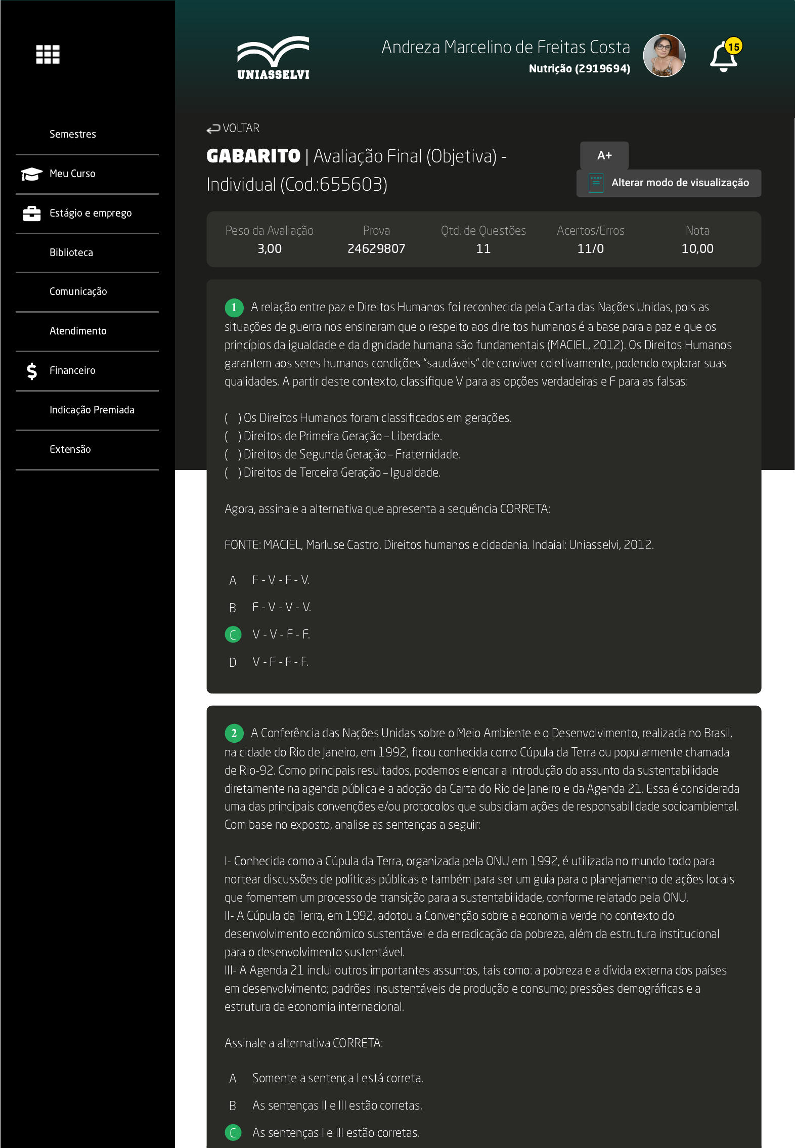 19/09/2023, 21:13 AVA https://ava2.uniasselvi.com.br/subject/grades-and-tests/answer-book/eyJ0ZXN0Ijp7InRlc3RDb2RlIjoiNjU1NjAzIiwiZGVzY3JpcHRpb24iOiJBdmFsaWHDp8OjbyBGaW5hbCAoT2JqZXRpdmEpIC0gSW5kaXZpZHVhb… 1/5 GABARITO | Avaliação Final (Objetiva) - Individual (Cod.:655603) Peso da Avaliação 3,00 Prova 24629807 Qtd. de Questões 11 Acertos/Erros 11/0 Nota 10,00 A relação entre paz e Direitos Humanos foi reconhecida pela Carta das Nações Unidas, pois as situações de guerra nos ensinaram que o respeito aos direitos humanos é a base para a paz e que os princípios da igualdade e da dignidade humana são fundamentais (MACIEL, 2012). Os Direitos Humanos garantem aos seres humanos condições “saudáveis” de conviver coletivamente, podendo explorar suas qualidades. A partir deste contexto, classifique V para as opções verdadeiras e F para as falsas: ( ) Os Direitos Humanos foram classificados em gerações. ( ) Direitos de Primeira Geração – Liberdade. ( ) Direitos de Segunda Geração – Fraternidade. ( ) Direitos de Terceira Geração – Igualdade. Agora, assinale a alternativa que apresenta a sequência CORRETA: FONTE: MACIEL, Marluse Castro. Direitos humanos e cidadania. Indaial: Uniasselvi, 2012. A F - V - F - V. B F - V - V - V. C V - V - F - F. D V - F - F - F. A Conferência das Nações Unidas sobre o Meio Ambiente e o Desenvolvimento, realizada no Brasil, na cidade do Rio de Janeiro, em 1992, ficou conhecida como Cúpula da Terra ou popularmente chamada de Rio-92. Como principais resultados, podemos elencar a introdução do assunto da sustentabilidade diretamente na agenda pública e a adoção da Carta do Rio de Janeiro e da Agenda 21. Essa é considerada uma das principais convenções e/ou protocolos que subsidiam ações de responsabilidade socioambiental. Com base no exposto, analise as sentenças a seguir: I- Conhecida como a Cúpula da Terra, organizada pela ONU em 1992, é utilizada no mundo todo para nortear discussões de políticas públicas e também para ser um guia para o planejamento de ações locais que fomentem um processo de transição para a sustentabilidade, conforme relatado pela ONU. II- A Cúpula da Terra, em 1992, adotou a Convenção sobre a economia verde no contexto do desenvolvimento econômico sustentável e da erradicação da pobreza, além da estrutura institucional para o desenvolvimento sustentável. III- A Agenda 21 inclui outros importantes assuntos, tais como: a pobreza e a dívida externa dos países em desenvolvimento; padrões insustentáveis de produção e consumo; pressões demográficas e a estrutura da economia internacional. Assinale a alternativa CORRETA: A Somente a sentença I está correta. B As sentenças II e III estão corretas. C As sentenças I e III estão corretas. VOLTAR A+ Alterar modo de visualização 1 2 Andreza Marcelino de Freitas Costa Nutrição (2919694) 15 Semestres Meu Curso Estágio e emprego Biblioteca Comunicação Atendimento Financeiro Indicação Premiada Extensão https://ava2.uniasselvi.com.br/home https://ava2.uniasselvi.com.br/my-course https://ava2.uniasselvi.com.br/internships-and-jobs https://ava2.uniasselvi.com.br/communication https://ava2.uniasselvi.com.br/attendance https://ava2.uniasselvi.com.br/financial https://ava2.uniasselvi.com.br/award-indication https://ava2.uniasselvi.com.br/extension 19/09/2023, 21:13 AVA https://ava2.uniasselvi.com.br/subject/grades-and-tests/answer-book/eyJ0ZXN0Ijp7InRlc3RDb2RlIjoiNjU1NjAzIiwiZGVzY3JpcHRpb24iOiJBdmFsaWHDp8OjbyBGaW5hbCAoT2JqZXRpdmEpIC0gSW5kaXZpZHVhb… 2/5 D As sentenças I e II estão corretas. Em seguida à Convenção de Genebra, que ocorreu na Suíça e teve como intuito tratar dos direitos das pessoas em tempos de guerra, surgiu a Constituição Mexicana, que trata de outras questões do ser humano e precedeu a criação da Organização Internacional do Trabalho. Com relação às medidas ocorridas na Constituição Mexicana, analise as sentenças a seguir: I- Regulamentou o trabalho das mulheres e dos menores de idade. II- Proporcionou salários iguais para tarefas iguais. III- Limitou o uso de armas convencionais. Agora, assinale a alternativa CORRETA: A As sentenças II e III estão corretas. B Somente a sentença II está correta. C As sentenças I e II estão corretas. D As sentenças I e III estão corretas. A Constituição de 1824 trouxe alguns benefícios com relação à vida econômica e social, melhores condições de trabalho, entre outros aspectos. Ela permaneceu até a Proclamação da República, sendo que dois anos depois da proclamação é que se instalou a Constituição Republicana no Brasil. A Constituição Republicana se instaurou no Brasil em 1891 e há ações que podem ser consideradas avanços para o Brasil. Sobre essas ações, classifique V para as sentenças verdadeiras e F para as falsas: ( ) A separação definitiva da Igreja do Estado. ( ) Voto a descoberto. ( ) Abolição das penas de galés. ( ) Liberdade de associação e reunião sem armas. Agora, assinale a alternativa que apresenta a sequência CORRETA: A V - V - V - F. B F - V - F - V. C F - F - V - F. D V - F - V - V. Ao longo da sua existência, as sociedades humanas evoluíram de aglomerados humanos de hábitos nômades para comunidades sedentárias, o que ocasionou uma série de mudanças comportamentais. Com relação ao período nômade, analise as sentenças a seguir: I- O hábito nômade ocasionava mais impactos sobre o ambiente do que o sedentarismo, fato que levou à insustentabilidade desse modo de vida e à sua consequente substituição. II- Durante esse período, as atividades relacionadas à alimentação baseavam-se na coleta de vegetais e na caça. III- Um dos fatores que dificultou a manutenção do modo de vida nômade foi o desconhecimento do fogo, cujo uso só foi administrado quando o sedentarismo já era a prática dominante. IV- O Vale da Mesopotâmia pode ser considerado o berço do sedentarismo, já que é 