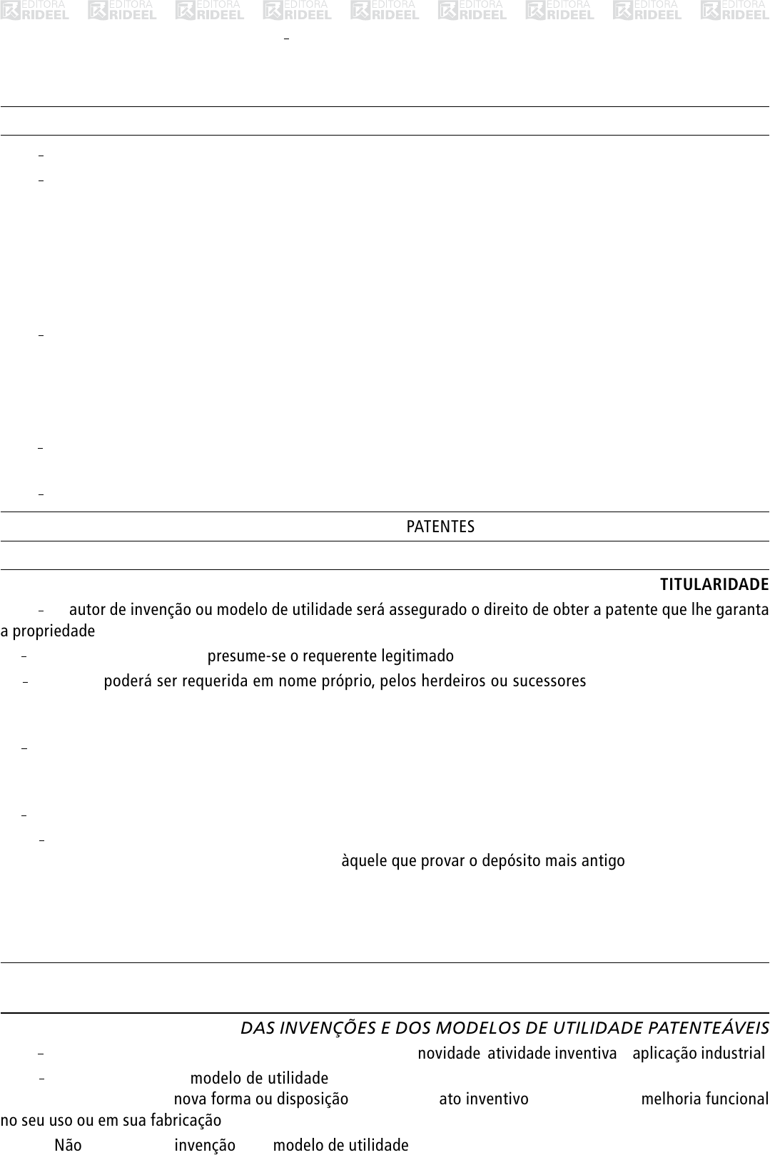 LEI No 9.279, DE 14 DE MAIO DE 1996 Regula direitos e obrigações relativos à propriedade industrial. c Publicada no DOU de 15-5-1996. DISPOSIÇÕES PRELIMINARES Art. 1o Esta Lei regula direitos e obrigações relativos à propriedade industrial. Art. 2o A proteção dos direitos relativos à propriedade industrial, considerado o seu interesse social e o desenvol‑ vimento tecnológico e econômico do País, efetua‑se mediante: I – concessão de patentes de invenção e de modelo de utilidade; II – concessão de registro de desenho industrial; III – concessão de registro de marca; IV – repressão às falsas indicações geográficas; e V – repressão à concorrência desleal. Art. 3o Aplica‑se também o disposto nesta Lei: I – ao pedido de patente ou de registro proveniente do exterior e depositado no País por quem tenha proteção assegurada por tratado ou convenção em vigor no Brasil; e II – aos nacionais ou pessoas domiciliadas em país que assegure aos brasileiros ou pessoas domiciliadas no Brasil a reciprocidade de direitos iguais ou equivalentes. Art. 4o As disposições dos tratados em vigor no Brasil são aplicáveis, em igualdade de condições, às pessoas físicas e jurídicas nacionais ou domiciliadas no País. Art. 5o Consideram‑se bens móveis, para os efeitos legais, os direitos de propriedade industrial. TÍTULO I – DAS PATENTES Capítulo I DA TITULARIDADE Art. 6o Ao autor de invenção ou modelo de utilidade será assegurado o direito de obter a patente que lhe garanta a propriedade, nas condições estabelecidas nesta Lei. § 1o Salvo prova em contrário, presume‑se o requerente legitimado a obter a patente. § 2o A patente poderá ser requerida em nome próprio, pelos herdeiros ou sucessores do autor, pelo cessionário ou por aquele a quem a lei ou o contrato de trabalho ou de prestação de serviços determinar que pertença a titularidade. § 3o Quando se tratar de invenção ou de modelo de utilidade realizado conjuntamente por duas ou mais pessoas, a patente poderá ser requerida por todas ou qualquer delas, mediante nomeação e qualificação das demais, para ressalva dos respectivos direitos. § 4o O inventor será nomeado e qualificado, podendo requerer a não divulgação de sua nomeação. Art. 7o Se dois ou mais autores tiverem realizado a mesma invenção ou modelo de utilidade, de forma indepen‑ dente, o direito de obter patente será assegurado àquele que provar o depósito mais antigo, independentemente das datas de invenção ou criação. Parágrafo único. A retirada de depósito anterior sem produção de qualquer efeito dará prioridade ao depósito imediatamente posterior. Capítulo II DA PATENTEABILIDADE Seção I DAS INVENÇÕES E DOS MODELOS DE UTILIDADE PATENTEÁVEIS Art. 8o É patenteável a invenção que atenda aos requisitos de novidade, atividade inventiva e aplicação industrial. Art. 9o É patenteável como modelo de utilidade o objeto de uso prático, ou parte deste, suscetível de aplicação industrial, que apresente nova forma ou disposição, envolvendo ato inventivo, que resulte em melhoria funcional no seu uso ou em sua fabricação. Art. 10. Não se considera invenção nem modelo de utilidade: Rodrigo e Camila Realce Rodrigo e Camila Realce Rodrigo e Camila Realce Rodrigo e Camila Realce Rodrigo e Camila Realce Rodrigo e Camila Realce Rodrigo e Camila Realce Rodrigo e Camila Realce Rodrigo e Camila Realce Rodrigo e Camila Realce Rodrigo e Camila Realce Rodrigo e Camila Realce Rodrigo e Camila Realce Rodrigo e Camila Realce rodrigo.victor Realce rodrigo.victor Realce rodrigo.victor Realce I – descobertas, teorias científicas e métodos matemáticos; II – concepções puramente abstratas; III – esquemas, planos, princípios ou métodos comerciais, contábeis, financeiros, educativos, publicitários, de sor‑ teio e de fiscalização; IV – as obras literárias, arquitetônicas, artísticas e científicas ou qualquer criação estética; V – programas de computador em si; VI – apresentação de informações; VII – regras de jogo; VIII – técnicas e métodos operatórios ou cirúrgicos, bem como métodos terapêu ticos ou de diagnóstico, para apli‑ cação no corpo humano ou animal; e IX – o todo ou parte de seres vivos naturais e materiais biológicos encontrados na natureza, ou ainda que dela isolados, inclusive o genoma ou germoplasma de qualquer ser vivo natural e os processos biológicos naturais. Art. 11. A invenção e o modelo de utilidade são considerados novos quando não compreendidos no estado da técnica. § 1o O estado da técnica é constituído por tudo aquilo tornado acessível ao público antes da data de depósito do pedido de patente, por descrição escrita ou oral, por uso ou qualquer outro meio, no Brasil ou no exterior, ressalvado o disposto nos artigos 12, 16 e 17. § 2o Para fins de aferição da novidade, o conteú do completo de pedido depositado no Brasil, e ainda não publicado, será considerado estado da técnica a partir da data de depósito, ou da prioridade rei vindi cada, desde que venha a ser publicado, mesmo que subsequentemente. § 3o O disposto no parágrafo anterior será aplicado ao pedido internacional de patente depositado segundo tratado ou convenção em vigor no Brasil, desde que haja processamento nacional. Art. 12. Não será considerada como estado da técnica a divulgação de invenção ou modelo de utilidade, quando ocorrida durante os doze meses que precederem a data de depósito ou a da prioridade do pedido de patente, se promovida: I – pelo inventor; II – pelo Instituto Nacional da Propriedade Industrial – INPI, através de publicação oficial do pedido de patente depositado sem o consentimento do inventor, baseado em informações deste obtidas ou em decorrência de atos por ele realizados; ou III – por terceiros, com base em informações obtidas direta ou indiretamente do inventor ou em decorrência de atos 