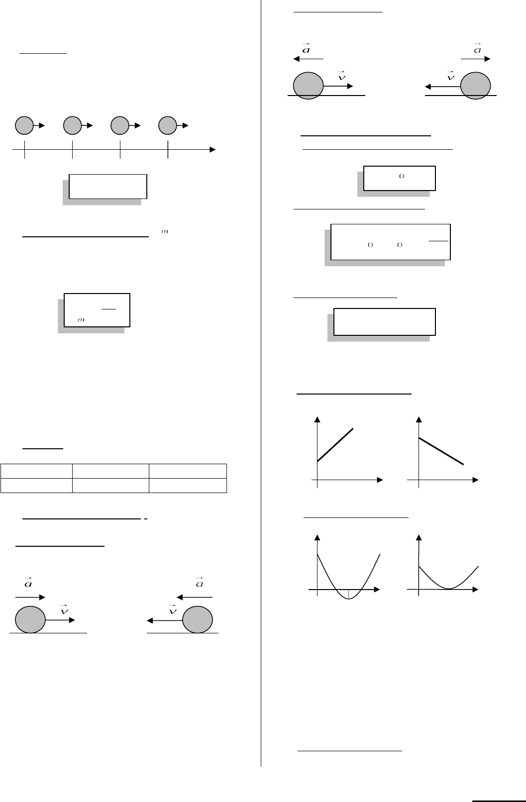 5- MOVIMENTO UNIFORMEMENTE VARIADO (MUV): 5.1-Definição: É aquele em que a velocidade é variável e a aceleração escalar é constante. 4 m/s 8 m/s 12 m/s 16 m/s 2 s 2 s 2 s a = constante 5.2- Aceleração escalar Média (a ): Define-se como aceleração escalar média de um móvel; o quociente entre sua variação de velocidade (∆v) e o intervalo de tempo (∆t) gasto nessa variação. a = t v Onde: ∆v = v – vo (variação de velocidade) ∆t = t - to (tempo gasto) 5.3- Unidade: No SI No CGS Outras m/s² Cm/s² Km/h², km/s² 5.4- Classificação do M.U.V.: → M.U.V. Acelerado: O móvel apresenta velocidade e aceleração com o mesmo sentido, ou seja, com sinais iguais. a > 0 e v > 0 a < 0 e v < 0 → M.U.V. Retardado: O móvel apresenta velocidade e aceleração com sentidos opostos, ou seja, com sinais diferentes. a < 0 e v > 0 a < 0 e v < 0 5.5- Funções horárias do MUV: → Equação horária da velocidade: v = v + a.t → Equação horária da posição: S = S + v .t + 2 . 2ta → Equação de Torricelli: v² = v02 + 2. a . ∆s 6- Gráficos do M.U.V. 6.1 Gráfico v =f(t) ou (vxt): V V vo vo t t 6.2- Gráfico S=f(t) ou Sxt: S S So So t’ t t t1 t2 t’ t1 e t2 : Tempos em que o movél passa pela origem das posições. t’ : Tempo em que o movél muda de sentido. 6.3-Gáfico a= f(t) ou axt: a a + a t t - a → Análise gráfica: a a A t t A = velocidade média = V Exercício proposto (M.U.V.) 01- Calcule a aceleração média de um carro, sabendo-se que sua velocidade varia de 4m/s para 12 m/s em 2s. 02- Um carro parte do repouso e atinge a velocidade de 25 m/s em 5s, ache a sua aceleração média nesse intervalo de tempo. 03- A velocidade de um ponto material passa de 10 m/s para 70 m/s. Sabendo-se que a aceleração média é de 20 m/s². Calcule o tempo nessa variação. 04- Um ponto material em movimento retilíneo, adquire velocidade que obedece a função v = 40 – 10.t, no S.I.. Pede-se: a) A velocidade inicial. b) A aceleração. c) O instante em que o ponto material muda de sentido. d) Classifique o movimento em acelerado ou retardado nos instante 2s e 6s. 05- Um ponto material parte do repouso e após 10s tem velocidade de 90 m/s. Sabendo-se que o móvel realiza movimento uniformemente variado, ache sua velocidade no instante 22s. 06- Um móvel parte com velocidade de 4 m/s de um ponto com uma trajetória retilínea e aceleração constante de 5 m/s². Calcule sua velocidade no instante 16s. 07- Um corpo percorre uma trajetória retilínea com aceleração constante de 4 m/s². No instante inicial o móvel é retardado e sua velocidade em módulo é de 20 m/s. Determine a velocidade do corpo no instante 30s. 08- Um avião, na decolagem, percorre a partir do repouso e sobre a pista, 900 m com aceleração de 50 m/s². Calcule a velocidade de decolagem do avião. 09- Uma composição de metrô parte de uma estação e percorre 100 m com aceleração constante, atingindo 20 m/s. Determine a aceleração durante o processo. 10- Um corpo desloca-se sobre uma trajetória retilínea obedecendo à função horária s = -15 – 2.t + t², no S.I.. Pede-se: a) A posição inicial, a velocidade e a aceleração do corpo. b) A função horária da velocidade. c) O instante em que o móvel passa pela origem das posições. 11- Um ponto material desloca-se sobre uma trajetória retilínea obedecendo a função s = 6 – 5.t + t² no S.I.. Determine: a) A posição do corpo no instante 5s. b) O caminho percorrido pelo móvel entre os instantes 4s e 6s. 12- O gráfico abaixo representa a velocidade de um móvel em função do tempo. Ache a velocidade do corpo no instante 10s. v (m/s) 24 t (s) 6 13- Um móvel realiza MUV e sua velocidade varia com o tempo de acordo com o gráfico abaixo. Calcule: a) A função horária da velocidade. b) O espaço percorrido de 0s a 8s. c) A velocidade média do móvel no intervalo de tempo de 0s a 8s. v(m/s) 21 5 t(s) 8 14- A velocidade de um móvel em movimento retilínea é dada pelo gráfico. Sabendo-se que o móvel no instante t = 0s estava na posição 20 m. Determine sua posição no instante 10s. v(m/s) 40 t(s) 10 15- É dado o gráfico de um ponto material que se movimenta numa trajetória retilínea. Determine: a) Qual a aceleração do ponto material nos intervalos de 0s a 3s e de 3s a 10s. b) Qual a velocidade escalar média no intervalo de 0s a 10s. v(m/s) 7 4 t(s) 3 10 16- O gráfico da aceleração de um móvel em movimento retilíneo é dado na figura. Sabendo que sua velocidade inicial é zero, determine: a) A aceleração média no intervalo de 0s a 20s. b) O gráfico da velocidade em função do tempo. a (m/s²) 4 5 20 t (s) -3 17- O gráfico da figura indica como varia o esboço da posição de um móvel em função do tempo para certo MUV. A aceleração do móvel em m/s² é de: s(m) 3 t(s) 1 2 3 4 -1 18- Dois automóveis que correm em estradas retas e paralelas têm posições, a partir de uma origem Comum, dada por: s1=30 t e s2=1,0. 103 + 0,2 t2, em que s é dado em metros e t, em segundos. a) Calcule os instantes em que os automóveis devem estar lado a lado. b) Faça um esboço dos gráficos s1(t) e s2 (t) num mesmo sistema cartesiano. 19- Um corpo é dotado de velocidade Vo = 10m/s, adquire uma aceleração constante de 15m/s2. Que espaço ele deve percorrer para atingir uma velocidade de 20m/s? 20- Um automóvel com velocidade de 40m/s passa a ser freada a razão de 10m/s2. Que distância percorre até parar? 21- Um veículo está animado com velocidade de 20m/s, quando é acelerado uniformemente a 5m/s2 durante 50m. Qual a sua velocidade após esse percurso?
