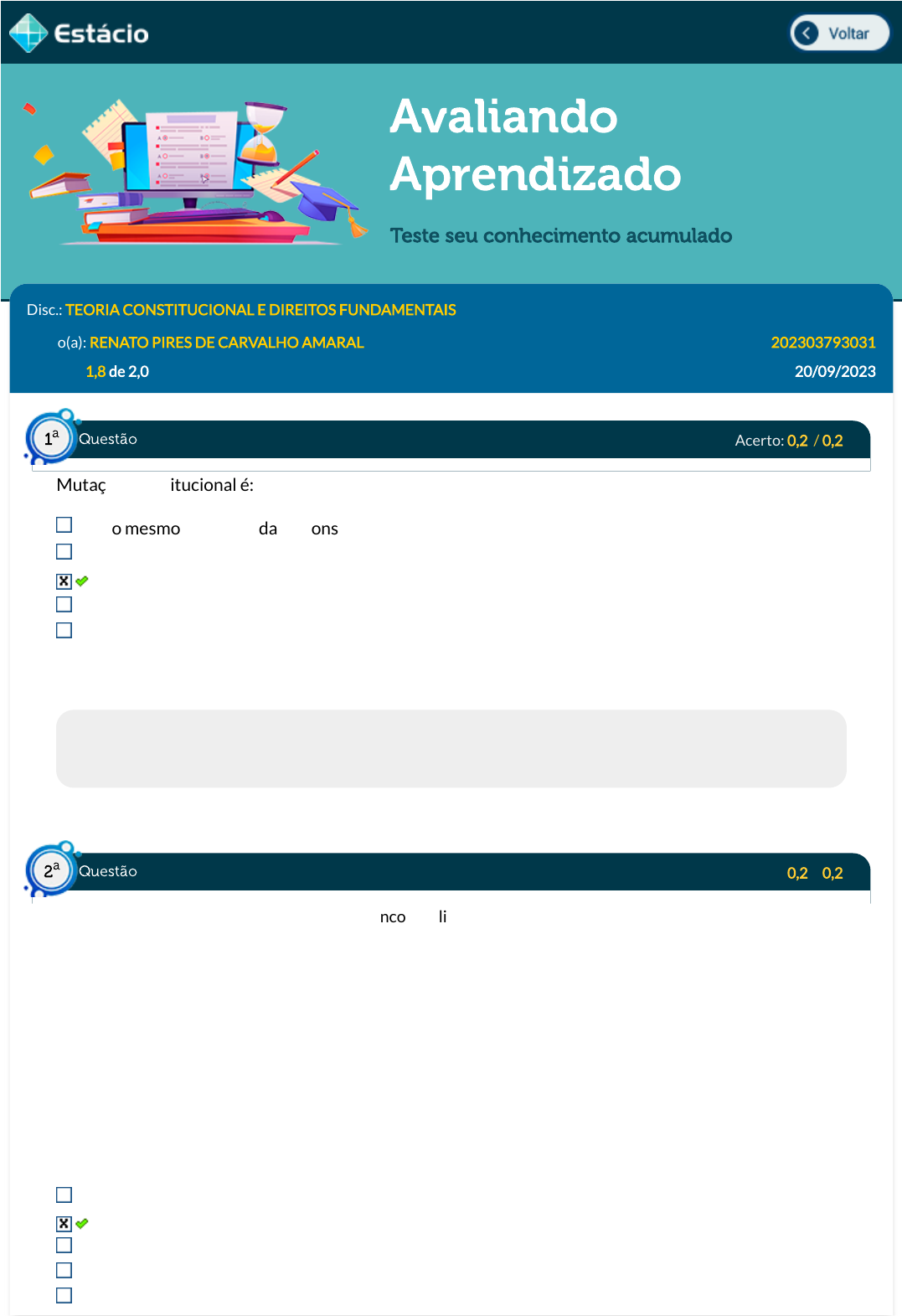 20/09/2023, 12:42 Estácio: Alunos https://simulado.estacio.br/alunos/ 1/6 Avaliando Aprendizado Teste seu conhecimento acumulado Disc.: TEORIA CONSTITUCIONAL E DIREITOS FUNDAMENTAIS Aluno(a): RENATO PIRES DE CARVALHO AMARAL 202303793031 Acertos: 1,8 de 2,0 20/09/2023 Acerto: 0,2 / 0,2 Mutação constitucional é: o mesmo que emenda da constituição. o processo não-formal de mudança de constituição �exível. o processo não-formal de mudança de constituição rígida. o processo formal de alteração do texto constitucional. o mesmo que reforma da constituição. Respondido em 20/09/2023 12:16:41 Explicação: A resposta correta é: o processo não-formal de mudança de constituição rígida. Acerto: 0,2 / 0,2 O Poder Constituinte Derivado Reformador encontra limitações para seu exercício, diferentemente do Poder Constituinte Originário. Tais limitações podem ser explícitas, de ordem: I. circunstancial. II. material. III. temporal. Está(ão) CORRETA(S): I e III, apenas. I, II e III. I e II, apenas. II e III, apenas. II, apenas. Questão1 a Questão2 a https://simulado.estacio.br/alunos/inicio.asp javascript:voltar(); 20/09/2023, 12:42 Estácio: Alunos https://simulado.estacio.br/alunos/ 2/6 Respondido em 20/09/2023 12:17:43 Explicação: LIMITAÇÕES EXPLÍCITAS: São aquelas que constam na própria Constituição de forma clara e objetiva, e que traçam as regras às quais o poder reformador deve obediência. Essas limitações se dividem em quatro categorias: Formais; Materiais; Circunstanciais; Temporais. Acerto: 0,2 / 0,2 Acerca do direito de reunião, marque a alternativa correta: É permitida a reunião em locais públicos, mesmo com armas, desde que haja autorização da autoridade competente. Todos podem reunir-se paci�camente, sem armas, em locais abertos ao público, independentemente de autorização, desde que não frustrem outra reunião anteriormente convocada para o mesmo local. Todos podem se reunir em locais públicos, mesmo que estejam com armas, desde que paci�camente. São permitidas passeatas e manifestações pací�cas, sem armas, desde que autorizadas pela autoridade competente. A liberdade de reunião protege as manifestações em locais públicos, mas não as passeatas. Respondido em 20/09/2023 12:18:21 Explicação: A resposta correta é: Todos podem reunir-se paci�camente, sem armas, em locais abertos ao público, independentemente de autorização, desde que não frustrem outra reunião anteriormente convocada para o mesmo local. Acerto: 0,2 / 0,2 (BIO-RIO - 2016 - Prefeitura de Mangaratiba - RJ - Guarda Municipal) Apurar infrações penais contra a ordem política e social ou em detrimento de bens, serviços e interesses da União ou de suas entidades autárquicas e empresas públicas, assim como outras infrações cuja prática tenha repercussão interestadual ou internacional e exija repressão uniforme, segundo se dispuser em lei, é atribuição: das polícias civis. dos corpos de bombeiros militares. da polícia rodoviária federal. das polícias militares. da polícia federal. Respondido em 20/09/2023 12:19:41 Explicação: De acordo com o art. 144, § 1º, I da CF/88, a polícia federal destina-se a apurar infrações penais contra a ordem política e social ou em detrimento de bens, serviços e interesses da União ou de suas entidades autárquicas e empresas públicas, assim como outras infrações cuja prática tenha repercussão interestadual ou internacional e exija repressão uniforme, segundo se dispuser em lei. Os outros órgãos não possuem essa atribuição. Questão3 a Questão4 a 20/09/2023, 12:42 Estácio: Alunos https://simulado.estacio.br/alunos/ 3/6 Acerto: 0,2 / 0,2 (FCC/2021) Considere o seguinte excerto de voto do Min. Roberto Barroso, proferido em sede de julgamento de Recurso Extraordinário com repercussão geral, pelo Plenário do Supremo Tribunal Federal: [...] o Direito brasileiro vem manifestando, desde a promulgação da Constituição de 1988, por seu poder constituinte originário, por seu poder constituinte derivado e pelo legislador ordinário, o �rme propósito de avançar na proteção conferida à criança e ao �lho adotivo. É de acordo com essa evolução, com a cadeia de normas antes descrita e à luz dos compromissos e dos valores que elas expressam, que o alcance da licença maternidade das servidoras públicas deve ser interpretado. No caso em exame, todos os capítulos desta história avançaram, paulatinamente, para majorar a proteção dada à criança adotada e igualar seus direitos aos direitos fruídos pelos �lhos biológicos. Assim, observado tal parâmetro, há um único entendimento compatível com a história que vem sendo escrita sobre os direitos da criança e do adolescente no Brasil: aquele que bene�cia o menor, ao menos, com uma licença maternidade com prazo idêntico ao da licença a que faz jus o �lho biológico. Esse é o sentido e alcance que se deve dar ao art. 7o , XVIII, da Constituição, à luz dos compromissos de valores e de princípios assumidos pela sociedade brasileira ao adotar a Constituição de 1988. É, ainda, o entendimento que assegura a integridade do Direito. Mesmo que o STF tenha se manifestado em sentido diverso, no passado, e mesmo que não tenha havido alteração do texto do art. 7o , XVIII, o signi�cado que lhe é atribuído se alterou. [...] Refere-se o Ministro, no caso, ao fenômeno da: mutação inconstitucional, ocasionada pela mudança da realidade social e consequente nova percepção do Direito, produzindo uma alteração informal no texto constitucional, que, no caso em tela, consistiu no reconhecimento de direito à licença adotante, não previsto expressamente no texto constitucional. mutação constitucional, pela via da interpretação judicial, que, no caso em tela, resultou no reconhecimento de que os prazos da licença adotante, não referida expressamente pela Constituição, não podem ser inferiores aos prazos d