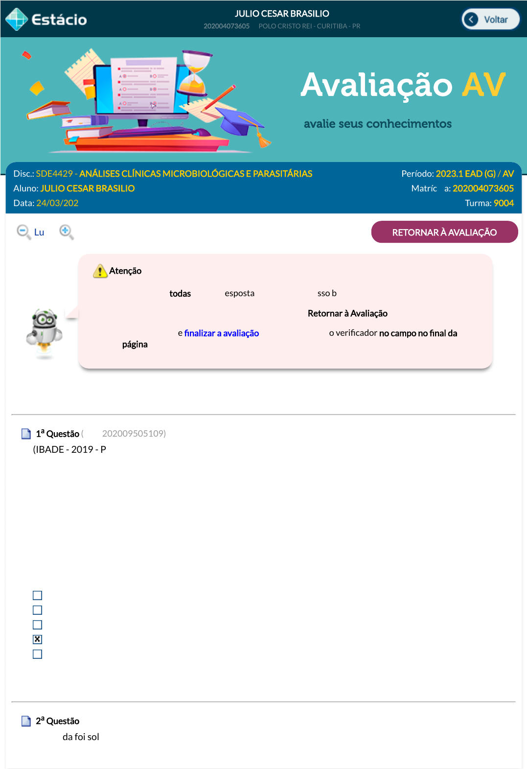 2. Caso você queira voltar à prova clique no botão "Retornar à Avaliação".