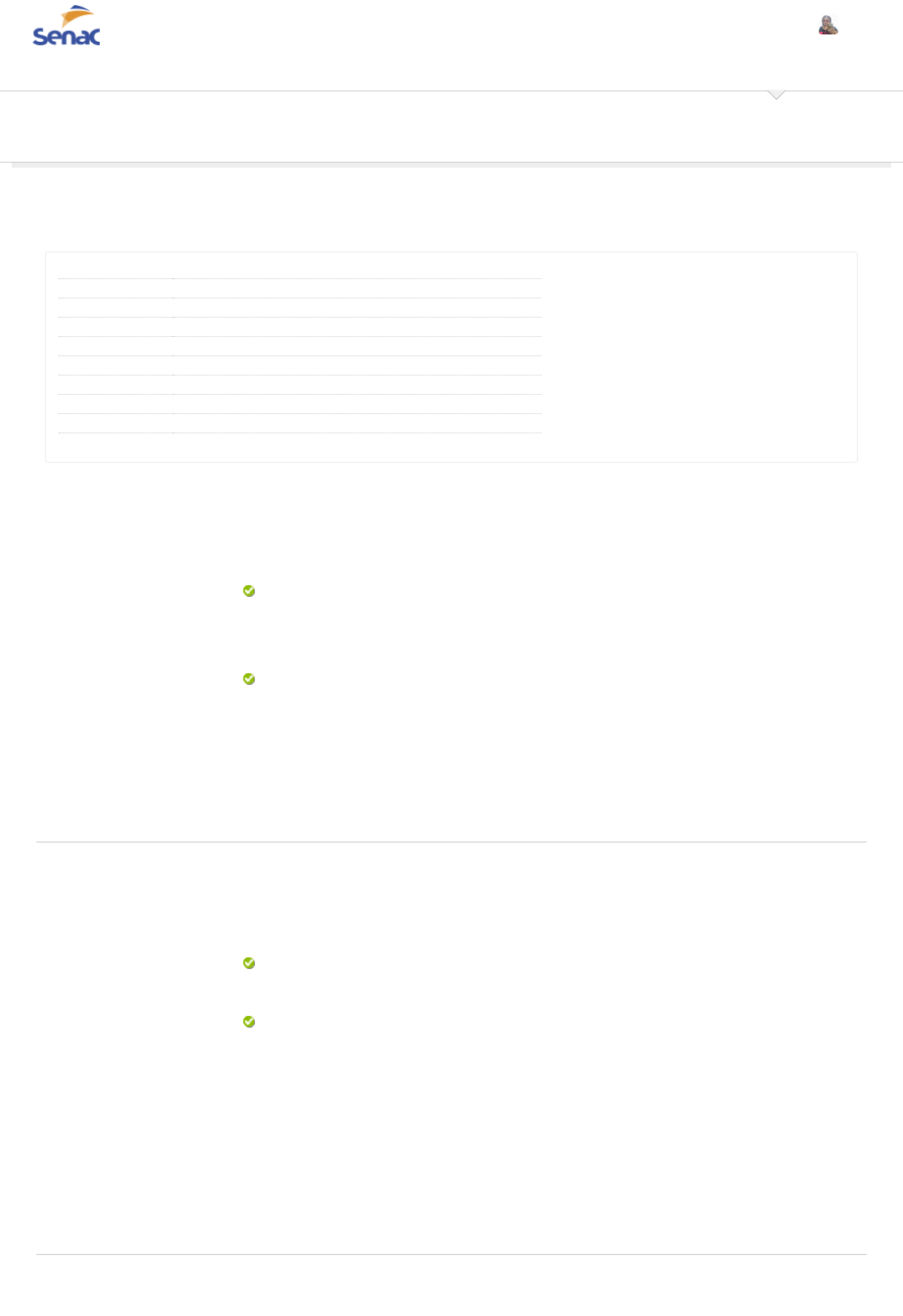 20/09/23, 18:24 Revisar envio do teste: Clique aqui para iniciar o Quiz &ndash... https://senacsp.blackboard.com/webapps/assessment/review/review.jsp?attempt_id=_33171820_1&course_id=_219531_1&content_id=_989450… 1/4 Revisar envio do teste: Clique aqui para iniciar o QuizSP_GRAD_695393_2303_01 2303-WEB STANDARDS Quiz REVISAR ENVIO DO TESTE: CLIQUE AQUI PARA INICIAR O QUIZ Usuário MARI CRISTINA DE OLIVEIRA Curso 2303-WEB STANDARDS Teste Clique aqui para iniciar o Quiz Iniciado 31/08/23 10:33 Enviado 20/09/23 18:24 Data de vencimento 27/09/23 23:59 Status Completada Resultado da tentativa 10 em 10 pontos Tempo decorrido 487 horas, 50 minutos Resultados exibidos Todas as respostas, Respostas enviadas, Respostas corretas, Comentários Pergunta 1 Resposta Selecionada: Respostas: Comentário da resposta: Na linguagem HTML, existem muitos recursos que servem para situações que vão além de, simplesmente, criar páginas web. É o caso de metas tags para padronização de caracteres, ou de acessibilidade, ou para permitir que robôs de busca possam ler o conteúdo. No caso do atributo alt , é correto afirmar que sua função é: Permitir que programas de leitura de tela possam narrar o contexto da imagem. Evitar conflitos de caracteres internacionais. Fazer os robôs de busca posicionarem o site na primeira página. Permitir que programas de leitura de tela possam narrar o contexto da imagem. Permitir que os links saibam qual página deve ser aberta. Facilitar a visualização do site em dispositivos mobile, sem distorção do layout. Resposta correta: c. Permitir que programas de leitura de tela possam narrar o contexto da imagem. Aplica�vos leitores de tela podem ler a descrição inserida no atributo alt. Isso ajuda pessoas com deficiência visual a terem uma ideia do que contém a imagem exibida. Pergunta 2 Resposta Selecionada: Respostas: Comentário da resposta: O formulário foi a primeira experiência de interatividade que o usuário teve na Web. Porém, muitos o confundem achando que ele processa as informações, mas ele apenas as envia. Qual alternativa não representa a função de um formulário? Enviar dados de usuário direto para o banco de dados. Enviar mensagem para outra página. Enviar dados de usuário direto para o banco de dados. Enviar dados de login para outra página. Enviar dados de pesquisa para outra página. Enviar dados de cadastro para outra página. Resposta correta: b. Enviar dados de usuário direto para o banco de dados. É importante lembrar que os dados são enviados para uma página, mas ela precisa saber o que fazer com os dados. Ou seja, é preciso ter uma linguagem que consiga pegar os dados, manipulá-los ou armazená-los. Pergunta 3 Sala de Aula Tutoriais 1 em 1 pontos 1 em 1 pontos 1 em 1 pontos MARI CRISTINA DE OLIVEIRA 64 https://senacsp.blackboard.com/webapps/blackboard/execute/courseMain?course_id=_219531_1 https://senacsp.blackboard.com/webapps/blackboard/content/listContent.jsp?course_id=_219531_1&content_id=_9894489_1&mode=reset https://www.ead.senac.br/ https://senacsp.blackboard.com/webapps/portal/execute/tabs/tabAction?tab_tab_group_id=_260_1 https://senacsp.blackboard.com/webapps/portal/execute/tabs/tabAction?tab_tab_group_id=_210_1 https://senacsp.blackboard.com/webapps/login/?action=logout 20/09/23, 18:24 Revisar envio do teste: Clique aqui para iniciar o Quiz &ndash... https://senacsp.blackboard.com/webapps/assessment/review/review.jsp?attempt_id=_33171820_1&course_id=_219531_1&content_id=_989450… 2/4 Resposta Selecionada: Respostas: Comentário da resposta: No início da Web, muitas siglas surgiram. Algumas sendo abreviações do nome de redes, ou de linguagens, ou de parcerias entre empresas. No caso da sigla HTML, você sabe dizer o que ela é? É a linguagem de marcação criada para a World Wide Web. É o nome do protocolo de acesso da Web. É a identificação de um site. É o nome do primeiro navegador criado. É a linguagem de marcação criada para a World Wide Web. É o nome do conglomerado de empresas criado para regulamentar os web standards. Resposta correta: d. É a linguagem de marcação criada para a World Wide Web. O HTML é a principal linguagem da Web, que u�liza marcação (conhecida como tag) para a publicação de conteúdo (texto, imagens, vídeos, áudio etc.) na web, e seu criador foi Tim Berners-Lee. Pergunta 4 Resposta Selecionada: Respostas: Comentário da resposta: À medida que os desenvolvedores e empresas de software vão aderindo ao conceito de web standars, a linguagem CSS passa a se popularizar. A linguagem CSS só funciona com HTML e tem uma função bem definida, que é: Indicar como o HTML deve ser exibido no navegador. Indicar como o HTML deve ser exibido no navegador. Indicar como o HTML deve reagir de acordo com o comportamento do usuário. Servir para gerar interatividade do conteúdo com o usuário. Servir para gerar recursos de acessibilidade. Servir para deixar as tags semânticas. Resposta correta: a. Indicar como o HTML deve ser exibido no navegador. O CSS (Cascate Style Sheet, tradução: folha de es�lo em cascata) é a linguagem que descreve como o HTML deve ser exibido no navegador. Pergunta 5 Resposta Selecionada: Respostas: Comentário da resposta: Existem recursos de acessibilidade muito importantes que estão presentes no HTML. Uma pessoa com deficiência visual, utilizando um leitor de tela, pode ouvir o software narrando o texto, indicando que está na posição de um determinado campo. E então, bastará ela teclar Enter para que o cursor seja transferido para dentro do campo e ela possa preenchê-lo. Qual tag possui esse recurso de acessibilidade? <label> <input> <select> <form> <label> <button> Resposta correta: d. <label> Essa tag é u�lizada por leitores de tela para indicar ao usuário com deficiência visual qual o campo onde o foco está no momento. Com isso, ao teclar Enter, o foco vai para dentro do campo. Pergunta 6 Resposta Selecionada: Respostas: Quando