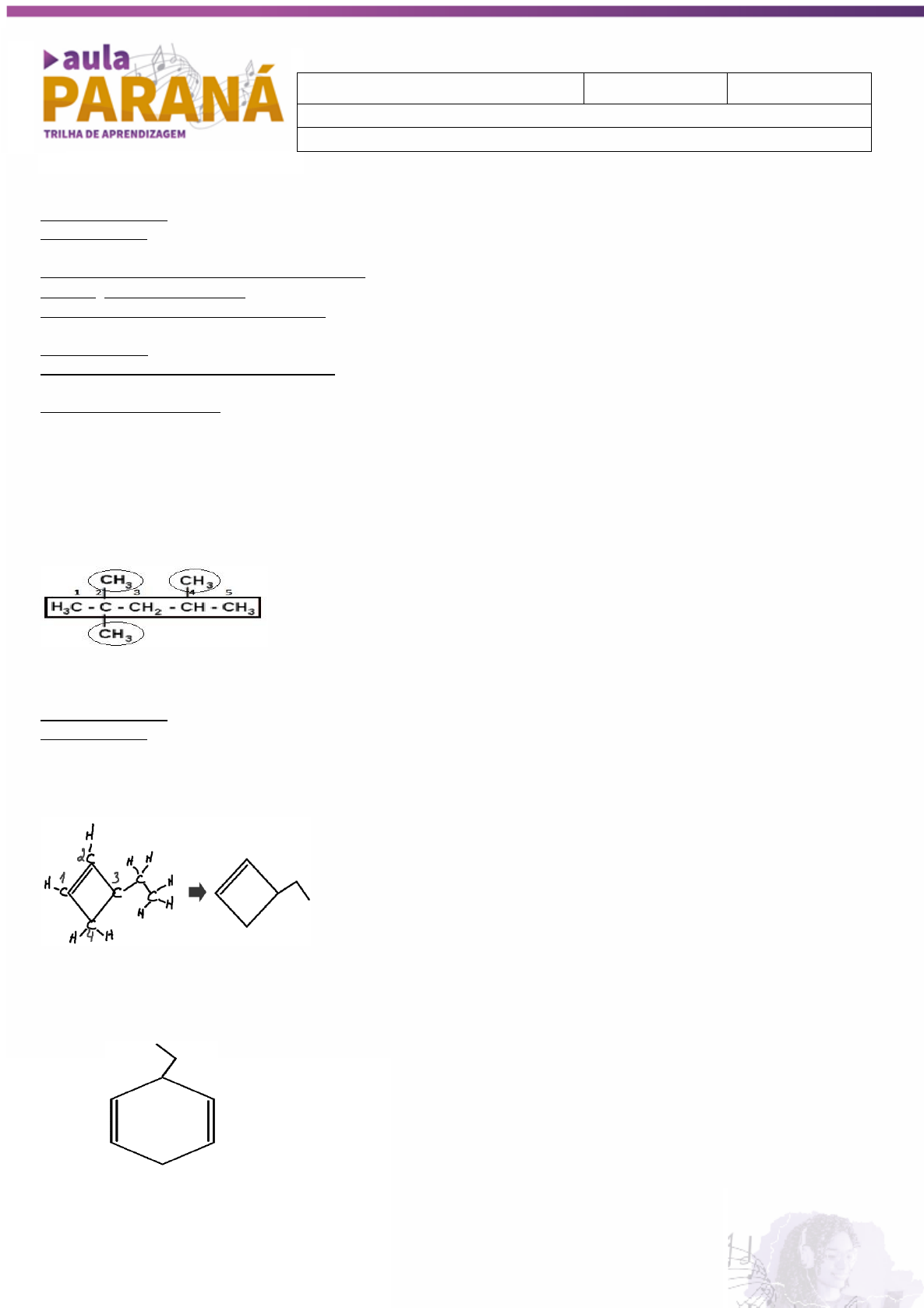 Olá, estudante! Para ajudar em seus estudos, você está recebendo o resumo dos conteúdos das aulas 12 e 13. Bons Estudos! AULA 12 – HIDROCARBONETOS DE CADEIA CARBÔNICA NORMAL E RAMIFICADA Cadeias carbônicas: propriedade que o átomo de carbono possui em formas variadas estruturas ligando a si mesmo infinitamente. Hidrocarboneto: substância orgânica que apresenta apenas carbonos e hidrogênios. Os de cadeia normal e ramificada são classificados em: Alcanos, Alcenos, Alcinos e Alcadienos. Nomenclatura de hidrocarbonetos (relembrando): PREFIXO (Número de carbonos): 1C – MET; 2C – ET; 3C – PROP; 4C – BUT; 5C – PENT; 6C – HEX; 7C – HEPT; 8C – OCT; 9C – NON. INFIXO (Tipo de ligação entre os carbonos): AN – LIGAÇÃO SIMPLES; EN – LIGAÇÃO DUPLA; IN – LIGAÇÃO TRIPLA; DIEN – DUAS DUPLAS; DIIN – DUAS TRIPLAS. SUFIXO (Função): HIDROCARBONETOS - O. Principais Radicais livres da química orgânica: metil(a): CH3- / etil(a): CH3-CH2- / propil(a): CH3-CH2-CH2- / butil(a): CH3-CH2-CH2-CH2-. Como fazer a nomenclatura: 1º) Determinar a cadeia principal: aquela que contém o maior número de carbonos, se houver insaturação (ligação dupla ou tripla) deve fazer parte desta cadeia. 2º) Determinar os radicais livres. 3º) Numerar os carbonos da cadeia principal, de modo que sejam atribuídos os menores números possíveis para os radicais. Caso haja insaturação, a numeração deve começar pela proximidade dela. 4º) Determinar o nome da cadeia carbônica, na ordem: numeração dos radicais + nome dos radicais + prefixo + infixo + sufixo. Exemplo: 1º) cadeia principal = 5 carbonos (PENT) 2º) ligação simples = AN 3º) hidrocarboneto: O 4º) três radicais metil (carbonos 2,2 e 4) 5º) nome: 2,2,4-trimetil-pentano AULA 13 – HIDROCARBONETOS DE CADEIA FECHADA E AROMÁTICA Cadeias carbônicas: propriedade que o átomo de carbono possui em formas variadas estruturas ligando a si mesmo infinitamente. Hidrocarboneto: substância orgânica que apresenta apenas carbonos e hidrogênios. Os de cadeia normal e ramificada são classificados em: Aromáticos e Alicíclicos. Para nomenclatura de compostos aliciclicos, as regras permanecem com a adição da palavra CICLO antes da cadeia principal. Exemplo: 1º) cadeia principal (ciclo) = 4 carbonos (BUT) 2º) uma ligação dupla = EN 3º) hidrocarboneto: O 4º) radical etil (carbono 3) 5º) nome: 3-etil-ciclobuteno EXERCÍCIO 01. Observe a estrutura ao lado de uma substância química líquida e incolor. a) Escreva seu nome seguindo as regras da IUPAC; b) Classifique sua cadeia carbônica; c) Dê o número de carbonos primários, secundários, terciários e quaternários nela contida e; d) Dê sua fórmula molecular. QUÍMICA 3ª Série SEMANA 8 ESCOLA/COLÉGIO: ESTUDANTE: