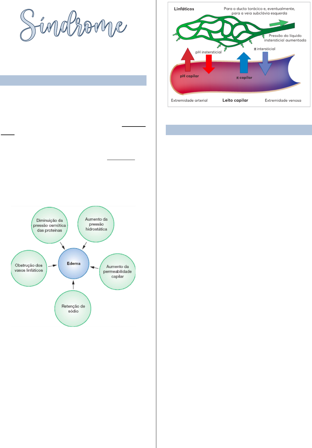 João Manuel – Medicina Nove de Julho EDEMATOSA FISIOPATOLOGIA Síndrome: Conjunto de sinais e sintomas que de/inem uma condição. Edema: Acúmulo de lıq́uido no espaço intersti- cial. O principal motivo para ocorre o Transu- dato (lıq́uido com pequenas proteıńas), é um desiquilíbrio nas forcas de Starling, pois, as- sim, permite saıd́a de lıq́uido com pequenas pro- teıńas de baixo peso. Para ocorre o Exsudato (lı-́ quido com grandes proteıńas) precisa ter uma vasodilatação da parede sanguıńeas para as grande células de proteıńa (albumina, /ibrina) conseguiram sair, isso acontece por conta das células infamatórias. Os dois principais causadores de edema são au- mento da pressão hidrostática (ph) e diminui- ção da pressão osmótica (π). Albumina resulta na mobilização do líquido do edema de volta para a circulação sanguínea, possibilitando que seja excretado pelos rins. Edema é de/inido como o aumento do /luido in- tersticial, que pode ser localizado ou generali- zado. O edema localizado é restrito a um seg- mento do corpo; edema generalizado, que é cha- mado de anasarca, é ocasionado por causas sis- têmicas, como insu/iciência cardıáca, cirrose e sıńdrome nefrótica. PROPEDÊUTICA A investigação semiológica do edema tem inıćio na anamnese. Na história clıńica deve-se avaliar o tempo de instalação e de duração, a localização e se houve ganho recente de peso. Além disso, é fundamental atentar para os antecedentes pes- soais, medicações em uso, histórico de alergia medicamentosa e hábitos e vıćios. Na suspeita de anasarca é fundamental realizar a aferição do peso corporal. No exame <ísico completa-se, investigando-se os seguinte parâmetros: Localização e distribuição: O edema pode ser generalizado (anasarca), o que favorece a formação de derrames cavitários, ou locali- zado: periorbitário, labial, pulmonar, escrotal, pré-sacral (mais comum em pacientes acama- dos) e de membros (superior ou inferior). Intensidade: Classi/icada subjetivamente escala de cruzes, variando de + (edema de pe- quena intensidade) a ++++ (edema de intensi- dade máxima). Estabelecer o grau do edema de- penderá da experiência do examinador. A inten- sidade pode ser medida objetivamente de duas formas: • Anasarca pode ser realizada a aferi- ção diária do peso. • Localizados de membros, pode-se medir a circunferência do membro edemaciado e compará-la com o membro contralateral. Consistência: ER o grau de resistência en- contrado ao comprimir a região edemaciada. A mesma manobra utilizada para avaliar a João Manuel – Medicina Nove de Julho compressibilidade permite a avaliação da con- sistência. • Mole: Facilmente depressível. Traduz re- tenção hıd́rica recente (o tecido celular subcutâneo está in/iltrado por água). • Duro: Mais resistente à formação do ca- cifo. Traduz edema de longa duração (o tecido celular subcutâneo encontra-se in/iltrado por proliferação /ibroblástica). Sinal de Godet (cacifo positivo): Compressão contra uma estrutura óssea, mas como ser no membros inferiores, deixa por um tempo, de- pois tira. • Edema não compressıv́el: linfedema, mi- xedema (comum aparecer em estado avançando hipotireoidismo) e lipedema. Elasticidade: Se, ao realizar o teste da com- pressibilidade, a pele retornar rapidamente à posição original, diz-se que o edema é elástico. Se a pele demorar a retornar, /icando deprimida por mais tempo, diz-se que é inelástico. Temperatura: É importante comparar a área edemaciada com área sadia, e para tanto se pode utilizar o dorso da mão dominante do exa- minador. Pele quente indica edema de origem inflamatória, e pele fria pode indicar insufici- ência arterial. Sensibilidade: Para essa avaliação, utiliza- se também a manobra da compressibilidade. Se o paciente sentir dor à digitopressão, diz-se que o edema é doloroso, o que traduz edema de ori- gem in/lamatória. Se não ocorrer dor, é indolor. Outras alterações: • Associação com derrames cavitários: A situação em que ocorre acúmulo de lı-́ quido nas cavidades serosas (pleura, pe- ricárdio e peritônio) denomina-se derra- mes cavitários, a saber: derrame pleural, derrame pericárdico e ascite. Sua ocor- rência é comum quando há anasarca. PRINCIPAIS CAUSAS Edema Generalizado A presença de edema generalizado sugere enfer- midade sistêmica. O ganho de peso é uma alte- ração que deve ser pesquisada nesses casos. As principais causas de anasarca são de origem re- nal, cardíaca e hepática. Causas raras: desnutri- ção proteica grave e enteropatia perdedora de proteínas. Renal: A designação de edema renal pode abar- car as seguintes causas: síndrome nefrótica, sín- drome nefrítica e doença renal crônica em fase avançada. O achado semiológico comum (inde- pendentemente da causa do edema renal) é ana- sarca, com edema de face pronunciado (prin- cipalmente periorbitário), pior pela manhã (ao acordar). • Síndrome nefrótica: O edema é intenso, podendo levar a fácies nefrótica (olhar “em fenda” decorrente de edema bipal- pebral bilateral), e com frequência há derrames cavitários. Além disso, o paci- ente pode relatar urina espumosa (ocasi- onada pela alta concentração de proteí- nas). A sua /isiopatologia é por uma hi- poalbuminemia (diminuição da π) em razão da proteinúria intensa (> 3,5 g/24 horas) e do hiperaldosteronismo secundário, levando à retenção de sódio e água (aumento da ph). João Manuel – Medicina Nove de Julho • Síndrome Nefrítica: o edema é menos pronunciado, há hipertensão arterial sis- têmica e hematúria (micro ou macros- cópica). Além da retenção de sódio e água por desequilíbrio glomerolotu- bular, há aumento da permeabilidade capilar. • Doença Renal Crônica Avançada: Co- mum observar o descoramento de mu- cosas (ocasionado pela anemia, que é muito frequente), além ser possível sen- 