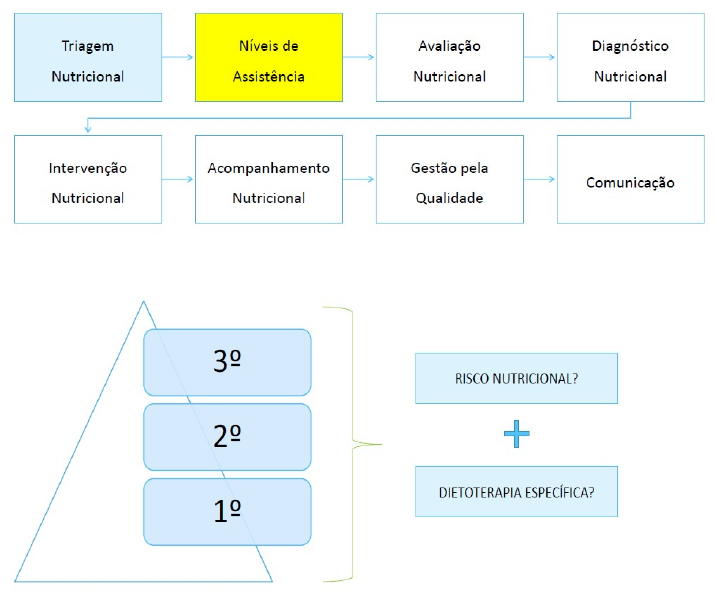 AVALIAÇÃO NUTRICIONAL BIOQUIMICA E CLINICA Níveis de Assistência em Nutrição e Diagnóstico Nutricional SISTEMATIZAÇÃO DO CUIDADO EM NUTRIÇÃO - Compreendem a categorização dos procedimentos realizados, de acordo com o grau de complexidade das ações do nutricionista, executadas no atendimento ao paciente em ambiente hospitalar ou ambulatorial. ESQUEMA CONCEITUAL NIVEIS DE ASSISTÊNCIA EM NUTRIÇÃO Critérios: · Triagem. · Dieta especifica. NIVEL DE ASSISTÊNCIA PRIMÁRIO · SEM RISCO NUTRICIONAL + SEM DIETA ESPECÍFICA = 1º PRIMÁRIO. EX: Paciente se hospitalizou devido a um acidente de moto e quebrou o braço. BAIXA COMPLEXIDADE Ações propostas em nível hospitalar/internação: · Visita admissional em 24 horas. · Avaliação do estado nutricional e diagnóstico de nutrição. · Verificação da prescrição médica. · Planejamento dietético após análise da prescrição médica. · Registro do atendimento em prontuário. · Retorno em até 1 semana (7 dias). · Aferição de peso a cada 15 dias. Ações propostas em nível ambulatorial · Orientação nutricional sobre alimentação saudável. · Registro do atendimento em prontuário. · Alta da nutrição. NÍVEL DE ASSISTÊNCIA SECUNDÁRIO · SEM RISCO NUTRICIONAL + COM DIETA ESPECÍFICA = 2º SECUNDÁRIO. · COM RISCO NUTRICIONAL + SEM DIETA ESPECÍFICA = 2º SECUNDÁRIO. MÉDIA COMPLEXIDADE Ações propostas em nível hospitalar/internação · Visita admissional em 24 horas. · Avaliação do estado nutricional e diagnóstico de nutrição a cada 10 dias. · Verificação da prescrição médica. · Planejamento dietético após análise de prescrição médica. · Evolução clinica e nutricional. · Orientação nutricional durante a internação. · Orientação nutricional na alta hospitalar. · Registro do atendimento em prontuário. · Retorno em até 96 horas (4 dias). Ações propostas nível ambulatorial · Anamnese e elaboração do diagnóstico de nutrição. · Orientação nutricional com base no diagnóstico de nutrição. · Registro do atendimento em prontuário. · Programação do retorno em alta da nutrição. NÍVEL DE ASSISTÊNCIA TERCIÁRIO · COM RISCO NUTRICIONAL + COM DIETA ESPECÍFICO = 3º TERCIÁRIO. Ações propostas em nível hospitalar/internação · Visita admissional em 24 horas. · Visita diária. · Avaliação do estado nutricional e diagnóstico de nutrição a cada 7 dias. · Verificação da prescrição médica. · Planejamento dietético após análise da prescrição médica. · Evolução clínica e nutricional. · Orientação nutricional durante a internação. · Orientação nutricional na alta hospitalar. · Registro do atendimento em prontuário. · Registro em até 72 horas (3 dias). Ações propostas em nivel ambulatorial · Anamnese e elaboração do diagnóstico de nutrição. · Orientação com base no diagnóstico de nutrição. · Encaminhamento para atendimento em grupo (de nutrição e/ou multiprofissional) ou individual de acordo com os critérios estabelecidos. · Acompanhamento de acordo com a evolução, verificação das dúvidas junto ao paciente e reforço das orientações. · Registro do atendimento em prontuário. · Programação do retorno ou alta de nutrição. · Prognóstico do diagnóstico = Facilitar a demonstração de resultados. PADRONIZAÇÃO DE DIAGNÓSTICO NUTRICIONAL - Elaboração pela Academy Of Nutrition and Diabetics (AND) Padronização Internacional. Vantagens · Auxilia e descrever mais claramente os problemas observados, intervenções realizadas e seus resultados. · Assegurar qualidade do cuidado de nutrição. · Otimizar o estabelecimento de prioridades no planejamento da intervenção nutricional. · Melhorar visibilidade do nutricionista. CONCEITO DO DIAGNÓSTICO EM NUTRIÇÃO - Identificação de um problema existente, relacionado à nutrição. Todo diagnóstico de nutrição deve ter possibilidade de ser resolvido ou minimizado, a partir da intervenção. DOMINIOS DO DIAGNÓSTICO EM NUTRIÇÃO INGESTÃO · Problemas relacionados à ingestão de energia, nutrientes, líquidos e substancias bioativas por via oral, sonda e parenteral. · Excesso ou deficiência na ingestão de um alimento ou nutriente, comparado as necessidades reais ou estimadas. NUTRIÇÃO CLÍNICA · Achados/problemas nutricionais identificados, relacionados à condições clínicas ou físicas. COMPORTAMENTO/AMBIENTE NUTRICIONAL · Achados/problemas nutricionais identificados, relacionados ao conhecimento, atitudes/crenças, ambiente físico, acesso aos alimentos ou segurança alimentar. MÉTODO PEI · P Problema. · E Etiologia. · I Indicador. Ex: Ingestão insuficiente de energia associada a má dentição, conforme evidenciada pelo relato do paciente, exame físico e perda de peso no último mês. EXEMPLOS