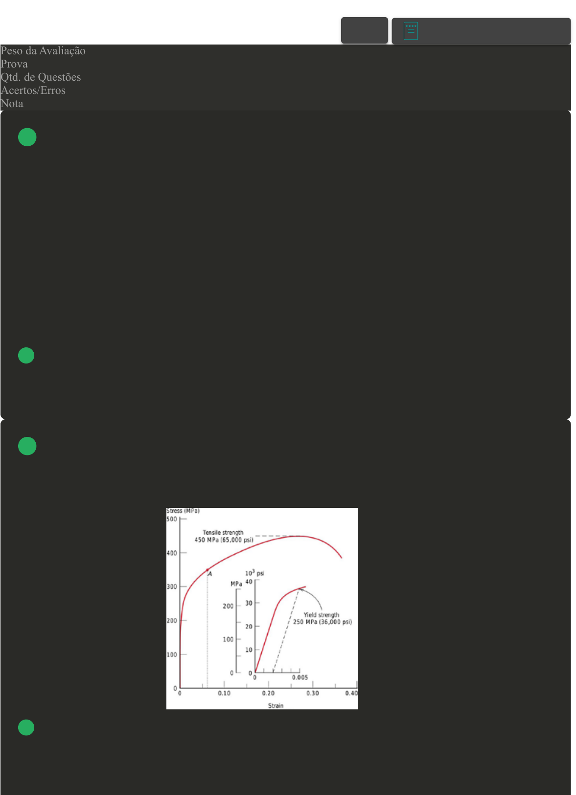 Prova Impressa GABARITO | Avaliação I - Individual (Cod.:885824) Peso da Avaliação 1,50 Prova 68467589 Qtd. de Questões 10 Acertos/Erros 10/0 Nota 10,00 Associamos a resistência de um material de acordo com a sua capacidade de suportar uma carga sem deformação excessiva ou ruptura. Consideramos essa resistência como uma propriedade inerente ao próprio material que pode ser determinada por métodos experimentais. Sobre as principais propriedades dos materiais obtidas através de ensaio, analise as sentenças a seguir: I- Ductilidade é a propriedade do material segundo a qual a deformação que ocorre em função da aplicação de tensão desaparece quando esta tensão é cessada. II- Elasticidade é a propriedade do material sofrer deformação permanente sem se romper. III- Resiliência é a capacidade de absorção de energia no regime elástico. Assinale a alternativa CORRETA: A Somente a sentença II está correta. B As sentenças II e III estão corretas. C Somente a sentença III está correta. D As sentenças I e III estão corretas. A diagrama tensão x deformação do latão (liga de cobre e zinco) é apresentado na figura em anexo. A partir dessa curva tensão deformação, qual a carga máxima, em kN, que pode ser suportada por um corpo de prova cilíndrico de 12,8 mm de diâmetro, assinale a alternativa CORRETA: FONTE: CALLISTER, William D.; RETHWISCH, David G. Materials science and engineering: an introduction. New York: Wiley, 2018. p. 165. A 57,9. B 231,6. C VOLTAR A+ Alterar modo de visualização 1 2 450. D 250. Muitos materiais apresentam comportamentos distintos quando sujeitos a esforços mecânicos. Dependendo da intensidade do carregamento, poderá apresentar um comportamento linear ou não. Com base no exposto, classifique V para as sentenças verdadeiras e F para as falsas: ( ) Durante o comportamento elástico de um material que recebe um carregamento, este resulta em deformação, mas que quando é retirada essa carga o material retorna ao seu estado inicial. ( ) Quando o material recebe um segundo carregamento, após uma deformação plástica, o seu limite elástico apresentará valores menores ao inicial. ( ) Se o material atingir o escoamento e a carga for retirada, sofrerá uma deformação permanente, mesmo após a retirada da carga aplicada. Assinale a alternativa que apresenta a sequência CORRETA: A V - F - V. B F - F - V. C V - V - F. D F - V - V. O conhecimento das propriedades mecânicas é vital para que um engenheiro, ou profissional especializado, possa tomar a decisão acertada a respeito dos materiais utilizados em um determinado projeto. Neste contexto, analisando o gráfico em anexo, assinale a alternativa CORRETA: FONTE: SHACKELFORD, James F. Introduction to materials science for engineers. Upper Saddle River: Pearson, 2016. p. 155. A Os números 2 e 3 são, respectivamente, a tensão máxima e a tensão de ruptura. B O número 1 é conhecido como limite de proporcionalidade. C O número 4 diz respeito à ductibilidade do material. D O número 5 representa a resiliência do material. 3 4 Com a execução de ensaios mecânicos em materiais podemos determinar diversas de suas propriedades. Com relação às propriedades mecânicas, podemos destacar a resistência mecânica, a ductilidade, a tenacidade e a resiliência. Com base na resiliência, assinale a alternativa CORRETA: A É a quantidade de trabalho realizado em uma solicitação que irá levar o material à fratura. B É capacidade do material de absorver energia de deformação antes da fratura. C Trata-se da capacidade de um material em sofrer deformação permanente quando submetido a um esforço mecânico. D É a capacidade que um material tem de sofrer uma deformação não permanente. Cada material apresenta propriedades mecânicas distintas. Conforme certas características mecânicas de cada material, este pode ser classificado como dúctil ou frágil. Sobre as propriedades mecânicas dos materiais, associe os itens, utilizando o código a seguir: I- Ductilidade. II- Resiliência. III- Tenacidade. ( ) Capacidade que o material tem de absorver energia durante o regime de deformação exclusivamente elástica ( ) Capacidade que o material tem de apresentar grandes deformações antes da ruptura ( ) Quantidade de energia que um material pode absorver antes de fraturar, compreendendo o regime elástico e plástico Assinale a alternativa que apresenta a sequência CORRETA: A III - II - I. B I - II - III. C II - III - I. D II - I - III. O conhecimento das propriedades mecânicas é fundamental em qualquer projeto desta natureza. Sabendo que as principais características mecânicas dos materiais são resiliência, tenacidade, ductibilidade e fragilidade, analise as sentenças a seguir: I- Ductibilidade: é a capacidade de um material ser submetido a grandes deformações antes da ruptura. II- Fragilidade: está relacionada a materiais que se rompem antes de se deformarem plasticamente. III- Resiliência: pode ser definida como a resistência aos choques, ou seja, a capacidade de absorver energia mecânica durante um choque sem se deformar plasticamente. IV- Tenacidade: é a média da quantidade de energia que um material pode absorver antes de faturar. Assinale a alternativa CORRETA: A As sentenças I, II, III e IV estão corretas. B Somente a sentença III está correta. C Somente a sentença I está correta. 5 6 7 D Somente a sentença II está correta. Considere dois materiais distintos, denominados "X" e "Y", cujas curvas de tensão vs. deformação estão demonstradas na figura. Sobre as características desses materiais, analise as sentenças a seguir: I- O material Y apresenta maior resistência mecânica que o material X. II- O material X apresenta menor tenacidade do que o material Y. III- O material X tem maior ductilidade do que o material Y. Assinale a alternativa CORRETA: A As sentenças I e II estão corretas. B Somente a sentença II está correta. C As senten
