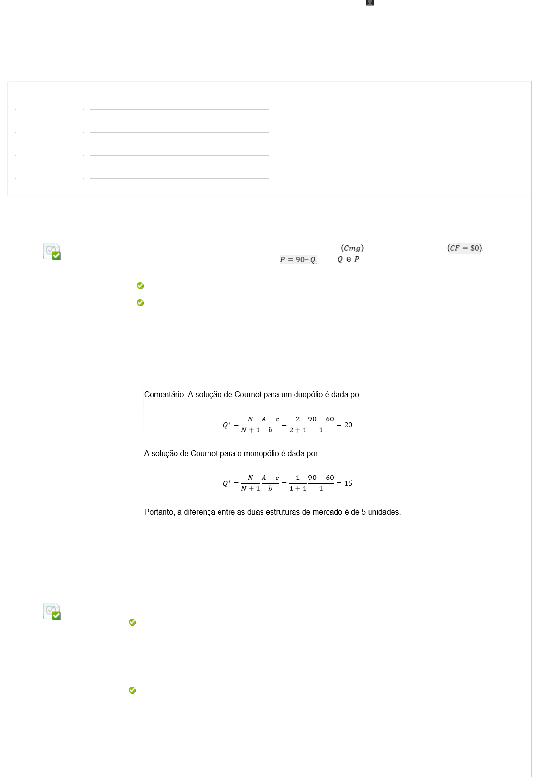Revisar envio do teste: QUESTIONÁRIO UNIDADE IORGANIZAÇÃO INDUSTRIAL/REGULAÇÃO DA CONCORRÊNCIA 6841-30_58702_R_E1_20232 CONTEÚDO Usuário Curso Teste Iniciado Enviado Status ORGANIZAÇÃO INDUSTRIAL/REGULAÇÃO DA CONCORRÊNCIA QUESTIONÁRIO UNIDADE I 21/09/23 09:34 21/09/23 10:38 Completada Resultado da tentativa 5 em 5 pontos Tempo decorrido 1 hora, 3 minutos Resultados exibidos Todas as respostas, Respostas enviadas, Respostas corretas, Comentários, Perguntas respondidas incorretamente Pergunta 1 Resposta Selecionada: a. Respostas: a. b. c. d. e. Comentário da resposta: As �rmas de uma indústria possuem a mesma estrutura de custo, em que o custo marginal é $60 e o custo �xo é nulo . A demanda de mercado pelo produto dessa indústria é representada por , onde representam a quantidade e o preço de mercado. Nestas condições, a diferença da produção total da indústria entre um duopólio de Cournot e um regime de monopólio será igual a: 5 unidades. 5 unidades. 10 unidades. 20 unidades. 100 unidades. Zero unidade. Resposta: A Pergunta 2 Resposta Selecionada: b. Respostas: a. b. c. d. Com relação a uma situação de monopólio, é correto a�rmar que: Seja por estratégia própria da empresa para maximizar o lucro temporariamente, seja por imposição legal, a �rma monopolista pode ter prejuízo no curto prazo. O monopolista difere das outras �rmas, pois não tem sua quantidade de equilíbrio maximizada quando o custo marginal se iguala à receita marginal. Seja por estratégia própria da empresa para maximizar o lucro temporariamente, seja por imposição legal, a �rma monopolista pode ter prejuízo no curto prazo. A relação entre o preço praticado pelo monopolista e o seu custo marginal independe da elasticidade da demanda. A prática de discriminação de preços é impossível para uma �rma monopolista. UNIP EAD BIBLIOTECAS MURAL DO ALUNO TUTORIAISCONTEÚDOS ACADÊMICOS 0,5 em 0,5 pontos 0,5 em 0,5 pontos http://company.blackboard.com/ https://ava.ead.unip.br/webapps/blackboard/execute/courseMain?course_id=_313903_1 https://ava.ead.unip.br/webapps/blackboard/content/listContent.jsp?course_id=_313903_1&content_id=_3679914_1&mode=reset https://ava.ead.unip.br/webapps/portal/execute/tabs/tabAction?tab_tab_group_id=_10_1 https://ava.ead.unip.br/webapps/portal/execute/tabs/tabAction?tab_tab_group_id=_27_1 https://ava.ead.unip.br/webapps/portal/execute/tabs/tabAction?tab_tab_group_id=_47_1 https://ava.ead.unip.br/webapps/portal/execute/tabs/tabAction?tab_tab_group_id=_29_1 https://ava.ead.unip.br/webapps/portal/execute/tabs/tabAction?tab_tab_group_id=_25_1 https://ava.ead.unip.br/webapps/login/?action=logout e. Comentário da resposta: No longo prazo, a �rma monopolista pode operar com prejuízo, pois nenhuma outra �rma incumbente entrará em seu mercado. Resposta: B Comentário: Muitas vezes, a atividade monopolista ocorre em segmentos econômicos que não representam uma atratividade em termos de lucro para o proprietário da �rma. Nesses casos, seja por imposição legal ou por características da atividade econômica, o monopolista pode arcar com prejuízos de curto prazo que serão compensados, ao longo do tempo, por preços su�cientemente maiores que o custo variável médio. Pergunta 3 Resposta Selecionada: c. Respostas: a. b. c. d. e. Comentário da resposta: Considere duas �rmas que produzem um bem homogêneo e concorrem de acordo com o Modelo de Cournot. O equilíbrio de mercado resultante caracteriza-se por: Oferta total de produto maior do que ocorreria em monopólio. Lucro econômico zero. Lucro econômico igual ao de um monopolista. Oferta total de produto maior do que ocorreria em monopólio. Oferta total de produto maior do que sucederia em concorrência perfeita. Preço do produto igual ao que vigoraria em concorrência perfeita. Resposta: C Comentário: A solução de Cournot mostra que, quando duas �rmas concorrem entre si produzindo um bem homogêneo, as quantidades produzidas serão menores do que se produzidas em concorrência perfeita, mas serão maiores do que as produzidas por um monopolista. Pergunta 4 Resposta Selecionada: b. Respostas: a. b. c. d. e. Considere o quadro a seguir, referente às participações de diversas empresas nos mercados A e B, mais o Índice de Lerner : Participações de mercado das empresas integrantes dos mercados relevantes A e B (em percentual do faturamento) Assinale a alternativa verdadeira no que tange aos Índices de Lerner, C4 e ao IHH (Índice de Hirschman-Her�ndahl): A análise do IHH de ambos os mercados nos permite a�rmar que o mercado A é mais concentrado que o mercado B. A análise do índice C4 de ambos os mercados nos permite a�rmar que o mercado A é mais concentrado que o mercado B. A análise do IHH de ambos os mercados nos permite a�rmar que o mercado A é mais concentrado que o mercado B. O IHH apresenta um grande grau de informação sobre os mercados e requer um pequeno volume de informações para seu cálculo. O índice de Lerner é utilizado como medida do poder de mercado de determinada empresa no longo prazo. O índice de Lerner guarda relação direta com a elasticidade-preço da demanda. 0,5 em 0,5 pontos 0,5 em 0,5 pontos Comentário da resposta: Resposta: B Pergunta 5 Resposta Selecionada: e. Respostas: a. b. c. d. e. Comentário da resposta: De acordo com a Teoria Microeconômica, uma diferença básica entre uma �rma que opere em concorrência perfeita e um monopolista é: Não existindo barreiras à entrada, o concorrente perfeito obtém lucro normal. Já o monopolista, não permitindo a entrada de outros concorrentes no seu mercado, obtém um lucro extraordinário. A curva de demanda pelos produtos de concorrência perfeita é inelástica, enquanto que, no monopólio, a demanda é in�nitamente elástica. O monopolista, quando quer aumentar sua receita total, aumenta o preço. Já o concorrente perfeito, para aumentar a sua receita total, tem 