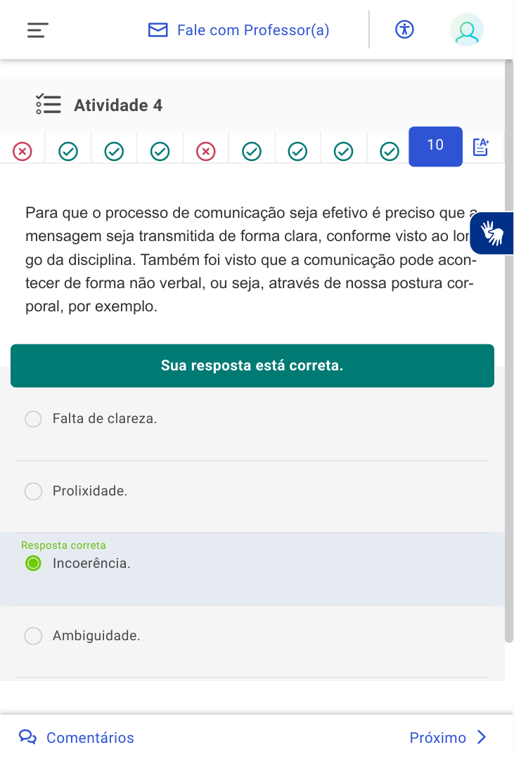 Atividade 4 Para que o processo de comunicação seja efetivo é preciso que a mensagem seja transmitida de forma clara, conforme visto ao lon- go da disciplina. Também foi visto que a comunicação pode acon- tecer de forma não verbal, ou seja, através de nossa postura cor- poral, por exemplo. Sua resposta está correta. Falta de clareza. Prolixidade. Incoerência. Resposta correta Ambiguidade. Desconhecimento do assunto. Próximo 10 Fale com Professor(a) Comentários