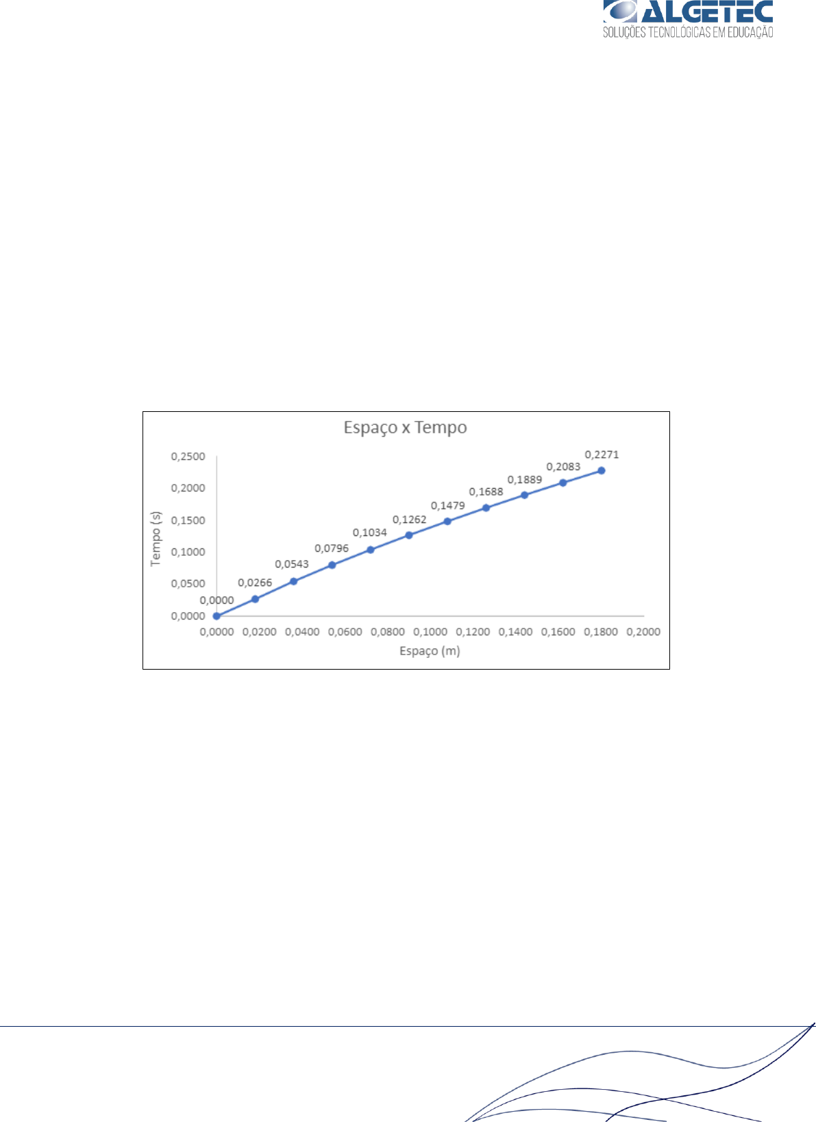 LABORATÓRIO DE FÍSICA MOVIMENTO RETILÍNEO UNIFORMEMENTE VARIADO - MRUV 1 ALGETEC – SOLUÇÕES TECNOLÓGICAS EM EDUCAÇÃO CEP: 40260-215 Fone: 71 3272-3504 E-mail: contato@algetec.com.br | Site: www.algetec.com.br AVALIAÇÃO DOS RESULTADOS 1. Construa o gráfico S x t (Espaço x Tempo). 2. Com base em seus conhecimentos, qual o tipo de função representada pelo gráfico “Espaço x Tempo”? Qual o significado do coeficiente angular (declividade da tangente) do gráfico construído? R: A função representada no gráfico significa a posição do objeto em relação ao tempo a partir da posição inicial. Neste caso, o coeficiente angular representa a distância do objeto em relação ao ponto 0, onde ainda está tendo movimentação e aceleração, o coeficiente angular representa a inclinação da reta em relação ao eixo das abcissas (x) mailto:contato@algetec.com.br http://www.algetec.com.br/ LABORATÓRIO DE FÍSICA MOVIMENTO RETILÍNEO UNIFORMEMENTE VARIADO - MRUV 2 ALGETEC – SOLUÇÕES TECNOLÓGICAS EM EDUCAÇÃO CEP: 40260-215 Fone: 71 3272-3504 E-mail: contato@algetec.com.br | Site: www.algetec.com.br 3. Construa o gráfico S x t2 (Espaço x Tempo2). 4. Com base em seus conhecimentos, qual o tipo de função representada pelo gráfico “Espaço x Tempo2”? Qual o significado do coeficiente angular do gráfico construído? É uma função de 2º grau, que apresenta a posição do objeto em r elação a pontos de tempo mais curtos, ou seja, mais próximo do t inicial (t= 0). O coeficiente angular apresenta o início do movimento e da aceleração do carrinho, também apresenta a posição da parábola, quando é positivo a parábola é voltada para cima. mailto:contato@algetec.com.br http://www.algetec.com.br/ LABORATÓRIO DE FÍSICA MOVIMENTO RETILÍNEO UNIFORMEMENTE VARIADO - MRUV 3 ALGETEC – SOLUÇÕES TECNOLÓGICAS EM EDUCAÇÃO CEP: 40260-215 Fone: 71 3272-3504 E-mail: contato@algetec.com.br | Site: www.algetec.com.br 5. Calcule as velocidades para os pontos medidos t2, t4, t6, t8 e t10 e anote em uma tabela semelhante à demonstrada a seguir. Utilize a fórmula vm(trecho) = ∆S para encontrar as velocidades. ∆t Onde: ∆S2 = S2 − S0; ∆t2 = t2 − t0 ∆S4 = S4 − S2; ∆t4 = t4 − t2 ∆S6 = S6 − S4; ∆t6 = t6 − t4 ∆S8 = S8 − S6; ∆t8 = t8 − t6 ∆S10 = S10 − S8; ∆t10 = t10 − t10 Intervalos vm (m/s) S0 a S2 0,6630 S2 a S4 0,7332 S4 a S6 0,8090 S6 a S8 0,8780 S8 a S10 0,9424 6. Construa o gráfico vm x t (velocidade x tempo). mailto:contato@algetec.com.br http://www.algetec.com.br/ LABORATÓRIO DE FÍSICA MOVIMENTO RETILÍNEO UNIFORMEMENTE VARIADO - MRUV 4 ALGETEC – SOLUÇÕES TECNOLÓGICAS EM EDUCAÇÃO CEP: 40260-215 Fone: 71 3272-3504 E-mail: contato@algetec.com.br | Site: www.algetec.com.br 7. Com base em seus conhecimentos, qual o tipo de função representada pelo gráfico “velocidade x tempo”? Qual o significado do coeficiente angular do gráfico construído? (Lembre-se que no MRUV, a velocidade é dada por v = vo + at) RESPOSTA: Representa a função da aceleração do móvel. mailto:contato@algetec.com.br http://www.algetec.com.br/ LABORATÓRIO DE FÍSICA MOVIMENTO RETILÍNEO UNIFORMEMENTE VARIADO - MRUV 5 ALGETEC – SOLUÇÕES TECNOLÓGICAS EM EDUCAÇÃO CEP: 40260-215 Fone: 71 3272-3504 E-mail: contato@algetec.com.br | Site: www.algetec.com.br 8. Qual a aceleração média deste movimento? α=limΔt->0=Δv/Δt αm=ΔV/Δt αm= 0,76/0,11 αm= 6,42 m/s² 9. Ainda utilizando o gráfico, encontre a velocidade inicial do carrinho no t0. Para isso, basta extrapolar o gráfico e verificar o valor da velocidade quando a curva “cruza” o eixo y. 10. Diante dos dados obtidos e dos gráficos construídos: 11. Monte a função horária do experimento. S = So + vo t + 1 a t2 2 Onde: • a = Aceleração (m/s²); • t = Tempo (s); • V0 = Velocidade inicial (Instante t0); • S0 = Posição inicial (lembre-se da marcação onde o sensor foi posicionado). RESPOSTA: S = 0,018+0,662 x 0,0266 + ½ 0,0266² mailto:contato@algetec.com.br http://www.algetec.com.br/ LABORATÓRIO DE FÍSICA MOVIMENTO RETILÍNEO UNIFORMEMENTE VARIADO - MRUV 6 ALGETEC – SOLUÇÕES TECNOLÓGICAS EM EDUCAÇÃO CEP: 40260-215 Fone: 71 3272-3504 E-mail: contato@algetec.com.br | Site: www.algetec.com.br 12. Por que é possível afirmar que esse movimento é uniformemente variado? É possível afirmar que este movimento é uniformemente variado, pois ocorre a variação de velocidade em intervalos iguais. Velocidade constante e diferente de zero 13. Faça o experimento com a inclinação de 20° e compare os resultados. Intervalos vm (m/s) S0 a S2 0,967 S2 a S4 1,153 S4 a S6 1,107 S6 a S8 1,204 S8 a S10 1,118 Adotando um ângulo de inclinação de 20° observa-se que o carrinho desce a uma variação de velocidade igual em intervalos de tempo iguais, no experimento também observou-se que o tempo decorrido no movi mento do carrinho é menor quando comparado com o ângulo de inclinação de 10°. mailto:contato@algetec.com.br http://www.algetec.com.br/