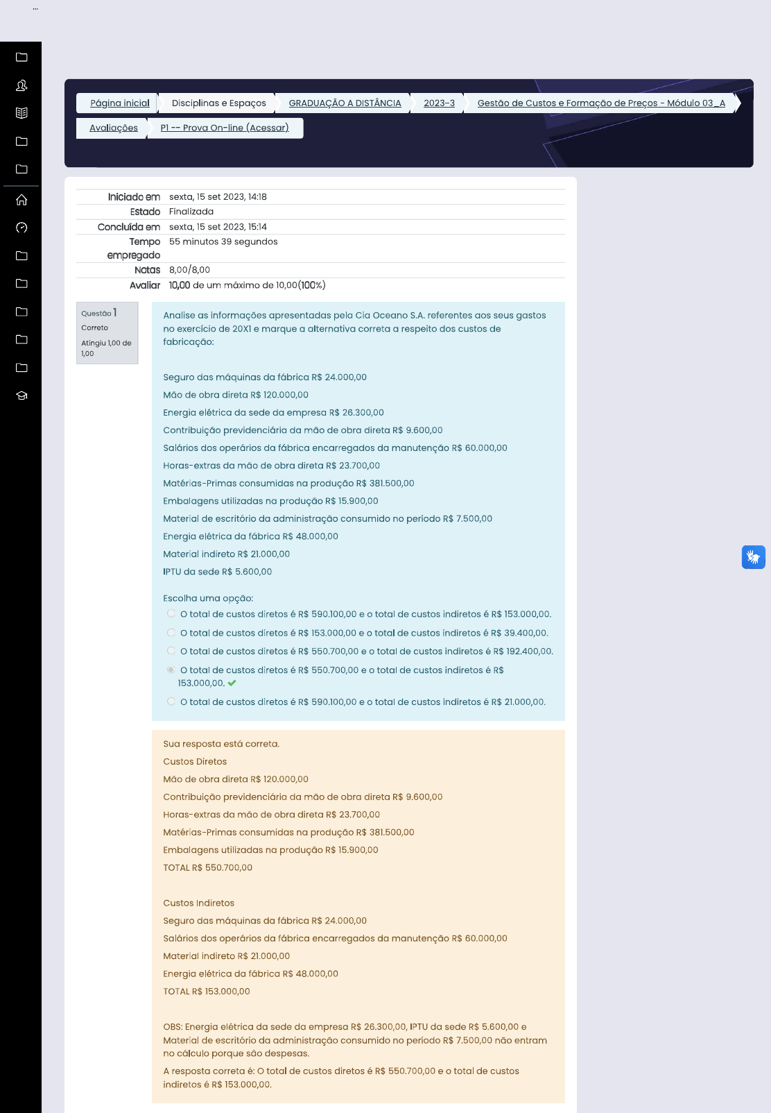 P1 Gestão de Custos e Formação de Preços - UCAM 2023.2