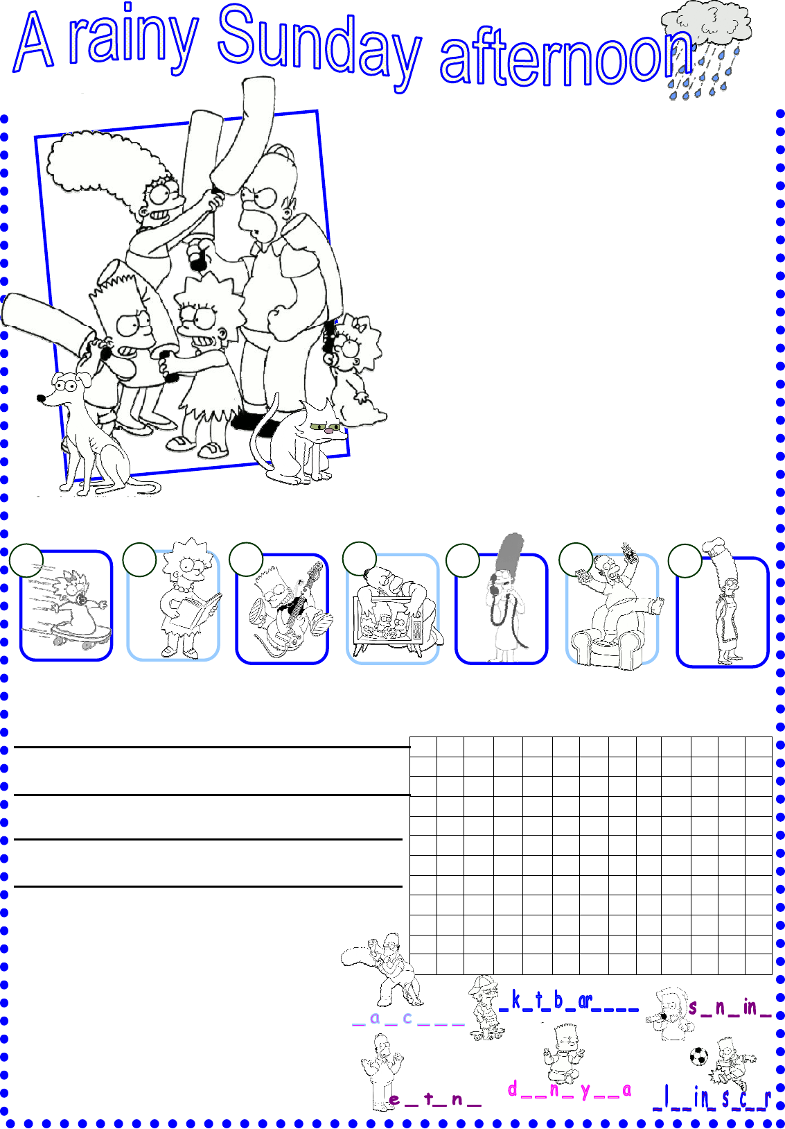 P L A Y I N G S O C C E R G N I D R A O B E T A K S U N K R A P O T G N I O G L P L E G N I C N A D I N P L O W G S T H G N I R I E K R D J I E O Y P G U K T T E S V N Y C E I I P I H R O G E G N I T A E N H E E I B N I Q R A I T L P P A K I R N I F S E M B V S R O Y M G A D D K R W E A D X B M I S A G J Y T C 1. Write numbers (1-7) in the order they appear on the text: 2. Answer the questions about the text: 1. Where is Homer? 2. What is Maggie doing? 3. Who is Marge talking to? 4. Is Snowball sleeping on the sofa? It’s a rainy Sunday. It’s raining a lot and Bart and his family are spending the afternoon at home. His aunts, Patty and Selma are visiting them. Lisa and her father are in the living room. Lisa is reading a book (1) and her father, Homer, is watching T.V (2). He is a T.V fanatic and he spends much time on the sofa drinking beer (3) and eating donuts. The little sister, Maggie, is in the basement skateboarding (4). Marge, her mother, is the kitchen cooking dinner (5) for all the family and talking on the phone (6) with her sisters that are about to come. Finally, Bart is playing the electric guitar (7) in his bedroom. Snowball, the family cat, is sleeping on the bed and Santa’s little helper, the dog, is playing outside. What do you usually do in a rainy Sunday afternoon? 4. Find 6 hobbies in the word search and match them with the pictures: 3. Write true (T) or False (F): 1. Homer is alone in the living room watching T.V. 2. Marge is cooking dinner for all the family. 3. Snowball isn’t sleeping on the bed. 4. Bart isn’t playing the saxophone. 5. Santa’s little helper isn’t playing in the garden. iSLCollective.com P L A Y I N G S O C C E R G N I D R A O B E T A K S G N I C N A D S G I O N Y G N I T A E N I I N O G D iSLCollective.com