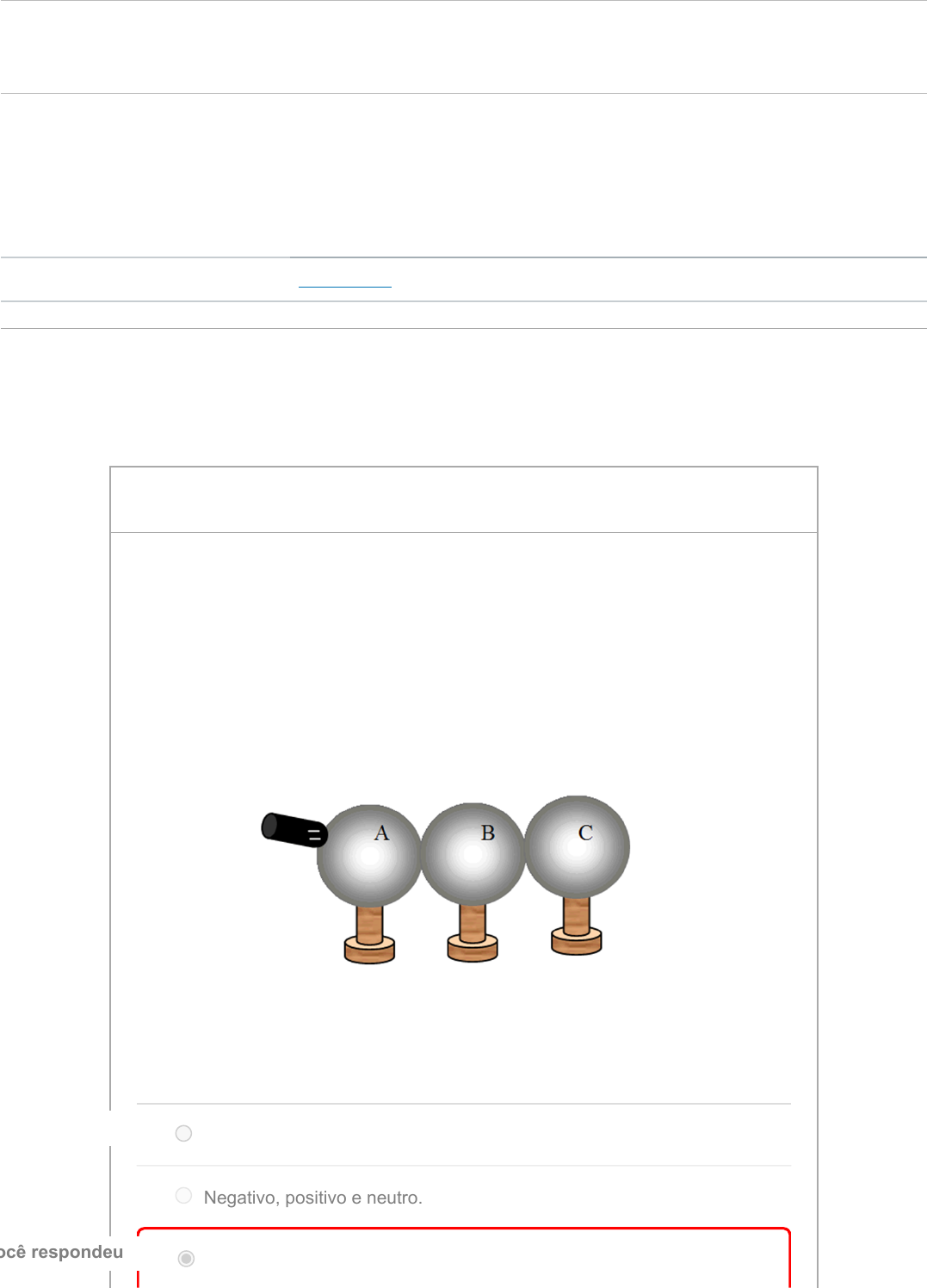 23/04/2023, 14:21 Eletrização por contato: Física III - Física - Campus Coração Eucarístico - PMG - Tarde - 2023/1 https://pucminas.instructure.com/courses/138975/quizzes/379784?module_item_id=3129926 1/6 Eletrização por contato Entrega 26 fev em 23:59 Pontos 5 Perguntas 5 Limite de tempo Nenhum Histórico de tentativas Tentativa Tempo Pontuação MAIS RECENTE Tentativa 1 19 minutos 3 de 5 Pontuação deste teste: 3 de 5 Enviado 25 fev em 12:46 Esta tentativa levou 19 minutos. 0 / 1 ptsPergunta 1 Três esferas condutoras iguais, inicialmente neutras, estão apoiadas em suportes isolantes e dispostas em linha, como mostra a figura, com a esfera B em contato com as esferas A e C. Uma barra condutora negativamente carregada é colocada em contato com a esfera A. Em seguida, a esfera C é removida, a esfera B é removida e, finalmente, a barra é removida. Quais são os sinais das cargas das esferas A, B e C, respectivamente, depois que a barra é removida? Negativo, negativo e negativo. esposta corretaesposta correta Negativo, positivo e neutro. Positivo, negativo e positivo. ocê respondeuocê respondeu https://pucminas.instructure.com/courses/138975/quizzes/379784/history?version=1 23/04/2023, 14:21 Eletrização por contato: Física III - Física - Campus Coração Eucarístico - PMG - Tarde - 2023/1 https://pucminas.instructure.com/courses/138975/quizzes/379784?module_item_id=3129926 2/6 Positivo, neutro e negativo. Positivo, positivo e negativo. Na eletrização por contato, uma parte da carga de um corpo é transferida para outro. Assim, os corpos ficam com cargas de mesmo sinal. Como A, B e C estavam em contato entre si, quando a barra encostrou em A, todos receberam uma parte da carga negativa da barra. 1 / 1 ptsPergunta 2 Três esferas condutoras idênticas A, B e C estão mostradas na figura. Inicialmente, a esfera A possui carga +2Q e a esfera C possui carga +Q. Fios são ligados e desligados na sequência mostrada na figura da esquerda para a direita. Qual é a carga final da esfera C? +Q/3 +Q/2 +QCorreto!Correto! +2Q +3Q 23/04/2023, 14:21 Eletrização por contato: Física III - Física - Campus Coração Eucarístico - PMG - Tarde - 2023/1 https://pucminas.instructure.com/courses/138975/quizzes/379784?module_item_id=3129926 3/6 No primeiro passo, a esfera A é conectada com a esfera B. Como elas são idênticas, a carga é distribuída igualmente entre elas e cada uma fica com uma carga +2Q/2 = +Q. Em seguida, o contato de A com B é desfeito, e A é ligada com C. Mais uma vez, como as esferas são idênticas, a carga é distribuída igualmente entre elas. Porém, a esfera A já possui uma carga +Q, e C também possui uma carga +Q. Assim, a esfera C vai permanecer com a carga +Q. 0 / 1 ptsPergunta 3 Um objeto condutor A é eletrizado até adquirir uma carga elétrica de q = –16,0 nC. Em seguida, o corpo A é colocado em contato com outro objeto idêntico B, que estava inicialmente neutro, e após alguns segundos o contato é desfeito. Então, o objeto A é colocado em contato com um terceiro corpo C, idêntico e inicialmente neutro. Em seguida, o contato é desfeito. Quantos bilhões (10 ) de elétrons estão presentes em A ao final do processo? 9 -4 ocê respondeuocê respondeu espostas corretasespostas corretas 25 (com margem: 0) 23/04/2023, 14:21 Eletrização por contato: Física III - Física - Campus Coração Eucarístico - PMG - Tarde - 2023/1 https://pucminas.instructure.com/courses/138975/quizzes/379784?module_item_id=3129926 4/6 Ao entrar em contato com B, metade da carga de A é transferida para ele, devido ao processo de eletrização por contato. Assim, após o primeiro contato, a carga de A é q' = –8,0 nC. Em seguida, ao entrar em contato com C, metade da carga restante de A é transferida. Logo, a carga de A após o segundo contato é q'' = –4,0 nC. Dessa forma, o número de elétrons em A ao final do processo será de õ é õ é 1 / 1 ptsPergunta 4 (Halliday*) Na figura, três esferas condutoras iguais possuem inicialmente as seguintes cargas: esfera A, +4Q; esfera B, –6Q; esfera C, 0. As esferas A e B são mantidas fixas, a uma distância entre os centros que é muito maior que o raio das esferas. Dois experimentos são executados. No experimento 1, a esfera C é colocada em contato com a esfera A, depois (separadamente) com a esfera B e, finalmente, é removida. No experimento 2, que começa com os mesmos estados iniciais, a ordem é invertida: a esfera C é colocada em contato com a esfera B, depois (separadamente) com a esfera A e, finalmente, é removida. Qual é a razão entre a carga de C no fim do experimento 2 e a carga de C no fim do experimento 1? Sua resposta deve incluir o sinal, se for 23/04/2023, 14:21 Eletrização por contato: Física III - Física - Campus Coração Eucarístico - PMG - Tarde - 2023/1 https://pucminas.instructure.com/courses/138975/quizzes/379784?module_item_id=3129926 5/6 o caso. -0,25 Correto!Correto! espostas corretasespostas corretas -0,25 (com margem: 0) Na primeira parte do experimento 1, devido à eletrização por contato, a carga da esfera A de +4Q é distribuída igualmente entre as esferas A e C, e cada uma delas fica com carga +2Q. Depois, ao colocar B e C em contato, a carga total (-6Q + 2Q = -4Q) vai se redistribuir de forma que as duas esferas fiquem com a mesma carga final. Logo, cada uma delas vai ficar com carga -2Q. Já na primeira parte do experimento 2, colocamos B e C inicialmente em contato e a carga de B se distribui entre as duas esferas, de forma que cada uma fica com carga -3Q. Em seguida, colocamos A e C em contato, e a carga total (+4Q - 3Q = +1Q) se distribui igualmente entre as duas esferas, com cada uma delas ficando com +0,5Q. Portanto, a razão entre as cargas de C no segundo e no primeiro experimento é 1 / 1 ptsPergunta 5 Três esferas condutoras idênticas A, B e C estão mostradas na figura. Inicialmente, apenas a esfera C está carregada. Fios são ligados e desligados