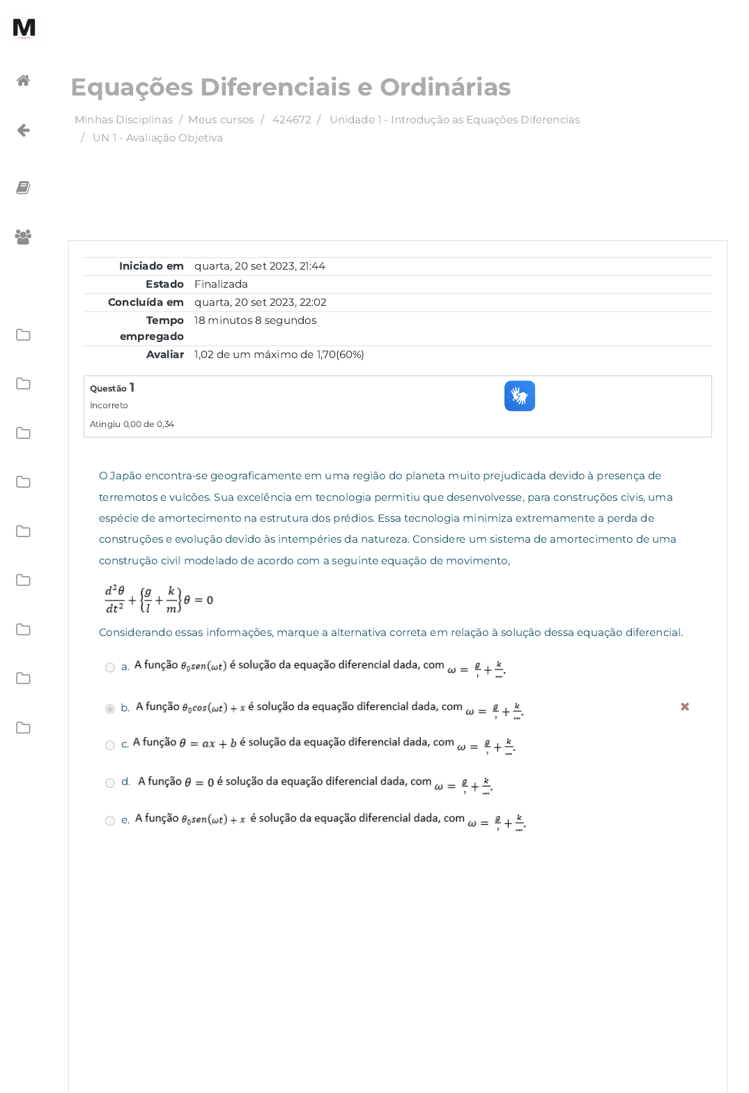 Minhas Disciplinas / Meus cursos / 424672 / Unidade 1 - Introdução as Equações Diferencias / UN 1 - Avaliação Objetiva Equações Diferenciais e Ordinárias Iniciado em quarta, 20 set 2023, 21:44 Estado Finalizada Concluída em quarta, 20 set 2023, 22:02 Tempo empregado 18 minutos 8 segundos Avaliar 1,02 de um máximo de 1,70(60%) Questão 1 Incorreto Atingiu 0,00 de 0,34 O Japão encontra-se geogra�camente em uma região do planeta muito prejudicada devido à presença de terremotos e vulcões. Sua excelência em tecnologia permitiu que desenvolvesse, para construções civis, uma espécie de amortecimento na estrutura dos prédios. Essa tecnologia minimiza extremamente a perda de construções e evolução devido às intempéries da natureza. Considere um sistema de amortecimento de uma construção civil modelado de acordo com a seguinte equação de movimento, Considerando essas informações, marque a alternativa correta em relação à solução dessa equação diferencial. a. b. c. d. e. https://avap.multivix.edu.br/my/ https://avap.multivix.edu.br/course/view.php?id=23775 https://avap.multivix.edu.br/course/view.php?id=23775§ion=2 https://avap.multivix.edu.br/mod/quiz/view.php?id=1533314 https://avap.multivix.edu.br/my/ https://avap.multivix.edu.br/course/view.php?id=23775 https://avap.multivix.edu.br/user/index.php?id=23775 https://avap.multivix.edu.br/course/view.php?id=23775§ion=1 https://avap.multivix.edu.br/course/view.php?id=23775§ion=2 https://avap.multivix.edu.br/course/view.php?id=23775§ion=3 https://avap.multivix.edu.br/course/view.php?id=23775§ion=4 https://avap.multivix.edu.br/course/view.php?id=23775§ion=5 https://avap.multivix.edu.br/course/view.php?id=23775§ion=6 https://avap.multivix.edu.br/course/view.php?id=23775§ion=7 https://avap.multivix.edu.br/course/view.php?id=23775§ion=8 https://avap.multivix.edu.br/course/view.php?id=23775§ion=9 https://avap.multivix.edu.br/course/view.php?id=23775§ion=10 https://avap.multivix.edu.br/ https://avap.multivix.edu.br/ https://avap.multivix.edu.br/ https://avap.multivix.edu.br/ https://avap.multivix.edu.br/ Questão 2 Correto Atingiu 0,34 de 0,34 Questão 3 Correto Atingiu 0,34 de 0,34 Imagine que em sua pesquisa de TCC você precise escrever uma equação diferencial de segunda ordem no tempo a partir da segunda lei de Newton. Nesse contexto, você faz a análise crítica do diagrama de forças desse sistema e acaba obtendo a seguinte equação diferencial: em que b é uma constante. A partir dessa informação, marque a alternativa correta em relação aos componentes dessa equação diferencial. a. A não linearidade da equação diferencial impede que a velocidade seja proporcional à aceleração. b. O fato integrante correspondente à equação diferencial encontrada é uma função hiperbólica. c. A aplicação da segunda lei de Newton se torna inviável nesse contexto. d. A aceleração do sistema é proporcional à velocidade deste. e. A equação diferencial obtida é uma equação de primeira ordem não exata. O oscilador massa-mola é um tipo de oscilador denominado oscilador harmônico simples. Esse apresenta uma enorme aplicabilidade em todas as áreas do conhecimento envolvendo ciência e tecnologia. Para esse exercício, considere a seguinte equação de movimento de um oscilador massa-mola com duas molas associadas em série, Considerando como solução a função θ= θ_0 sen(ωt+ φ) e com base nessas informações, marque a alternativa correta em relação à frequência angular, dada por, ω. a. b. ω = vT. c. ω = kT. d. ω= m/k. e. https://avap.multivix.edu.br/my/ https://avap.multivix.edu.br/course/view.php?id=23775 https://avap.multivix.edu.br/user/index.php?id=23775 https://avap.multivix.edu.br/course/view.php?id=23775§ion=1 https://avap.multivix.edu.br/course/view.php?id=23775§ion=2 https://avap.multivix.edu.br/course/view.php?id=23775§ion=3 https://avap.multivix.edu.br/course/view.php?id=23775§ion=4 https://avap.multivix.edu.br/course/view.php?id=23775§ion=5 https://avap.multivix.edu.br/course/view.php?id=23775§ion=6 https://avap.multivix.edu.br/course/view.php?id=23775§ion=7 https://avap.multivix.edu.br/course/view.php?id=23775§ion=8 https://avap.multivix.edu.br/course/view.php?id=23775§ion=9 https://avap.multivix.edu.br/course/view.php?id=23775§ion=10 https://avap.multivix.edu.br/ https://avap.multivix.edu.br/ https://avap.multivix.edu.br/ https://avap.multivix.edu.br/ https://avap.multivix.edu.br/ Questão 4 Correto Atingiu 0,34 de 0,34 Questão 5 Incorreto Atingiu 0,00 de 0,34 Funções cíclicas apresentam muitas aplicabilidades no estudo de fenômenos naturais, principalmente no contexto das oscilações e das ondas eletromagnéticas. Uma função cíclica é aquela em que suas derivadas são iguais às próprias funções originais. Em outras palavras, são aquelas funções em que sua derivada é igual, ao menos de uma constante, da função original. Essas funções são indispensáveis para o estudo de sistemas físicos importantes aplicados em todas as áreas da ciência e tecnologia como, por exemplo, o oscilador harmônico, o pêndulo simples e as ondas eletromagnéticas. Com base nessas informações, marque a alternativa correta em que a segunda derivada da função, em relação ao tempo, é igual à função original. a. b. at² +bt + c, com a,b,c sendo constantes. c. a, com a sendo uma constante. d. bt + c, com b,c sendo constantes. e. at, com a sendo uma constante. Considere que um sistema físico de oscilações é estudado nas aulas de laboratório de física. Nesse sistema, temos uma massa presa a uma mola e a cada vez que a massa é acrescida ou retirada, a mola sofre uma deformação. Um aplicado aluno da disciplina de equações diferenciais acabou utilizando os seus conhecimentos de física e modelou o sistema de acordo com a seguinte equação: Nesse caso, ω é denominada frequência angular e x, a função posição. Com base nessas informa