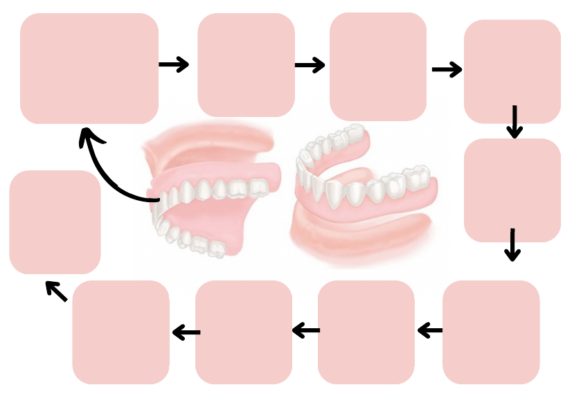 Exame do Paciente: • Anamnese • Exame extraoral • Exame intraoral . Exames Radiograficos Moldagem Anatômica Prótese total Moldeira Individual e Moldagem Funcional Base de Prova e ajuste de Plano de Orientação Prova dos dentes montados em cera, no paciente Seleção dos dentes artificiais e cor da gengiva Acrilização da Prótese Instalação da Prótese Montagem no ASA (articulador semi ajustável) Controle e retorno após 7 dias . Joyce Aparecida Vilela Exame do Paciente PT, PPR e PF Exame clínico : . • Anamnese: Primeira fase do exame clínico, é a coleta das informações do paciente, como condição geral de saúde, alergias a medicamentos , doenças sistêmicas, possíveis problemas que possam limitar ou interferir nos procedimentos clínicos, queixa principal expectativas e grau de exigência, e pesquisas sobre hábitos parafuncionais. . • Exame extraoral: Avaliar se o paciente apresenta alguma limitação funcional,para tratar antes de iniciar o tratamento, como disfunção temporomandibular ou dor orofacial, patologias, musculatura facial e cervical, sensibilidade a palpação e fala do paciente. Observar o aspecto facial, verificar características como dimensão vertical, altura incisão, linha do sorriso, simetria facial, forma do rosto-( classificação de Léo Williams: triangular,quadrado, ovoide), e suporte do labio. . • Exame intraoral : Inspecionam- se tecidos moles da mucosa jugal, língua, rebordo, dentes: (integridade, necessidade de tratamento prévio,vitalidade pulpar, lesões cariosas e não cariosas, apertamento, bruxismo), relação lábio-rebordo (favorável/desfavorável), forma dos arcos, forma, altura e direção do rebordo residual, consistência da fibromucosa, quantidade e qualidade de saliva, torus, inserções musculares, periodonto de sustentação e proteção, sondagem, nível de inserção óssea, exame de área edêntula ,espaço protético e estruturas adjacentes. . História protética e dental: se o paciente usar prótese verificar se está satisfatória ou insatisfatoria e verificar o grau de higiene, (estética: cor, forma, tamanho da coroa, linha media e plano oclusal). Exames complementares radiográficos: Periapical; • Interproximal; • Panorâmico. e Radiograia Oclusal Oclusão : . Verificar: sinais e sintomas de trauma oclusal • Relações maxilomandibulares; • Espaço intermaxilar (favorável, excessivo, reduzido); • DVR; • DVO; • Relação cêntrica; Máxima Intercuspidação habitual; Sintomalogia; Desvios ; Alterações no plano oclusal; Limitações de abertura; Patologias Modelos de Estudo: Montados em articulador na posição RC. Do molde de alginato obtêm-se o modelo de gesso que reproduzem fielmente a maxila e mandíbula para um melhor planejamento Planejamento: É definido apos a colocação das coroas provisorias e realização de cirurgias periodontais, verifica qual melhor opção funcionalmente e pro paciente entre as próteses . Joyce Aparecida Vilela 3B Moldagem Anatômica Prótese Total 1 Seleção da Moldeira p/ desdentado compatível com o arco a ser moldado 2 Individualização da moldeira com cera utilidade 3 Manipulação do Alginato (maaxila: 3porções do alginato/ Mandíbula = 2 porções do alginato ) espaulaçao por 1 minuto, colocar moldeira com alginato no paciente, segurando com compressão bilateral simultanea 4 Após aguardar o tempo de presa, a moldeira é removida em um movimento único, sem báscula, jato de ar pode ajudar a soltar 5 Remoção e avaliação do molde , remoção dos excessos de alginato 6 Lavagem em água corrente, secar o Molde com papel toalha; 7 Desinfecção clorexidina 2% – sendo mantido em um saquinho plastico fechado por 10 minutos, em seguida lava-se em água corrente e seca com jatos de ar; 8 Seleção e preparação do gesso, tipo III 33 ml de água/ 100 gr de pó, Manipulação/espatulação do gesso de 45 segundos a 1 minuto; posterior vibração manual ou por meio mecânico para remoção do máximo de bolhas de ar. À medida que as bolhas de ar emergem na superfície, devemos elimina-las com espátula para gesso 9 Vazamento do gesso dentro do molde, com o auxílio do vibrador pequenas medidas do gesso são adicionadas e escoam lentamente. Um pincel pode ser utilizado para remoção das bolhas de ar. Fazer pequenas bolinhas de gesso configurando retenções para o gesso de base, Verter o gesso tipo III preenchendo todo o remanescente do molde para configuração da base do modelo (espessura mínima de 1,5cm) Realizar vários “x” com a própria espátula para gesso ou Lecron para melhorar a retenção do gesso tipo II para base do articulador 10 Sacar o molde do modelo de 40 minutos a 1 hora após o vazamento do gesso tipo III e avaliar; 12 Recorte do modelo, deixar plana a base; 13 Armazenar o modelo em um recipiente seguro. Moldeira Individual 1 Tracado da area chapeavel e delimitação da área de suporte no modelo preliminar 2 Alívios obrigatórios e não obrigatórios com plastificação de cera 7 ou algodão com camada fina, e sem ultrapassar os limites da linha do término da área chapeável (deixar exposta) 4 Isolar o modelo com isolante para gesso/resina (Cel-Lac), e placas de vidro com vaselina 5 Confeccionar “stop” na placa de vidro para espessura da resina acrílica (espessura de duas lâminas de cera 7); 6 Preparação da resina acrílica quimicamente ativada: 1. 1° Monômero (líquido)/2° polímero (pó) – 1:3 em volume; 2. Evitar de mexer muito essa mistura, evitando a incorporação de bolhas; deixar tampada; 3. Aguardar a fase plástica, colocar na placa de vidro e pressionar uma contra a outra até o “stop”; 4. Adaptar a resina acrílica ao modelo, fazer bordo duplo e recortar os excessos (cortar 2 mm de fundo de vestíbulo, conforme a marcação inicial; OBS: cuidado para não cortar em demasia, pois a resina contrai na polimerização) – use Lecron e monômero; 5. Com o excesso, confeccionar o cabo biang