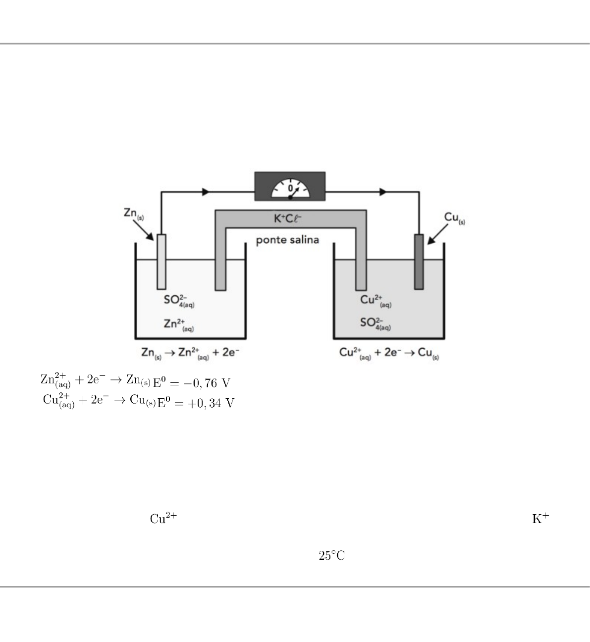 A figura representa uma pilha, em que é um voltímetro, é uma chave e é a ponte salina, que contém solução aquosa saturada de cloreto de potássio  O eletrodo de zinco está imerso na solução aquosa de sulfato de zinco  e o eletrodo de prata está imerso na solução aquosa de nitrato de prata