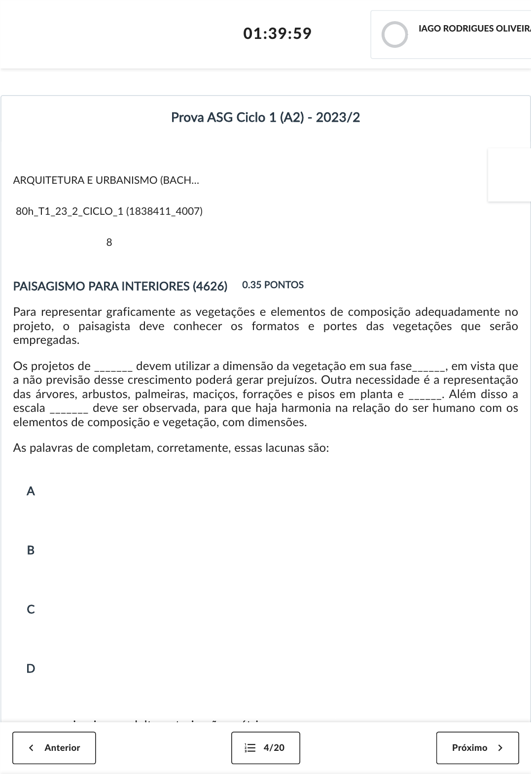 23/09/2023, 16:05 AvaliA Online :: AvaliA Online https://unifran.grupoa.education/avalia-online/ 1/2 Prova ASG Ciclo 1 (A2) - 2023/2 Curso ARQUITETURA E URBANISMO (BACH… Turma 80h_T1_23_2_CICLO_1 (1838411_4007) Período 8 PAISAGISMO PARA INTERIORES (4626) Para representar graficamente as vegetações e elementos de composição adequadamente no projeto, o paisagista deve conhecer os formatos e portes das vegetações que serão empregadas. Os projetos de _______ devem utilizar a dimensão da vegetação em sua fase______, em vista que a não previsão desse crescimento poderá gerar prejuízos. Outra necessidade é a representação das árvores, arbustos, palmeiras, maciços, forrações e pisos em planta e ______. Além disso a escala _______ deve ser observada, para que haja harmonia na relação do ser humano com os elementos de composição e vegetação, com dimensões. As palavras de completam, corretamente, essas lacunas são: A B C D E 0.35 PONTOS paisagismo; inicial; setorização; humana interiores; inicial; elevação; métrica interiores; adulta; elevação; métrica paisagismo; adulta; elevação; humana paisagismo; adulta; setorização; métrica Anterior 4/20 Próximo IAGO RODRIGUES OLIVEIRA 23_2353860101:39:59 IO 23/09/2023, 16:05 AvaliA Online :: AvaliA Online https://unifran.grupoa.education/avalia-online/ 2/2 Anterior 4/20 Próximo IAGO RODRIGUES OLIVEIRA 23_2353860101:39:59 IO