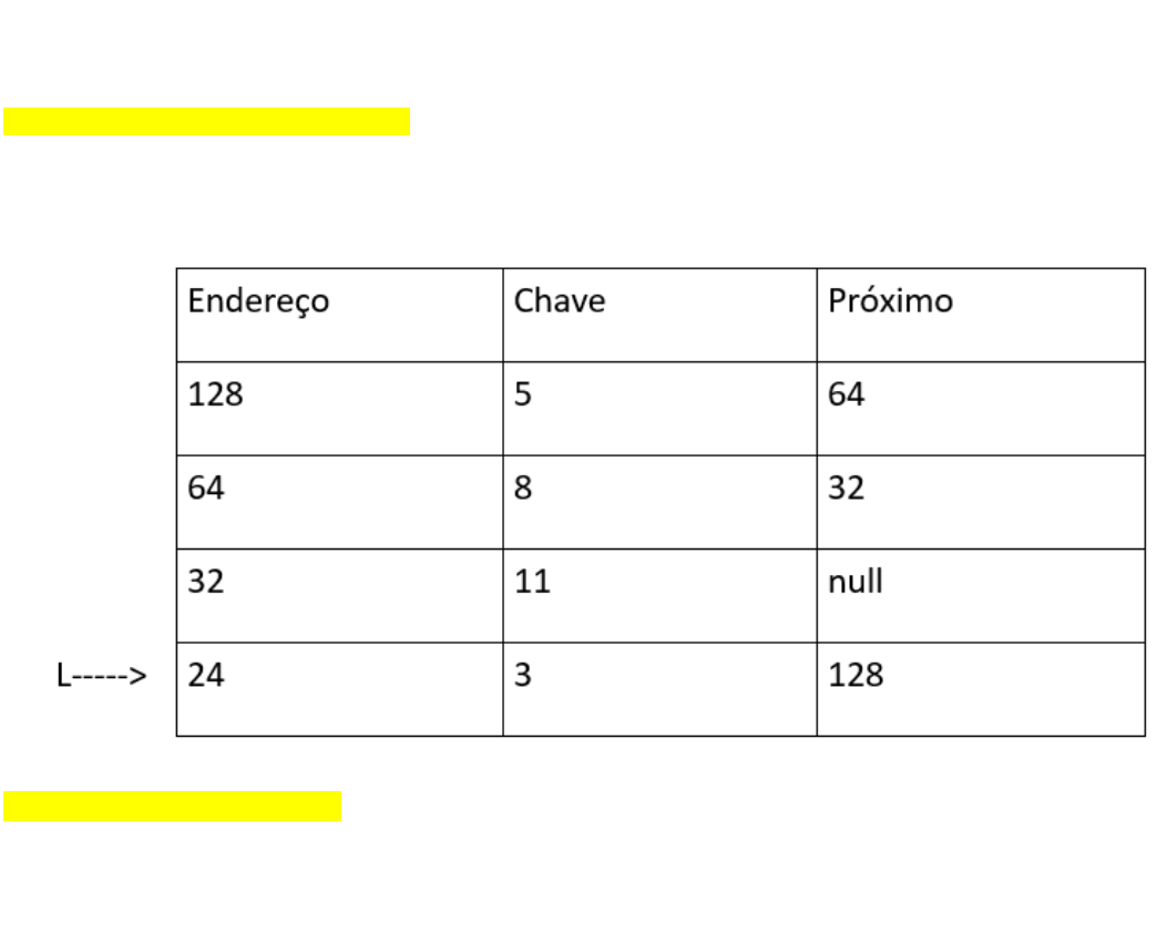 exercicio 1 Uma lista L em alocação contígua está armazenada em memória no endereço 32. L possui elementos de 2 bytes cada e no momento contém [10, 20, 30, 40] . Os elementos 5 e 50 serão inseridos em sequência. Em que endereços eles serão inseridos, respectivamente, caso a lista não seja ordenada, e caso a lista seja ordenada? R- Não ordenada: 40, 42; ordenada: 32, 42. 2 Uma lista L encadeada e ordenada está armazenada em memória seguindo o exemplo abaixo. Após a remoção do nó de chave 3, quais alterações terão ocorrido? R – A variável L apontará para 128.