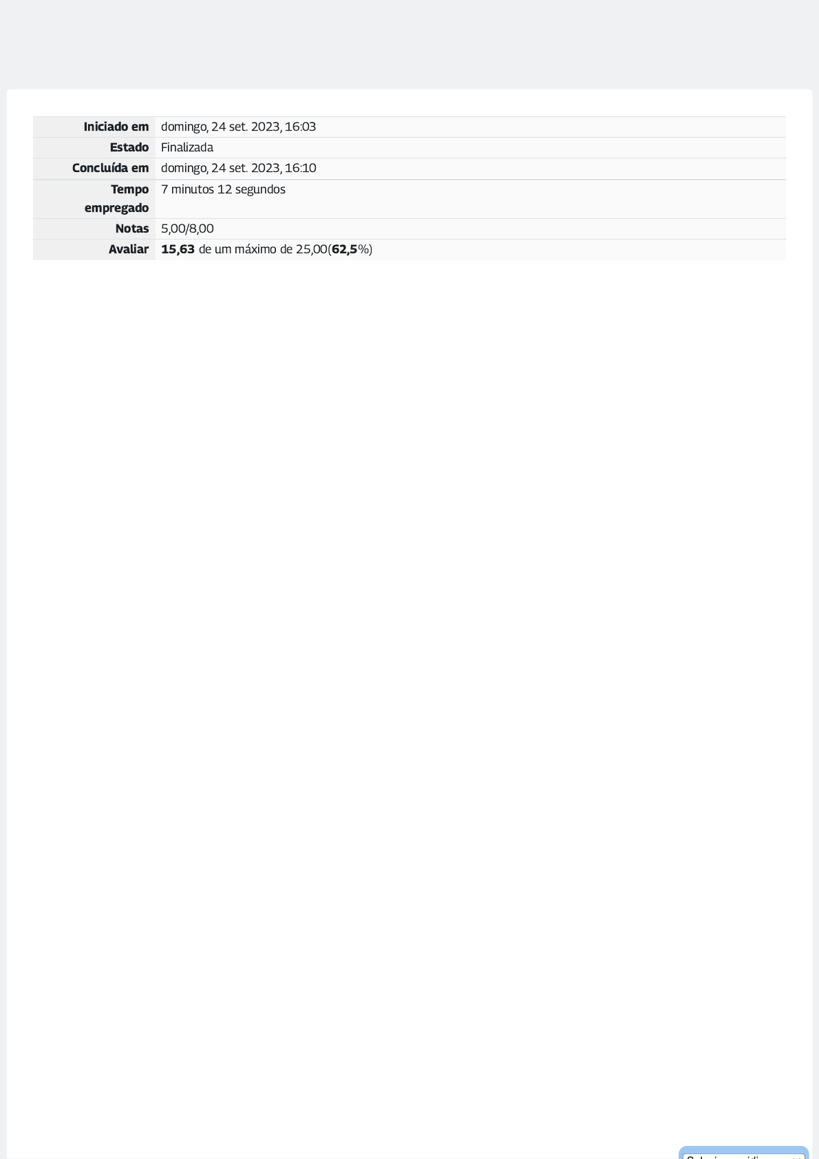 Iniciado em domingo, 24 set. 2023, 16:03 Estado Finalizada Concluída em domingo, 24 set. 2023, 16:10 Tempo empregado 7 minutos 12 segundos Notas 5,00/8,00 Avaliar 15,63 de um máximo de 25,00(62,5%) S l i idi Questão 1 Incorreto Atingiu 0,00 de 1,00 Analise o script abaixo. library(tidyverse) #O objeto url abaixo indica onde está na internet a tabela com os dados sobre municípios brasileiros url<- "https://raw.githubusercontent.com/fernandobarbalho/enap_auto_instucional/main/data/dados_municipios.csv" #O comando read_csv permite ler para a sua máquina o conteúdo de uma tabela que está no endereço especi�cado no objeto url #o conteúdo da tabela é passado para o dataframe dados_municipios dados_municipios<- read_csv(url) dados_municipios%>% �lter(sigla_uf == "CE") %>% select(sigla_uf,nome, populacao) %>% arrange(desc(populacao)) Qual o resultado da execução do script acima? Escolha uma opção: a. # A tibble: 185 x 3 sigla_uf nome populacao <chr> <chr> <dbl> 1 PE Recife 1653461 2 PE Jaboatão dos Guararapes 706867 3 PE Olinda 393115 4 PE Caruaru 365278 5 PE Petrolina 354317 6 PE Paulista 334376 7 PE Cabo de Santo Agostinho 208944 8 PE Camaragibe 158899 9 PE Garanhuns 140577 10 PE Vitória de Santo Antão 139583 # ... with 175 more rows b. # A tibble: 184 x 2 nome populacao <chr> <dbl> 1 Fortaleza 2686612 2 Caucaia 365212 3 Juazeiro do Norte 276264 4 Maracanaú 229458 5 Sobral 210711 6 Crato 133031 7 Itapipoca 130539 8 Maranguape 130346 9 Iguatu 103074 10 Quixadá 88321 # ... with 174 more rows Selecione o idioma Powered by Tradutor https://raw.githubusercontent.com/fernandobarbalho/enap_auto_instucional/main/data/dados_municipios.csv https://translate.google.com/ c. # A tibble: 184 x 3 sigla_uf nome populacao <chr> <chr> <dbl> 1 CE Abaiara 11853 2 CE Acarape 15036 3 CE Acaraú 63104 4 CE Acopiara 54481 5 CE Aiuaba 17493 6 CE Alcântaras 11781 7 CE Altaneira 7650 8 CE Alto Santo 17196 9 CE Amontada 43829 10 CE Antonina do Norte 7378 # ... with 174 more rows d. # A tibble: 369 x 3 sigla_uf nome populacao <chr> <chr> <dbl> 1 CE Fortaleza 2686612 2 CE Recife 1653461 3 CE Jaboatão dos Guararapes 706867 4 CE Olinda 393115 5 CE Caruaru 365278 6 CE Caucaia 365212 7 CE Petrolina 354317 8 CE Paulista 334376 9 CE Juazeiro do Norte 276264 10 CE Maracanaú 229458 # ... with 359 more rows e. # A tibble: 184 x 3 sigla_uf nome populacao <chr> <chr> <dbl> 1 CE Fortaleza 2686612 2 CE Caucaia 365212 3 CE Juazeiro do Norte 276264 4 CE Maracanaú 229458 5 CE Sobral 210711 6 CE Crato 133031 7 CE Itapipoca 130539 8 CE Maranguape 130346 9 CE Iguatu 103074 10 CE Quixadá 88321 # ... with 174 more rows Sua resposta está incorreta. A opção “e” corresponde aos �ltros de coluna e linha aplicados no script, bem como traz os valores de população em ordem decrescente, tal como indicado no script. A resposta correta é: # A tibble: 184 x 3 sigla_uf nome populacao <chr> <chr> <dbl> 1 CE Fortaleza 2686612 2 CE Caucaia 365212 3 CE Juazeiro do Norte 276264 4 CE Maracanaú 229458 5 CE Sobral 210711 6 CE Crato 133031 7 CE Itapipoca 130539 8 CE Maranguape 130346 9 CE Iguatu 103074 10 CE Quixadá 88321 # ... with 174 more rows Questão 2 Parcialmente correto Atingiu 0,20 de 1,00 Execute o script indicado nesta atividade. Em seguida julgue as alternativas como verdadeiras ou falsas: #O objeto url abaixo indica onde está na internet a tabela com os dados sobre municípios brasileiros url<- "https://raw.githubusercontent.com/fernandobarbalho/enap_auto_instucional/main/data/dados_municipios.csv" #O comando read_csv permite ler para a sua máquina o conteúdo de uma tabela que está no endereço especi�cado no objeto url #o conteúdo da tabela é passado para o dataframe dados_municipios dados_municipios<- read_csv(url) dados_municipios%>% �lter(sigla_uf != "DF") %>% group_by(sigla_uf) %>% summarise( media_populacao_municipios = mean(populacao) ) %>% arrange(desc(media_populacao_municipios)) a. O estado de São Paulo possui a maior média de população dos seus municípios. b. O estado do Acre está entre os dez estados com maior média de população nos seus municípios. c. O Rio de Janeiro é o único estado que tem uma média de população dos seus municípios maior do que 100.000 habitantes. d. Todos os 10 estados com maior média de população nos seus municípios têm essa média acima dos 50.000 habitantes. e. A Bahia não aparece na lista dos dez estados com maior média de população por município. Verdadeira Falsa Falsa Verdadeira Verdadeira Sua resposta está parcialmente correta. Você selecionou corretamente 1. A a�rmativa “a” é falsa – o estado do Rio de Janeiro ocupa a primeira posição. A opção “b” é verdadeira – o Acre é o décimo do ranking. A opção “c” é verdadeira – o Rio de Janeiro, com média de 188763 habitantes nos seus municípios, é o único com esta medida acima de 100.000 habitantes. A opção “d” é falsa – CE, RR e AC possuem uma média inferior a 50.000 habitantes. A opção “e” é verdadeira – a lista dos 10 estados compreende: RJ, SP, AM, PA, ES, PE, CE, RR, AC. A resposta correta é: a. O estado de São Paulo possui a maior média de população dos seus municípios. → Falsa, b. O estado do Acre está entre os dez estados com maior média de população nos seus municípios. → Verdadeira, c. O Rio de Janeiro é o único estado que tem uma média de população dos seus municípios maior do que 100.000 habitantes. → Verdadeira, d. Todos os 10 estados com maior média de população nos seus municípios têm essa média acima dos 50.000 habitantes. → Falsa, e. A Bahia não aparece na lista dos dez estados com maior média de população por município. → Verdadeira. https://raw.githubusercontent.com/fernandobarbalho/enap_auto_instucional/main/data/dados_municipios.csv Questão 3 Correto Atingiu 1,00 de 1,00 Grá�cos de ranking em formato de barras horizontal ajudam você a identi�car de forma rápida as ocorr