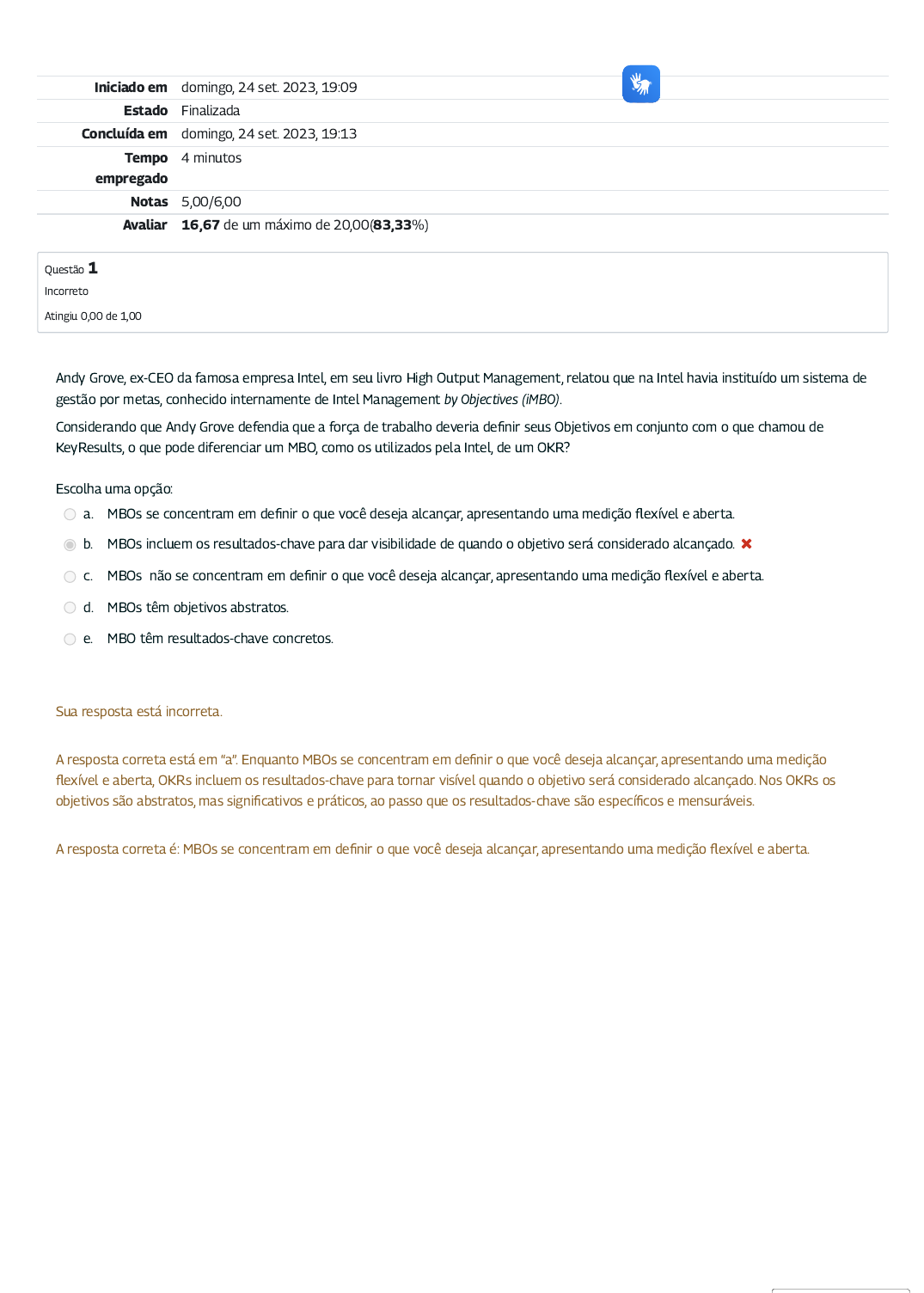 Iniciado em domingo, 24 set. 2023, 19:09 Estado Finalizada Concluída em domingo, 24 set. 2023, 19:13 Tempo empregado 4 minutos Notas 5,00/6,00 Avaliar 16,67 de um máximo de 20,00(83,33%) Questão 1 Incorreto Atingiu 0,00 de 1,00 Andy Grove, ex-CEO da famosa empresa Intel, em seu livro High Output Management, relatou que na Intel havia instituído um sistema de gestão por metas, conhecido internamente de Intel Management by Objectives (iMBO). Considerando que Andy Grove defendia que a força de trabalho deveria de�nir seus Objetivos em conjunto com o que chamou de KeyResults, o que pode diferenciar um MBO, como os utilizados pela Intel, de um OKR? Escolha uma opção: a. MBOs se concentram em de�nir o que você deseja alcançar, apresentando uma medição �exível e aberta. b. MBOs incluem os resultados-chave para dar visibilidade de quando o objetivo será considerado alcançado. c. MBOs não se concentram em de�nir o que você deseja alcançar, apresentando uma medição �exível e aberta. d. MBOs têm objetivos abstratos. e. MBO têm resultados-chave concretos. Sua resposta está incorreta. A resposta correta está em “a”. Enquanto MBOs se concentram em de�nir o que você deseja alcançar, apresentando uma medição �exível e aberta, OKRs incluem os resultados-chave para tornar visível quando o objetivo será considerado alcançado. Nos OKRs os objetivos são abstratos, mas signi�cativos e práticos, ao passo que os resultados-chave são especí�cos e mensuráveis. A resposta correta é: MBOs se concentram em de�nir o que você deseja alcançar, apresentando uma medição �exível e aberta. Questão 2 Correto Atingiu 1,00 de 1,00 Existem muitas discussões sobre semelhanças e diferenças entre as propostas de uso de OKR (Objectives and Key Results ou Objetivos e Resultados-Chave em português) e dos conhecidos KPIs (Key Performance Indicator ou Indicadores-Chave de Performance em português.) Qual é a grande diferença entre OKR e KPI? Escolha uma opção: a. O uso de KPIs não permite analisar o histórico de desempenho. b. O uso de KPIs não permite identi�car tendências e fazer previsões para o futuro. c. Os OKRs não se encaixam como uma forma de estruturar objetivos ligados a resultados mensuráveis que apoiam a realização de cada objetivo. d. OKRs não podem ser usados para comunicar de forma que toda organização tenha visibilidade e alinhamento sobre os resultados esperados. e. Os KPIs são métricas de negócios que re�etem o desempenho, enquanto o OKR pode ser visto como uma metodologia para de�nição de metas, no sentido de impulsionar a melhoria contínua. Sua resposta está correta. O uso de KPIs pode ser bastante e�caz para analisar o histórico de desempenho, identi�car tendências e fazer previsões para o futuro. Já os OKRs podem ser entendidos como uma forma de estruturar objetivos ligados a resultados mensuráveis que apoiam a realização de cada objetivo, direcionando e promovendo foco e disciplina. Se analisarmos as duas abordagens, podemos considerar que, enquanto os KPIs são métricas de negócios que re�etem o desempenho, o OKR pode ser visto como uma metodologia para de�nição de metas, no sentido de impulsionar a melhoria contínua. Portanto, a alternativa correta é a letra “e”. A resposta correta é: Os KPIs são métricas de negócios que re�etem o desempenho, enquanto o OKR pode ser visto como uma metodologia para de�nição de metas, no sentido de impulsionar a melhoria contínua. Selecione o idioma Powered by Tradutor https://translate.google.com/ https://translate.google.com/ Questão 3 Correto Atingiu 1,00 de 1,00 John Doerr é um investidor de tecnologia que iniciou carreira na empresa Intel e passou a investir em empresas como Google e Amazon. A fórmula de Doerr para a construção de OKR é: Escolha uma opção: a. Nós vamos (Meta) medido por (Indicador). b. Nós fazemos (Ação) medido por (Indicador). c. Eu vou (Objetivo) medido por (Key Results). d. Eu vou (Ação) medido por (Key Results). e. Eu faço (Objetivo) medido por (Key Results). Sua resposta está correta. A fórmula de Doerr é a melhor maneira de se explicar a estrutura de um OKR, onde: Eu vou (Objetivo) medido por (Key Results) Objectives/Objetivos - descrições memoráveis e qualitativas daquilo que se deseja alcançar. Devem ser curtos, inspiradores e envolventes. Na metodologia OKR, um Objetivo deve motivar e desa�ar a equipe. Key Results/Resultados-Chave - conjunto de métricas que medem o seu progresso em direção ao atingimento dos Objetivos. A metodologia OKR orienta que para cada Objetivo você deve ter um conjunto de 2 a 5 resultados principais. Importante destacar que todos os Key Results devem ser quantitativos e mensuráveis. Portanto, a alternativa correta é a letra “c”. A resposta correta é: Eu vou (Objetivo) medido por (Key Results). Questão 4 Correto Atingiu 1,00 de 1,00 Na metodologia OKR, um objetivo é especí�co, mensurável, realizável, relevante e deve ter um tempo determinado para sua realização. Considerando os tipos de objetivos “compromissado” e “aspiracional”, qual a diferença entre eles? Escolha uma opção: a. O objetivo compromissado, também conhecido por moonshot, re�ete a melhoria contínua e não provocam grandes transformações na organização. b. O objetivo aspiracional, também conhecido por roofshot, é um objetivo ousado e muito difícil de ser alcançado. c. O objetivo compromissado, em geral, não apresenta um ganho de alto valor e devem representar apenas um “check-list”. d. O objetivo aspiracional estimula as pessoas a pensarem diferente, fazerem uso da criatividade e inovação, com um mindset de desenvolvimento que rompe com o status quo. e. O objetivo compromissado é mais ambicioso e difícil de ser alcançado. Sua resposta está correta. O objetivo aspiracional, também conhecido por moonshot, é um objetivo ousado e muito difícil de ser