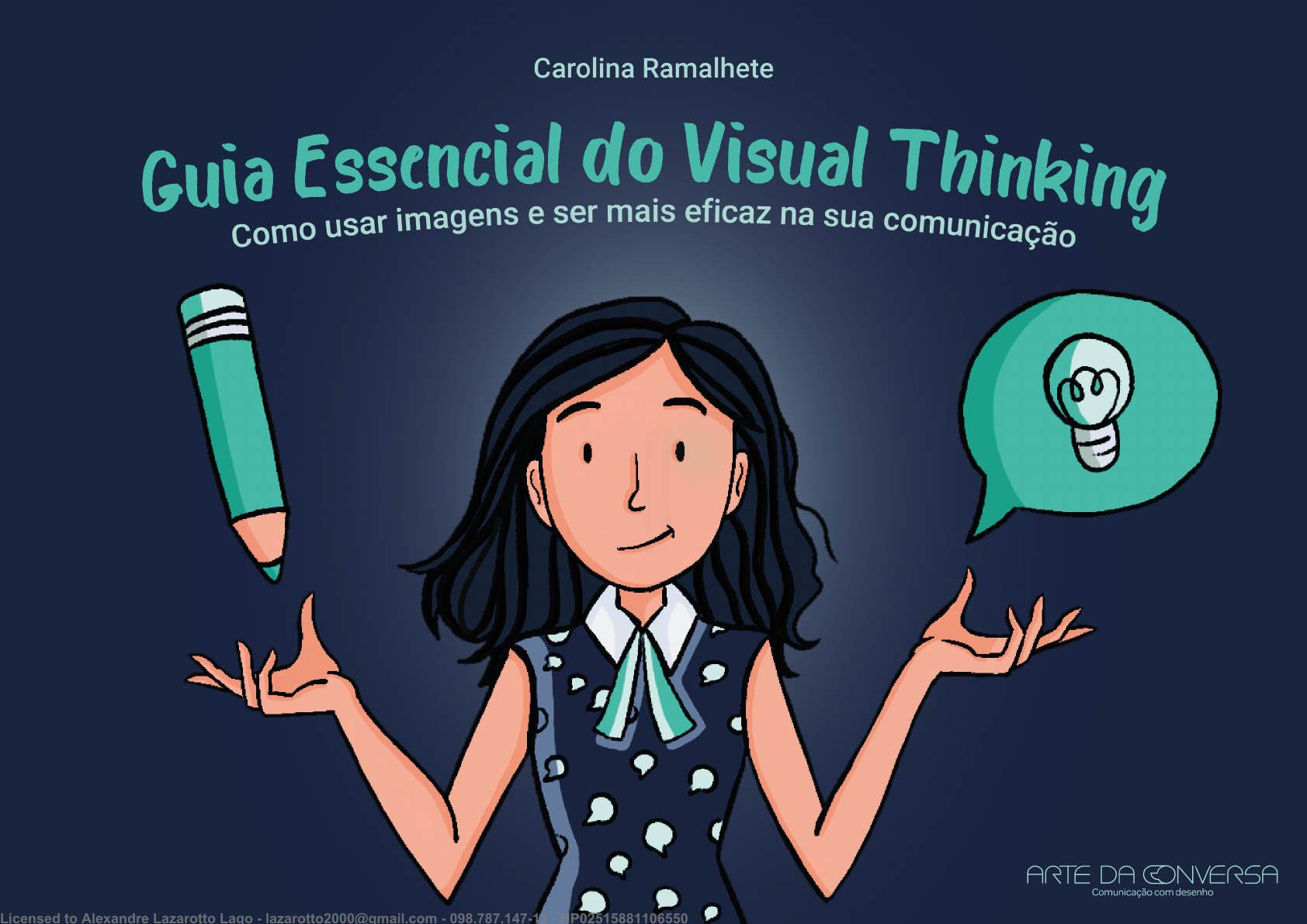 Licensed to Alexandre Lazarotto Lago - lazarotto2000@gmail.com - 098.787.147-13 - HP02515881106550 https://www.artedaconversa.com.br/ Licensed to Alexandre Lazarotto Lago - lazarotto2000@gmail.com - 098.787.147-13 - HP02515881106550 @artedaconversa Sumário Começo da conversa ............................................................................... 06 Você sabe o que é Visual Thinking? ............................................................... 11 Mandala da Integração Criativa ............................................................... 14 Mas funciona pra mim? Eu não sei desenhar ........................................ 16 Vantagens do Pensamento Visual .......................................................... 18 10 razões para se comunicar visualmente ............................................. 19 Conheça os 5 elementos do visual thinking .................................................. 24 O texto ......................................................................................................... 25 Ícones .......................................................................................................... 32 Organizadores ............................................................................................ 38 O todo .......................................................................................................... 39 Você ............................................................................................................ 40 Como lido com a informação? ......................................................................... 43 Registro visual ........................................................................................... 45 Diagrama ..................................................................................................... 46 Viu como desenhar é simples? ................................................................ 52 Exercícios ............................................................................................................ 54 Últimos recados ................................................................................................. 78 Como seguiremos juntos? ........................................................................ 79 A autora: Carol Ramalhete, CEO da Arte da Conversa .......................... 81 Referências bibliográficas ................................................................................ 82 Direitos de reprodução reservados ................................................................. 83 03 Licensed to Alexandre Lazarotto Lago - lazarotto2000@gmail.com - 098.787.147-13 - HP02515881106550 https://www.instagram.com/artedaconversa/?hl=pt-br https://www.artedaconversa.com.br/ Celebro a edição revisada desse livro com especial gratidão aos parceiros de vida e trabalho Eduardo Barroso e Ludmila Viegas e a toda equipe Arte da Conversa. Agradeço a meu pai, Aloysio Vieira, pelo apoio e admiração, que me impulsionam desde sempre, e à minha mãe, Zuleika Ramalhete, os aprendizados sobre cui- dado e empatia. Por fim, meu profundo agradecimento a você, leitor, e a todos os aprendizes, cujo interesse e interação me alimen- tam e inspiram a seguir na jornada de educar para o pensamento visual no Brasil. Esse livro é o começo de uma aven- tura rumo à sua criatividade! Boa leitura! Carol Ramalhete MEUS SINCEROS AGRADECIMENTOS @artedaconversa 04 Licensed to Alexandre Lazarotto Lago - lazarotto2000@gmail.com - 098.787.147-13 - HP02515881106550 https://www.instagram.com/artedaconversa/?hl=pt-br https://www.artedaconversa.com.br/ Licensed to Alexandre Lazarotto Lago - lazarotto2000@gmail.com - 098.787.147-13 - HP02515881106550 Ver é o primeiro passo em direção à mudança 06 Começo da Conversa Nada pode ser mudado, a menos que seja visto, disse James Baldwin. E essa cons- tatação é muito fácil de compreender e conectar com os maiores desafios da atualidade: Um mundo com problemas complexos e em constante transformação! Sabemos que mudanças em vários setores da vida são necessárias e inevitáveis, mas não conseguiremos fazês-las, se não en- xergarmos bem o problema que está por trás da necessidade de mudar. Ver é o primeiro passo em direção à mudança @artedaconversa Licensed to Alexandre Lazarotto Lago - lazarotto2000@gmail.com - 098.787.147-13 - HP02515881106550 https://www.instagram.com/artedaconversa/?hl=pt-br https://www.artedaconversa.com.br/ https://www.instagram.com/artedaconversa/?hl=pt-br 07 Estamos muito acostu- mados a separar tudo em pedacinhos a fim de entender, e ficamos, por vezes, sem a visão do todo. Mas, você pode mu- dar a forma como pensa e lida com o mundo treinando a habilidade de pensar visualmente. Licensed to Alexandre Lazarotto Lago - lazarotto2000@gmail.com - 098.787.147-13 - HP02515881106550 https://www.instagram.com/artedaconversa/?hl=pt-br https://www.artedaconversa.com.br/ 08 Seu cérebro já é equipado para fazer conexões, comparações, agrupa- mentos, leitura e orga- nização espacial... Mas você precisa ajudá-lo. Há jeitos simples de otimizar a forma como você registra e memoriza suas ideias. Neste livro, eu vou com- partilhar alguns con- ceitos e ferramentas de visual thinking que facilitarão, ou mesmo mudarão, seu jeito de li- dar com informação. Licensed to Alexandre Lazarotto Lago - lazarotto2000@gmail.com - 098.787.147-13 - HP02515881106550 https://www.instagram.com/artedaconversa/?hl=pt-br https://www.artedaconversa.com.br/ 09 Fazer anotações visuais e ensinar pessoas a se co- municar com desenhos tem sido o meu trabalho nos últimos 8 anos. Vamos mergulhar na leitura desse livro com abertura para experi- mentar? Convido você a descobrir o seu potencial nato de pensador visual! Licensed to Alexandre Lazarotto Lago - lazarotto2000@gmail.com - 098.787.147-13 - HP02515881106550 https://www.instagram.com/artedaconversa/?hl=pt-br https://www.artedaconversa.com.br/ Licensed