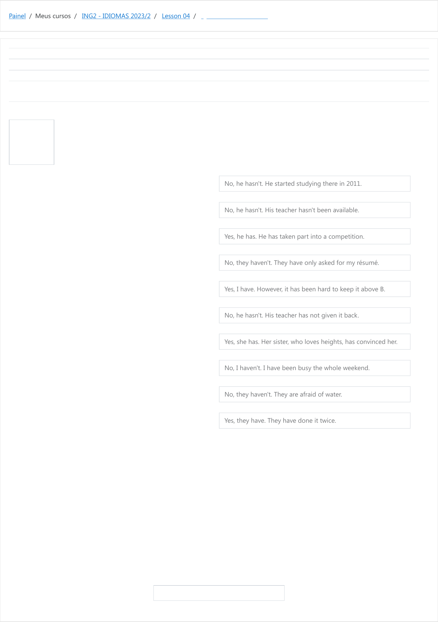 Painel / Meus cursos / ING2 - IDIOMAS 2023/2 / Lesson 04 / Questions and Answers Questão 1 Correto Atingiu 10,00 de 10,00 Iniciado em segunda, 25 set 2023, 08:27 Estado Finalizada Concluída em segunda, 25 set 2023, 08:42 Tempo empregado 14 minutos 35 segundos Avaliar 10,00 de um máximo de 10,00(100%) Select the answers on the right according to the questions on the left. Has Bruno enrolled at Vancouver University since 2012? Has Carlton talked to Mr. Wilcox? Has Oxley done bicycle motocross? Have your teachers requested your academic evaluations? Have you kept good marks for three semesters? Has Steve gotten his academic transcript? Has Amelie gone skydiving on her last vacation? Have you revised my essay? Have Jason and Sarah ever gone scuba diving? Have your parents gone paragliding? No, he hasn't. He started studying there in 2011. No, he hasn't. His teacher hasn't been available. Yes, he has. He has taken part into a competition. No, they haven't. They have only asked for my résumé. Yes, I have. However, it has been hard to keep it above B. No, he hasn't. His teacher has not given it back. Yes, she has. Her sister, who loves heights, has convinced her. No, I haven't. I have been busy the whole weekend. No, they haven't. They are afraid of water. Yes, they have. They have done it twice. Sua resposta está correta. A resposta correta é: Has Bruno enrolled at Vancouver University since 2012? → No, he hasn't. He started studying there in 2011., Has Carlton talked to Mr. Wilcox? → No, he hasn't. His teacher hasn't been available., Has Oxley done bicycle motocross? → Yes, he has. He has taken part into a competition., Have your teachers requested your academic evaluations? → No, they haven't. They have only asked for my résumé., Have you kept good marks for three semesters? → Yes, I have. However, it has been hard to keep it above B., Has Steve gotten his academic transcript? → No, he hasn't. His teacher has not given it back., Has Amelie gone skydiving on her last vacation? → Yes, she has. Her sister, who loves heights, has convinced her., Have you revised my essay? → No, I haven't. I have been busy the whole weekend., Have Jason and Sarah ever gone scuba diving? → No, they haven't. They are afraid of water., Have your parents gone paragliding? → Yes, they have. They have done it twice.. ◄ Have you ever bungee jumped? (apostila) Seguir para... Building Sentences with Present Perfect ► https://moodle.ifsul.edu.br/novohamburgo/my/ https://moodle.ifsul.edu.br/novohamburgo/course/view.php?id=357 https://moodle.ifsul.edu.br/novohamburgo/course/view.php?id=357#section-6 https://moodle.ifsul.edu.br/novohamburgo/mod/quiz/view.php?id=56709 https://moodle.ifsul.edu.br/novohamburgo/mod/resource/view.php?id=56707&forceview=1 https://moodle.ifsul.edu.br/novohamburgo/mod/quiz/view.php?id=56710&forceview=1