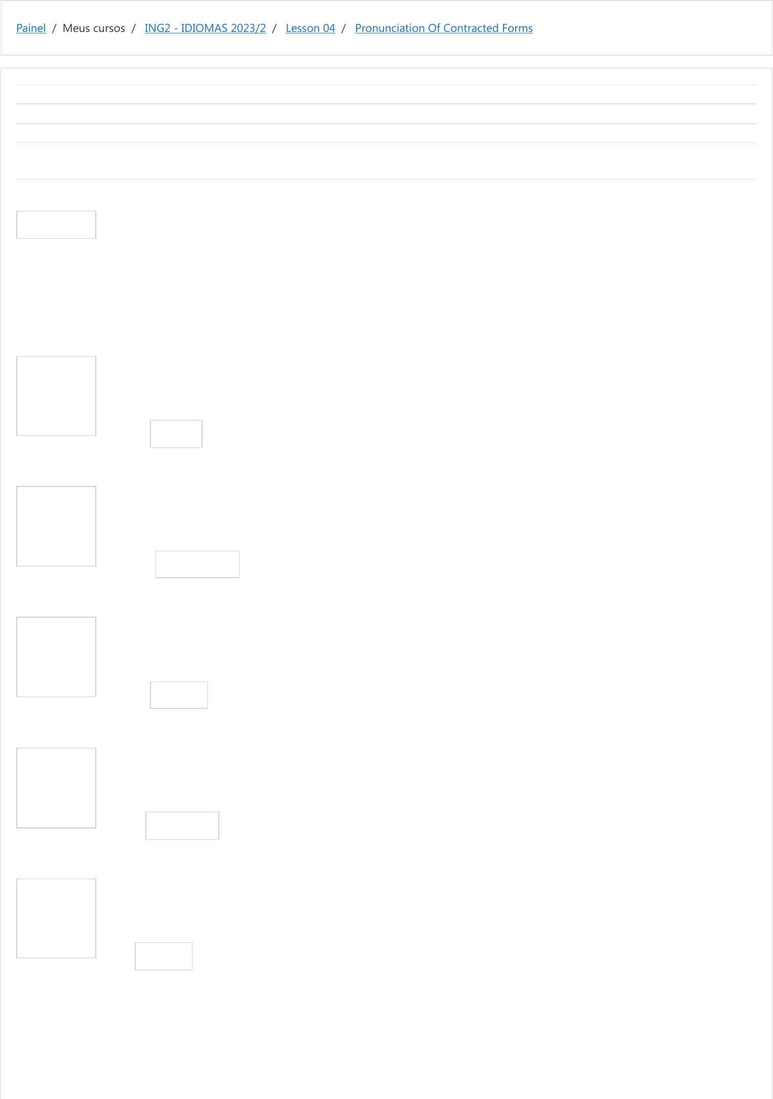 Painel / Meus cursos / ING2 - IDIOMAS 2023/2 / Lesson 04 / Pronunciation Of Contracted Forms Informação Questão 1 Correto Atingiu 1,00 de 1,00 Questão 2 Correto Atingiu 1,00 de 1,00 Questão 3 Correto Atingiu 1,00 de 1,00 Questão 4 Correto Atingiu 1,00 de 1,00 Questão 5 Correto Atingiu 1,00 de 1,00 Iniciado em segunda, 25 set 2023, 09:03 Estado Finalizada Concluída em segunda, 25 set 2023, 09:05 Tempo empregado 2 minutos 51 segundos Avaliar 10,00 de um máximo de 10,00(100%) Listen to the sentences and complete the blanks with the correct auxiliary. Use the contracted forms 's, 've, hasn't or haven't. She 's seen Carlton for an hour. They haven't called Bruno today. You 've already been to Vancouver. He hasn't gone bungee jumping. I 've listened to Sarah so many times! https://moodle.ifsul.edu.br/novohamburgo/my/ https://moodle.ifsul.edu.br/novohamburgo/course/view.php?id=357 https://moodle.ifsul.edu.br/novohamburgo/course/view.php?id=357#section-6 https://moodle.ifsul.edu.br/novohamburgo/mod/quiz/view.php?id=56716 Questão 6 Correto Atingiu 1,00 de 1,00 Questão 7 Correto Atingiu 1,00 de 1,00 Questão 8 Correto Atingiu 1,00 de 1,00 Questão 9 Correto Atingiu 1,00 de 1,00 Questão 10 Correto Atingiu 1,00 de 1,00 It 's said that Jason is a dangerous person. We haven't asked for a day off. He hasn't studied in Canada, he's studied in France. You 've told me rafting was exciting. She 's read so many thriller books. ◄ What's An Extreme Sport For You? Seguir para... Deceiving Carlton ► https://moodle.ifsul.edu.br/novohamburgo/mod/quiz/view.php?id=56715&forceview=1 https://moodle.ifsul.edu.br/novohamburgo/mod/url/view.php?id=56717&forceview=1