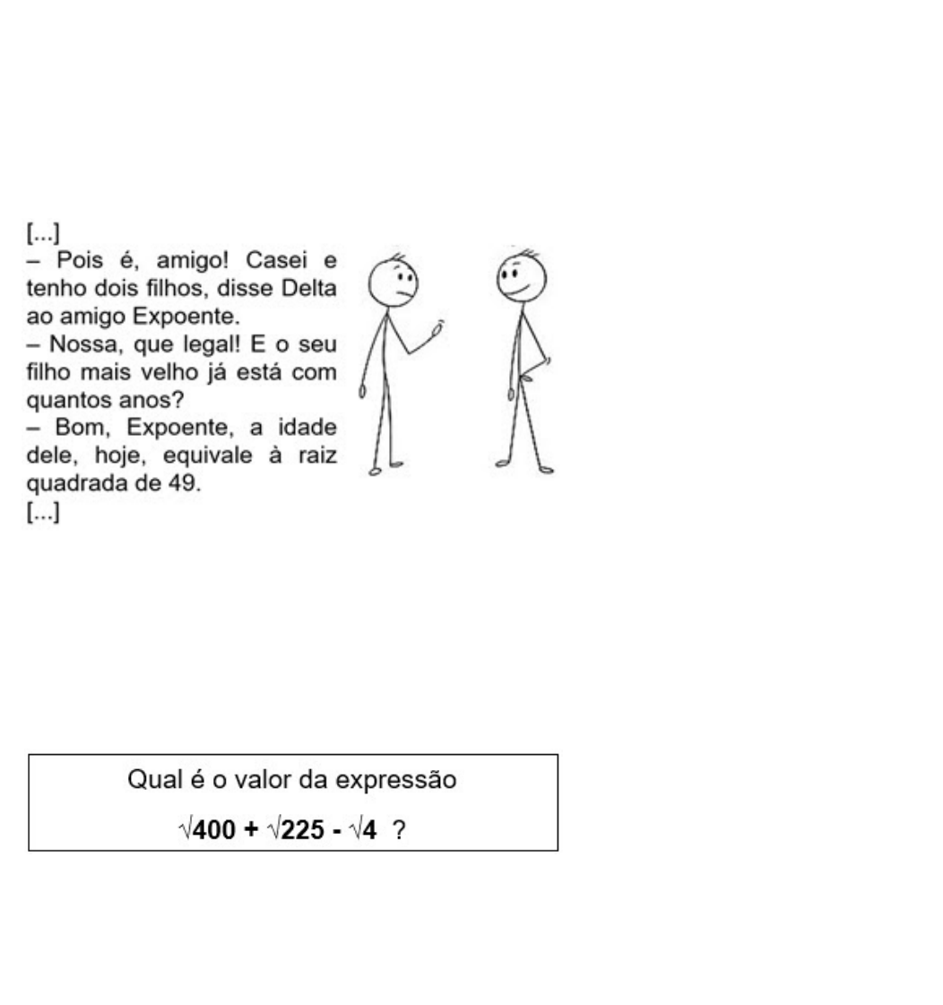 25/09/2023, 11:32 Atividade sobre Raiz Quadrada 6º ano e 7º ano https://www.tudosaladeaula.com/2023/05/atividade-sobre-raiz-quadrada-6-ano-e-7.html 1/1 5. Qual o valor da expressão √25 + √64? a) 5. b) 8. c) 9. d) 13. 6. Dois amigos matemáticos, “Delta” e “Expoente”, se encontraram depois de longos anos. Veja um trecho do diálogo entre eles: A idade do filho mais velho do Delta é a) 7. b) 9. c) 13. d) 17. 7. O professor de Samuel propôs o seguinte desafio: Qual deve ter sido a resposta de Samuel, sabendo que ele acertou o desafio? a) 63. b) 53. c) 33. d) 31. https://blogger.googleusercontent.com/img/b/R29vZ2xl/AVvXsEikRI_VZlRbNT9_b9U4sFQRXBl1LhGaNuipHuc2ygGQckAmpW8vUl9VF1Rj-RIBUCGKIMtAxoTYVCfSp8MsXLmW0jUpIznWGfDCzpClscI-ASeYE3hd9S4BhQtB5ceZ2DaFXaSnI40vL0TYXcNT4Dg0QdrkAWiK9FWMFePaQ57NiLrUkUqWE_GzyqPXTg/s332/3.jpg https://blogger.googleusercontent.com/img/b/R29vZ2xl/AVvXsEiIyu4OocK0DqvOavD_0p_SV9AZj-rPGqVmc_aozIvd5vTAdWRlAGi7P_5hriH_pfX6c_U7B8emlKfczJVpAo1MWD94umR_WcIQ9t6R6BZaSRFiiAU35xQnZwYxvDgABWTdDXwIgiMd8qlmgb3AQ1aW8iVLLdkZxOQWTHepbPec2XXUf0yl0vgeZzEhKA/s392/2.jpg