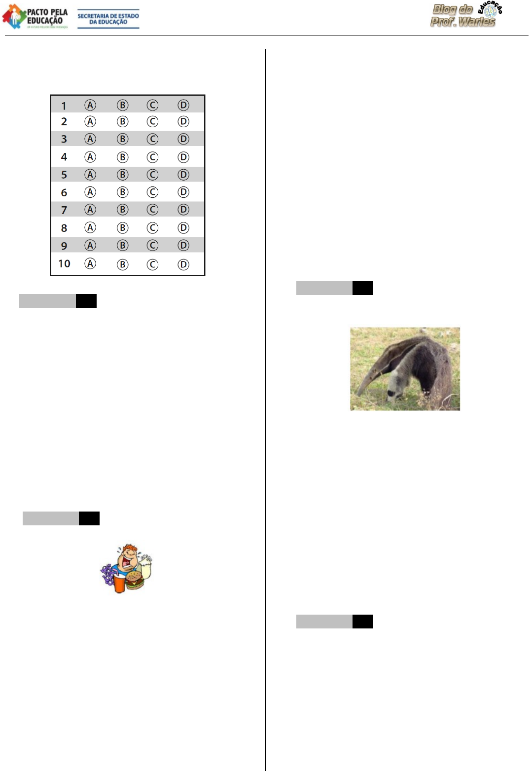 3ª 3ª Prova diagnóstica – 2014 – 4º Ano SEDUC-GO – Ciências – Ensino Fundamental ESCOLA: ________________________ Prof.:____________________________ Nome: ___________________________ D7 Questão 01 –––––––––––––––––––––––––––O As flores são as partes da planta que ajudam na reprodução e multiplicação das plantas. As flores de algumas espécies têm forma cor e cheiro que atraem pequenos animais que ajudam na reprodução. As partes das flores que, geralmente são coloridas, que tem a função de proteger os órgãos reprodutores da planta chamam-se A) broto B) pétala C) pólen D) sépala D12 Questão 02 –––––––––––––––––––––––––––O Leia atentamente. Analisando o tipo de dieta alimentar da população brasileira, um grupo de nutricionistas observou que, nos últimos tempos, cresceu muito o consumo de sanduíches, balas, doces, refrigerantes, biscoitos. Estes hábitos alimentares refletem diretamente no aumento de peso e na saúde das crianças. (http://crisete.bebeblog.com.br/11038/Criancas-gordas-ja-sao-odobro-das-desnutridas-diz-pesquisador/ Acesso em: 03/04/2014.) Em relação aos hábitos alimentares das crianças, podemos dizer que A) as balas e doces agradam as crianças, por isso devem ser usadas como incentivo na hora do lanche. B) as crianças queimam muitas calorias durante as brincadeiras, por isso podem consumir gordura em excesso. C) o consumo de guloseimas (balas, doces) é prejudicial à saúde das crianças, por isso, só devem ser vendida aos adultos. D) o consumo excessivo de sanduíches, balas, doces, refrigerantes, biscoitos aumenta o risco de problemas de saúde como colesterol e diabetes nas crianças e nos adultos. D5 Questão 03 –––––––––––––––––––––––––––O Observe a foto do tamanduá e leia as informações a seguir. Os tamanduás são muito comuns no Brasil, onde são conhecidos com os nomes de jurumim, tamanduá-mirim, tamanduá-bandeira etc. Alimentam-se de formigas e principalmente de cupins (térmitas), que retiram dos cupinzeiros com a sua longa língua (chega a ter 2 m de comprimento) alojada dentro de um focinho também afunilado. De acordo com os hábitos alimentares do tamanduá, na cadeia alimentar ele se classifica como: A) Consumidor. B) Decompositor. C) Herbívoro. D) Produtor. D4 Questão 04 –––––––––––––––––––––––––––O Os animais são divididos em duas grandes classificações: os animais vertebrados e os invertebrados. Os animais que compõem o grupo dos vertebrados A) possuem o corpo coberto de pelos. B) não tem ossos. C) possuem coluna vertebral. D) não possuem coluna vertebral. D5 Questão 05 –––––––––––––––––––––––––––O Leia o trecho da música abaixo, e em seguida, responda o que se pede: O melhor de Sá e Guarabyra. São Paulo: RCA,1987. Qual das alternativas é aquela que melhor se relaciona com o poema: A) O ser humano pode viver sem interferir na natureza B) A interferência do homem na natureza pode ser motivo de grandes prejuízos. C) O ser humano, como os demais seres vivos fazem parte da natureza. D) A relação do homem com a natureza sempre traz benefícios. D4 Questão 06 –––––––––––––––––––––––––––O O quati, a onça e o beija-flor são animais vertebrados, porque possuem: A) pelos. B) patas. C) coluna vertebral. D) penas. D3 Questão 07 –––––––––––––––––––––––––––O Fonte: http://www.escolakids.com/seres-vivos-e-seres-naovivos.htm O ser vivo é aquele que nascem, crescem, se reproduzem e morrem, como A) os animais e plantas. B) a terra e os animais. C) as plantas e a água. D) a água e a terra. D4 Questão 08 –––––––––––––––––––––––––––O Veja o peixinho a seguir. Fonte: http://www.estudopratico.com.br/animais-vertebrados-fotos-caracteristicas-e-classificacao/ O peixe é um animal vertebrado. Animais vertebrados são seres vivos que têm o organismo mais desenvolvido. Esses animais habitam os mais diversos ambientes, como o terrestre, aquático ou aéreo. Podemos avistar vertebrados em desertos, florestas, mares, etc. A principal característica dos vertebrados A) são os movimentos do corpo. B) é a coluna vertebral. C) é existência das pernas. D) é a capacidade de respiração. D5 Questão 09 –––––––––––––––––––––––––––O Observe a cadeia alimentar a seguir. Todos os seres vivos (animais, vegetais, microrganismos) relacionam-se direta ou indiretamente entre si, pois cada um alimenta-se de outro, e serve de alimento a um terceiro. Esta relação é chamada de cadeia alimentar. A cadeia alimentar é formada por A) plantas, consumidor e produtor. B) produtor, consumidor e decompositor. C) consumidor de primeira ordem e de segunda ordem. D) produtor. D6 Questão 10 –––––––––––––––––––––––––––O A maioria dos seres vivos dependem da luz do Sol para sobreviver. Os vegetais, por exemplo, só conseguem produzir seu alimento porque capturam a luz do sol e realizam A) a alimentação. B) a respiração. C) a fotossíntese. D) eliminação de água.
