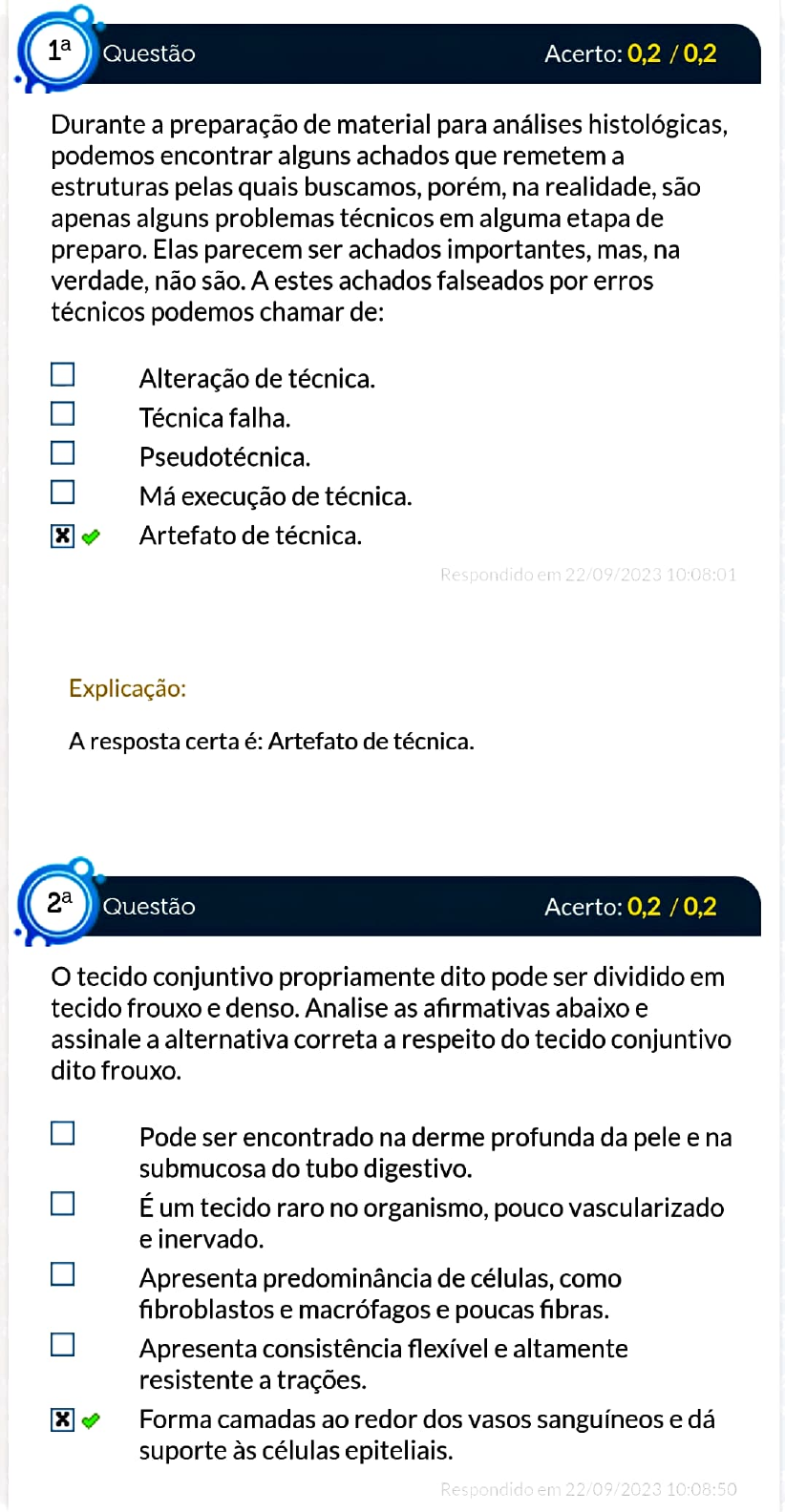 1a Questão Durante a preparação de material para análises histológicas, podemos encontrar alguns achados que remetem a estruturas pelas quais buscamos, porém, na realidade, são apenas alguns problemas técnicos em alguma etapa de preparo. Elas parecem ser achados importantes, mas, na verdade, não são. A estes achados falseados por erros técnicos podemos chamar de: Alteração de técnica. Técnica falha. Pseudotécnica. Má execução de técnica. Artefato de técnica. Explicação: Acerto: 0,2 /0,2 A resposta certa é: Artefato de técnica. 2a Questão Respondido em 22/09/2023 10:08:01 Acerto: 0,2 /0,2 O tecido conjuntivo propriamente dito pode ser dividido enm tecido frouxo e denso. Analise as afirmativas abaixo e assinale a alternativa correta a respeito do tecido conjuntivo dito frouxo. Pode ser encontrado na derme profunda da pele e na submucosa do tubo digestivo. É um tecido raro no organismo, pouco vascularizado e inervado. Apresenta predominância de células, como fibroblastos e macrófagos e poucas fibras. Apresenta consistência flexível e altamente resistente a trações. Forma camadas ao redor dos vasos sanguíneos e dá suporte às células epiteliais. Respondido em 22/09/2023 10:08:50 3a Questão Aprincipal característica do tecido ósseo secundário é a existência de fibras colágenas organizadas em lamelas concêntricas, estrutura denominada .No centro dessa estrutura, existe o que contém nervos e vasos sanguíneos. A comunicação desses complexos entre si, com a cavidade medular ea superfície externa se dá por Qual das alternativas abaixO Contém os termos que preenchem adequadamente e de maneira sequencial a sentença acima? Explicação: Osteons - canal de Harvers - canais de Volkmann. Sistema de Volkmann - canal de Volkmann - ósteons. Centro de ossificação - ósteon - canais de Harvers. Sistemas de Harvers - ósteon - canais de Volkmann. Östeons- canal de Volkmann -canais de Harvers. 4a Aresposta certaé: Osteons - canal de Harvers - canais de Volkmann. Questão Oligodendrócitos. Acerto: 0,2 /0,2 Astrócitos. São células de morfologia estrelada, com múltiplas projeções, que conectam os neurônios aos capilares sanguíneos e à pia-máter. Essas são características de quais células da glia? células de Schwann. Células ependimárias. Respondido em 22/09/2023 10.09:49 Micróglia. Acerto: 0,2 /0,2 Respondido em 22/09/2023 10:10:05 Questão A bexigae as vias urinárias são formadas por epitélios de transição, que são capazes de alterar a forma de suas células de acordo com o estado de contraçäão ou relaxamento do tecido. Quais são as formas das células da bexiga quando ela se encontra cheia de urinae vazia, respectivamente: Globosae achatada 6a Globosa e colunar Colunar e achatado Achatada e globosa Achatada e colunar Explicação: A resposta certa é: Achatada e globosa Acerto: 0,2 /0,2 Questão Respondido em 22/09/2023 10: 10:53 Acerto: 0,2 /0,2 Conhecida também como pituitária, a hipófise é uma glândula localizada na base do cérebro que tem as funções de regular o trabalho de muitas outras glândulas no corpo. Ela pode ser dividida em adeno-hipófise e neuro-hipófise. Assinale a alternativa que apresenta estruturas que fazem parte apenas da adeno-hipófise. Pars distalis, pars tuberalis e infundíbulo Pars distalis, pars tuberalis e pars nervosa Pars distalis, infundíbulo e pars nervosa Pars distalis, pars tuberalis e pars intermedia Pars distalis, pars intermediae pars nervosa Respondido em 22/09/2023 10:11:42 Questäo O processo de gastrulação é finalizado com a formação de um disco embrionário trilaminar. Esse disco é composto por 3 camadas, que juntas, formarão os órgãos rudimentares durante a organogênese. Qual das alternativas corresponde à região interna do disco embrionário trilaminar? ga Epiderme. Endoderma. Camada epiblástica interna. Mesoderma. Ectodernma. Explicação: A resposta certa é: Endoderma. Acerto: 0,2 /0,2 Questão Respondido em 22/09/2023 10:12:45 Acerto: 0,2 /0,2 O tecido conjuntivo possui três tipos de fibras: colágenas, reticulares e elásticas. A seguir são listadas algumas características dessas fibras. Assinale a alternativa que não caracteriza de forma correta essas fibras: As fibras reticulares são constituídas principalmente por colágeno do tipo Il, que formam uma extensae delicada rede. O colágeno do tipo IV representa um dos principais componentes da lâmina basal. O colágeno do tipo Iéomais abundante e amplamente distribuído no organismo. As fibras oxitalânicas não têm elasticidade, mas são altamente resistentes a forças de tração. As fibras oxitalânicas, elaunínicas e elásticas representam estágios sucessivos de desenvolvimento. Respondido em 22/09/2023 10:12:59 ga Questão Acerto: 0,0 /0,2 O tecido muscular representa um dos quatro tipos de tecido do corp0 e é responsável pelo movimento do corpo como um todo e pelas mudanças no tamanho e formato dos órgãos internos. A seguir, são listadas algumas características da contraç�o muscular. Assinale a alternativa que apresenta uma característica correta do processo de contração muscular. Durante a contração do músculo estriado, as miofibrilas se encurtam e causamo encurtamento de todo o sarcômero. No músculo liso, com o estímulo do sistema nervoso autônomo, os íons de cálcio migram do retículo sarcoplasmático para o sarcoplasma. Quandoa fibra do nervo motor recebe um impulso nervoso, seu terminal axônico libera norepinefrina que se associa a receptores do sarcolema. O sistema de túbulos transversais garante que a contração muscular se dê de maneira uniforme por todo o músculo. A contração tem fm quando a membrana do retículo transfere os íons de cálcio para o interior das suas cisternas, em um processo passivo. Explicação: Respondido em 22/09/2023 10:13:18 A resposta certa é:O sistema de túbulos transversais garante que a contração muscular se dê de manei