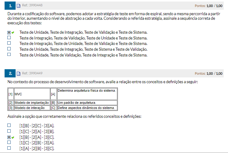 No contexto do processo de desenvolvimento de avalie a relação entre os conceitos e definições a seguir: Determina arquitetura do sistema [1] MVC [A] [2] Modelo de implantação [B] Um padrão de [3] Modelo de interação [C] Define aspectos dinâmicos do sistema Assinale a opção que corretamente relaciona os referidos conceitos e definições: