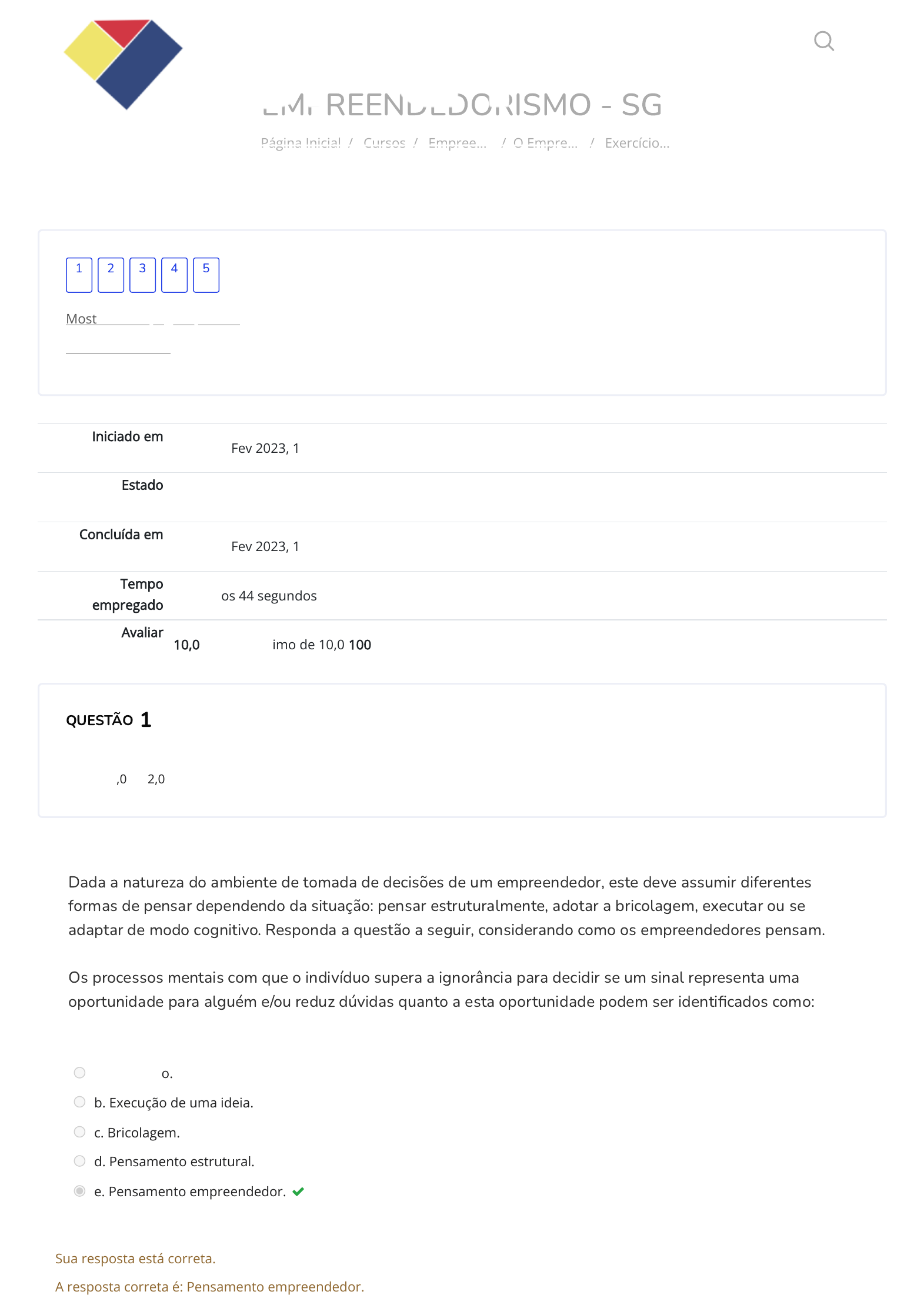 09/02/23, 16:41 Exercício de Fixação - O empreendedorismo e a mentalidade empreendedora: Revisão da tentativa https://cpetead.com.br/mod/quiz/review.php?attempt=3600267&cmid=40800 1/4 EMPREENDEDORISMO - SG Página Inicial / Cursos / Empree… / O Empre… / Exercício… Iniciado em quinta, 9 Fev 2023, 16:36 Estado Finalizada Concluída em quinta, 9 Fev 2023, 16:41 Tempo empregado 4 minutos 44 segundos Avaliar 10,0 de um máximo de 10,0(100%) QUESTÃO Correto Atingiu 2,0 de 2,0 Mostrar uma página por vez Terminar revisão 1 2 3 4 5 1 Dada a natureza do ambiente de tomada de decisões de um empreendedor, este deve assumir diferentes formas de pensar dependendo da situação: pensar estruturalmente, adotar a bricolagem, executar ou se adaptar de modo cognitivo. Responda a questão a seguir, considerando como os empreendedores pensam. Os processos mentais com que o indivíduo supera a ignorância para decidir se um sinal representa uma oportunidade para alguém e/ou reduz dúvidas quanto a esta oportunidade podem ser identi�cados como: Escolha uma opção: a. Efetuação. b. Execução de uma ideia. c. Bricolagem. d. Pensamento estrutural. e. Pensamento empreendedor. Sua resposta está correta. A resposta correta é: Pensamento empreendedor. https://cpetead.com.br/ https://cpetead.com.br/course/index.php https://cpetead.com.br/course/view.php?id=1816 https://cpetead.com.br/mod/quiz/view.php?id=40800 https://cpetead.com.br/mod/quiz/review.php?attempt=3600267&cmid=40800&showall=0 https://cpetead.com.br/mod/quiz/view.php?id=40800 https://cpetead.com.br/ 09/02/23, 16:41 Exercício de Fixação - O empreendedorismo e a mentalidade empreendedora: Revisão da tentativa https://cpetead.com.br/mod/quiz/review.php?attempt=3600267&cmid=40800 2/4 QUESTÃO Correto Atingiu 2,0 de 2,0 2 Geralmente, a ação empreendedora é intencional. Os empreendedores tencionam buscar certas oportunidades, entrar em mercados novos e oferecer novos produtos – e raramente esse processo é de conduta não intencional. As intenções capturam os fatores motivantes que in�uenciam um comportamento. Elas indicam a intensidade com que as pessoas desejam tentar, o quanto pretendem se esforçar para agir de uma determinada maneira. Em geral, quanto mais forte a intenção de se empenhar em um comportamento, maior será a probabilidade de praticá-lo. Marque a a�rmativa que se refere ao conceito de intenção empreendedora. Escolha uma opção: a. São percepções da capacidade pessoal de realizar determinado trabalho ou conjunto de tarefas b. São percepções de viabilidade de execução de um empreendimento. c. É uma avaliação favorável ou desfavorável dos possíveis resultados empreendedores. d. São convicções de que é possível executar com êxito o processo empreendedor. e. São fatores motivantes que in�uenciam as pessoas a buscarem resultados empreendedores. Sua resposta está correta. A resposta correta é: São fatores motivantes que in�uenciam as pessoas a buscarem resultados empreendedores. 09/02/23, 16:41 Exercício de Fixação - O empreendedorismo e a mentalidade empreendedora: Revisão da tentativa https://cpetead.com.br/mod/quiz/review.php?attempt=3600267&cmid=40800 3/4 QUESTÃO Correto Atingiu 2,0 de 2,0 QUESTÃO Correto Atingiu 2,0 de 2,0 3 Dornelas (2013) trata do tema do Empreendedorismo e da Mentalidade Empreendedora. Para ele, conforme apresentado nas discussões desta UA, o chamado Empreendedor de Oportunidade possui alguns motivadores para que ele desenvolva seu negócio. Indique qual a alternativa que contém SOMENTE motivadores para um Empreendedor de Oportunidade. Escolha uma opção: a. Ideia/descoberta/inovação, Missão de vida/quer deixar legado, Não tem acesso a oportunidade de trabalho formal b. Ganha recurso inesperado, Pós-carreira aposentadoria, Carece de conhecimento explícito. c. Convite, Busca sistemática (quer ganhar dinheiro, realização), Necessita de dinheiro para sobreviver d. Desejo de autonomia, Recebe herança/patrimônio, participa de sucessão de empresa familiar, Busca sistemática (quer ganhar dinheiro, realização) e. Necessita de dinheiro para sobreviver, Demissão/ desemprego, Desejo de autonomia Sua resposta está correta. A resposta correta é: Desejo de autonomia, Recebe herança/patrimônio, participa de sucessão de empresa familiar, Busca sistemática (quer ganhar dinheiro, realização) 4 No que se refere ao pensamento estrutural do empreendedor ao pensar um negócio, quando elementos básicos da tecnologia se assemelham aos elementos básicos do mercado, podemos a�rmar que existem: Escolha uma opção: a. Semelhanças estruturais. b. Semelhanças super�ciais. c. Oportunidade no mercado. d. Salto mental criativo. e. Pensamento empreendedor. Sua resposta está correta. A resposta correta é: Semelhanças super�ciais. 09/02/23, 16:41 Exercício de Fixação - O empreendedorismo e a mentalidade empreendedora: Revisão da tentativa https://cpetead.com.br/mod/quiz/review.php?attempt=3600267&cmid=40800 4/4 QUESTÃO Correto Atingiu 2,0 de 2,0 5 Abrir o seu próprio negócio é o desejo de muitas pessoas. Porém, nem todos conseguem lidar com os percalços que surgem ao longo da jornada até a abertura ou a consolidação do negócio. Apesar dessas di�culdades, a boa notícia é que os principais fatores que ocasionam essas di�culdades podem ser identi�cados, quando se investigam os conceitos que geram essas di�culdades ou quando se executam as ações que podem ser implementadas no dia a dia do negócio, a �m de possibilitar ao empreendedor êxito na sua atividade. Diante do exposto, leia e assinale a alternativa que se refere ao conceito de ação empreendedora: Escolha uma opção: a. Uma ação empreendedora está relacionada à criação de novos produtos/processos e/ou à entrada em novos mercados, que pode ocorrer apenas por meio de uma organização recém-criada. b. Uma ação empreendedora está relacionada à criaç