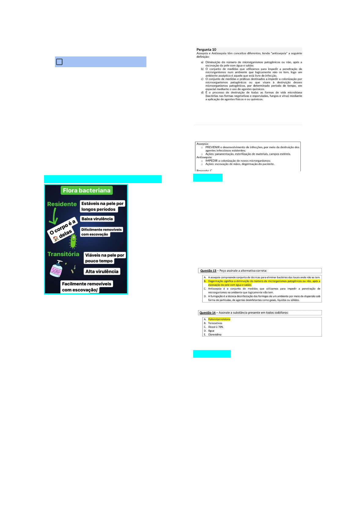 C�ÍNI�� CI�ÚR�I�� I/ IS����LA AF���� DE SO��� Semana 2: Assepsia e Antissepsia ● Via Direta de Contaminação – Transmissão via contato direto com o receptor. Ex: face, pele, vias respiratórias, gastrointestinais, feridas ● Via Indireta de Contaminação – Tem que ter um terceiro elemento – Portador – Terceiro Elemento –Receptor (contaminação do campo, por exemplo). Tem um terceiro elemento envolvido, indireta. (ar, poeira) FLORA TRANSITÓRIA E RESIDENTE ● Transitória: coloniza as camadas mais superficiais da pele, removível com lavagem rotineira das mãos, bactérias gram-negativas, sobrevivem curto periodo de tempo na pele, mas em alto potencial de patogenicidade -Pseudomonas aeroginosa / Escherichia coli. ● Residente: camadas mais profundas da pele (estafilococos coagulase-negativa) mais resistentes à remoção e quando perturbada, recompor prontamente Assepsia – Tentativa de manter o máximo possível o ambiente, a equipe e o doente livre de microrganismos potencialmente contaminantes, higienização preventiva. Prevenção de não contaminar o que não está contaminado, o que já está asséptico. Manobra realizada com o intuito de manter o doente e o ambiente cirúrgico livre de vermes Antissepsia – Desinfecção de um local potencialmente contaminado, visando a máxima redução possível de germes e bactérias. Processo físico e ou químico que elimina a maioria dos microorganismos patógenos de objetos inanimados e superfícies -Substâncias Antissépticas: São utilizadas para fazer a antissepsia, usamos para lavagem de mãos, paciente, etc -Sabões: compostos mais utilizados Sais de sódio ou potássio atuam com atividade C�ÍNI�� CI�ÚR�I�� I/ IS����LA AF���� DE SO��� bacteriana e bacteriostática, principalmente contra germes GRAM positivos e bacilos álcool-ácidos-resistentes, não atuam sobre GRAM negativos -Álcool etílico 70 a 90% OU isopropílico Gluconato de Clorexidina -Nunca se utiliza substância alcoólica em mucosas -Nunca se utiliza 2 tipos de sabões diferentes em um tipo de lavagem - pode inativar ● PVPI 10% (polivinilpirrolidona-iodo) -Potencial diminui em substâncias alcalina (matérias orgânicas) ● Clorexidina 4% -Baixo potencial de toxicidade e fotossensibidade -Rápida ação bactericida (15 seg) Exemplo ⁃ Antes de entrar na sala de cirurgia o cirurgião fez sua escovação associada ao uso de iodopovidona ( antissepsia) Após entrar na sala de cirurgia foi paramentado pela instrumentadora com o capote cirúrgico e luvas estéreis(Assepsia) A seguir, fez a degermação do paciente com clorexidina ( Antissepsia) LIMPEZA E ESTERILIZAÇÃO DO INSTRUMENTAL CIRÚRGICO - empacotamento após a esterilização é mantido intacto até o uso da reesterlização porque tem uma data de validade dependendo do tipo de Autoclave 》》Processo Manual - Os instrumentos são lavados com água e detergente, escovando cada um deles sobre água corrente com uso de substância isoenzimática (substância capaz de ter um poder semelhante a enzimas que vão degradas os produtos do nosso próprio corpo) 》》Processo por Ultrassom - Imersão dos instrumentos em tanque de água com alta frequência + detergentes, sendo imersos em um outro tanque aquecido a 76° 》》Esterilização por Calor Seco infravermelho, Fornos,estufas, 》》Esterifização por Calor Úmido - Fervura e vapor sob pressão, autoclaves C�ÍNI�� CI�ÚR�I�� I/ IS����LA AF���� DE SO��� Sem��� 3: Es�o��ção da� mãos ● 3-5 minutos paraa primeira lavagem do dia. ● 2-3 minutos para as seguintes. • Enxugar as mãos com toalha estéril • Não misturar dois antissépticos diferentes (um pode inativar o outro) ▪TOCA, MÁSCARA E ÓCULOS: Vestir antes da lavagem das mãos 》》A escovação das mãos deverá ser realizada SEMPRE que: ▪ Antes e depois de tocar no paciente ▪ Antes de realizar procedimento limpo/asséptico ▪ Após risco de exposição a fluidos corporais ▪ Após contato de superfícies próximas ao paciente Sem��� 3: eq���e ci�úr�i�� e se����nça do pa����te 1) Preparo do Paciente ▪Paciente deve tomar banho no dia da cirurgia, véspera, incluindo lavagem de cabelos com atenção especial para axilas e genitálias ▪Não raspar os pelos em casa antes da cirurgia – isso é feito na hora da cirurgia no centro cirúrgico ▪Tricotomia Deve ser realizado no dia da intervenção( 15 min antes), preferencialmente pelo próprio centro cirúrgico (devido a chances de causar foliculite ou infecção inicial de pequenos cortes) que pode haver C�ÍNI�� CI�ÚR�I�� I/ IS����LA AF���� DE SO��� regeneração de pelos e aumento do risco de infecção. - a tricotomia não é necessária para todos os tipos de cirurgias. - tricotomia deve ser realizada antes da antissepsia da pele, para que os pelos não atrapalhem a aplicação dos antissépticos e reduzam a eficácia da limpeza. -Utilizando lâmina descartável e estéril, evitar cortes e arranhões • Paciente entra no centro cirúrgico, retira toda sua roupa e coloca uma roupa apropriado do CC • Não deve adentrar ao CC com lençóis ou roupa da enfermaria • Trocar de maca • Local a ser operado vai ser lavado na sala de cirurgia com detergente antisséptico • Deve ser vedada a entrada do CC de qualquer pessoa com lesões abertas, potencialmente contaminadas, incluindo médicos, enfermeiros, estudantes, auxiliares.. •Paciente com uma ferida/infecção em algum local do corpo, mesmo longe do campo, quando eletiva, não é realizada. ▪Preparo da pele -LIMPEZA GROSSEIRA -ASSEPSIA. -ANTISSEPSIA. -COLOCAÇÃO DE CAMPOS -CIRURGIA. ANTISSEPSIA PROPRIAMENTE DITA: Realizada logo após a degermação, usando solução antisséptica na sua formulação alcoólica ou aquosa. Devem-se ter os mesmos cuidados utili