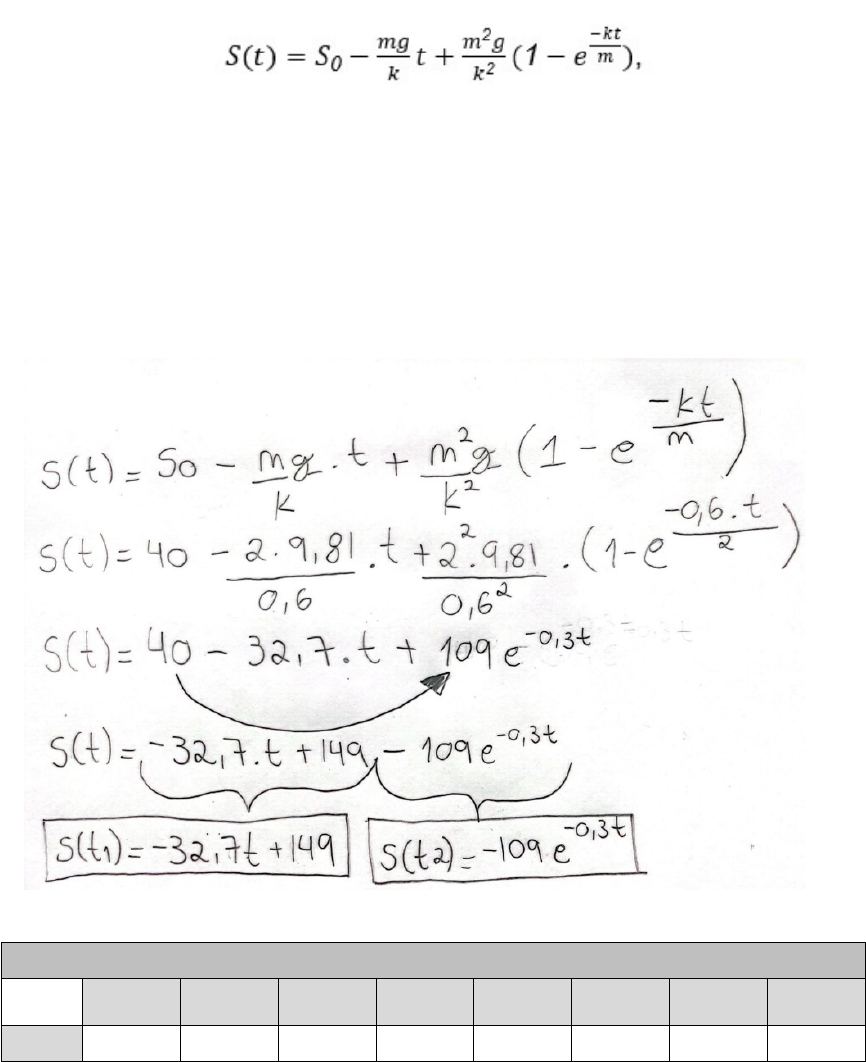 Aluno:Kleison W. R. Viana Curso: Engenharia de Produção Polo: Anhembi Morumbi Piracicaba Atividade 1 - CÁLCULO NUMÉRICO COMPUTACIONAL Um objeto de massa m é abandonado de um altura S0 em relação ao solo. Após t segundos a sua altura S(t) pode ser calculada pela expressão a seguir: em que k é o coeficiente da resistência do ar e G é a aceleração da gravidade. Fazendo m = 2 kg, S0 = 40m, k = 0,6 kg/s e g= 9,81m/s² use o método gráfico para isolar a raiz e, posteriormente, calcule o tempo que o objeto leva para atingir o solo utilizando o método da bisseção, com a tolerância e ≤ 0,001. Respostas 1º Separar função S em 2 funções ST1 e ST2 R: Tempo t 0 seg 1 seg 2 seg 3 seg 4 seg 5 seg 6 seg 7 seg S(t1) 149 117 85 53 21 -11 -43 -75 S(t2) 109 81 60 44 33 24 18 13 2º Gráfico: R: 3º Cálculo de interação e Cálculo da raiz de tolerância: R: 4º Método da bisseção, com a tolerância e ≤ 0,001. R: O tempo para o objeto atingir o solo é de 3,4795 segundos n a b X F(x) En 0 3 4 3,5 -11.432 1 3,5 3 3,25 3,8869 0,25 2 3,5 3,25 3,375 1,3993 0,125 3 3.5 3,375 3,4375 0,13499 0,0625 4 3,5 3,4375* 3,4688 -0,5025 0,0313 5 3,4688 3,5 3,4844g -0,8224 0,0156 6 3,4844 3,4688 3,4766a -0,6624g 0,0078 7 34.766 3,4844 3.4805g -0,7424 0,0039 8 3,4805 3,4766 3,4785 -0,7024 0,002 9 3,4785 3,4805 3,4795g -0,7224 0,001 Gráfico Analítico dos eixos t t Tempo 0 1 2 3 4 5 6 7 S(t1) Tempo 149 117 85 53 21 -11 -43 -75 S(t2) Tempo 109 81 60 44 33 24 18 13