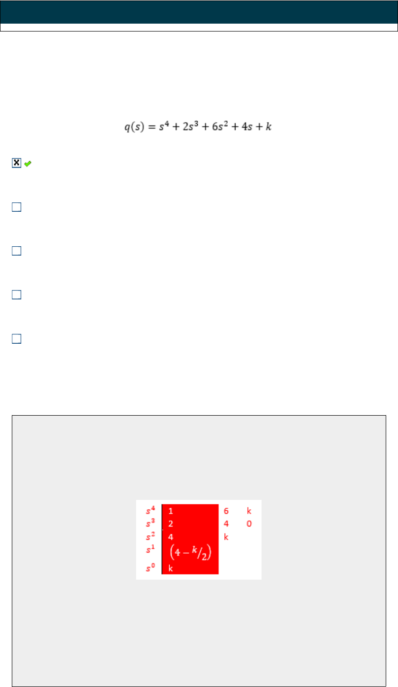 1a Questão Acerto: 0,2 / 0,2 Assegurar a estabilidade em um sistema é uma questão fundamental em qualquer projeto de sistema de controle. O critério de estabilidade de Routh-Hurwitz é uma metodologia fundamental para analisar a estabilidade de sistemas dinâmico lineares. Observando o polinômio característico abaixo, é possível definir que o sistema será estável para: 0<k<80<�<8 k<0�<0 k<8�<8 8<k<08<�<0 k>8�>8 Respondido em 26/09/2023 16:06:21 Explicação: Gabarito: 0<k<80<�<8 Justificativa: Através do critério de estabilidade de Routh Hurwitz é possível montar a seguinte tabela de Routh para o polinômio: Para a linha s1�1 é possível observar que para que não haja mudança de sinal (4−k/2)>0(4−�/2)>0, então: k<8�<8 Para a linha s0�0 é possível observar que para que não haja mudança de sinal k>0�>0 Então: 0<k<80<�<8 2a Questão Acerto: 0,2 / 0,2 A representação matemática de um sistema físico que relaciona a sua entrada com a sua saída é definida como função de transferência. Considerando a função de transferência abaixo como a de um circuito resistor, indutor e capacitor (RLC), é possível afirmar que a mesma é de: ordem 1 sem ordem ordem 2 ordem 5 ordem 4 Respondido em 26/09/2023 16:03:56 Explicação: Gabarito: ordem 2. Justificativa: A função de transferência definida pelo circuito é dada por: Assim, é possível identificar que a equação que compõe o denominador é de grau 2 (maior grau da equação), definindo dessa maneira que o sistema é de ordem 2. 3a Questão Acerto: 0,2 / 0,2 O desenvolvimento de sistemas de automação e controles de processos físicos depende de sua representação no espaço de estado por meio do conhecimento de todas as variáveis envolvidas. Para que a conversão de espaço de estado em função de transferência seja possível, é fundamental a determinação do termo (sI−A)−1(��−�)−1. O determinante da matriz sI−A��−� é dado por: s2+2�2+2 2s+22�+2 s2+2s+2�2+2�+2 s+2s+2�+2�+2 s2+2s�2+2� Respondido em 26/09/2023 16:25:07 Explicação: Gabarito: s2+2s+2�2+2�+2 Justificativa: Observando as matrizes de espaço de estado é possível definir que (sI−A)(��−�): 4a Questão Acerto: 0,2 / 0,2 A análise de um sistema pode ser realizada se o modelo matemático que define seu sistema físico, por meio de uma função de transferência, for conhecido. Dessa forma, seu desempenho pode ser avaliado em função do estimulo recebido, ou seja, resposta a entrada. Considerando o diagrama em blocos da figura abaixo, para uma resposta em degrau unitário, no instante t=2s, a saída será igual a: Fonte: YDUQS - Estácio - 2021. 0,777 0,865 0,632 0 0,393 Respondido em 26/09/2023 16:11:39 Explicação: 5a Questão Acerto: 0,2 / 0,2 A posição dos pólos de uma função de transferência em malha aberta pode fornecer indícios da situação de estabilidade ou instabilidade de um sistema. A complementação da definição de estabilidade de um sistema pode ser realizada através do seu diagrama de Nyquist. Observando o diagrama apresentado na figura abaixo, pode-se afirmar que o sistema: Fonte: YDUQS, Estácio - 2021 estável pois N+P=0�+�=0 saída. estável pois o diagrama de Nyquist está no semi-plano direito. estável pois seu diagrama de Nyquist envolve o pólo −1+j0−1+�0. instável pois N+P≠0�+�≠0. instável pois o diagrama de Nyquist está no semi-plano direito. Respondido em 26/09/2023 16:12:46 Explicação: Gabarito: estável pois N+P=0�+�=0 saída. Justificativa: Como os pólos estão localizados no semi-plano esquerdo e no eixo imaginário (P=0�=0). Além disso, é possível observar que o pólo −1+j0−1+�0 não é envolvido pelo diagrama de Nyquist. Dessa maneira N=0�=0 Assim, é possível definir que N+P=0�+�=0. Logo, o sistema é estável. 6a Questão Acerto: 0,2 / 0,2 Assegurar a estabilidade em um sistema é uma questão fundamental em qualquer projeto de sistema de controle. O critério de estabilidade de Routh-Hurwitz é uma metodologia fundamental para analisar a estabilidade de sistemas dinâmico lineares. De acordo com a Tabela de Routh que representa a simplificação da tabela do polinômio abaixo, é possível afirmar que o sistema descrito por esse polinômio apresenta: 2 pólos no semiplano direito 1 pólo no semiplano direito 1 pólo no semiplano esquerdo 2 pólos na origem do sistema 2 pólos no semiplano esquerdo Respondido em 26/09/2023 16:07:18 Explicação: Gabarito: 2 pólos no semiplano direito Justificativa: Como o sistema apresenta 2 mudanças de sinal, é possível concluir que o mesmo apresenta 2 pólos no semiplano direito. Ainda seria possível determinar os pólos do polinômio: 7a Questão Acerto: 0,2 / 0,2 A representação matemática de um sistema físico que relaciona a sua entrada com a sua saída é definida como função de transferência. O circuito RC da figura abaixo apresenta uma composição formada por 2 resistores divisores de tensão e um capacitor. Considerando a função de transferência abaixo como a do circuito, é possível afirmar que a mesma é de: Fonte: YDUQS - Estácio - 2021 sem ordem ordem 3 ordem 4 ordem 2 ordem 1 Respondido em 26/09/2023 16:23:03 Explicação: Gabarito: ordem 1. Justificativa: A função de transferência definida pelo circuito é dada por: Assim, é possível identificar que a equação que compõe o denominador é de grau 1 (maior grau da equação), definindo dessa maneira que o sistema é de ordem 1. 8a Questão Acerto: 0,2 / 0,2 O desenvolvimento de sistemas de automação e controles de processos físicos depende de sua representação no espaço de estado por meio do conhecimento de todas as variáveis envolvidas. O subconjunto de variáveis de um sistema físico que permite conhecer o comportamento de um sistema e é definido a partir de todas as variáveis do sistema é definido como: variável de entrada variável de 