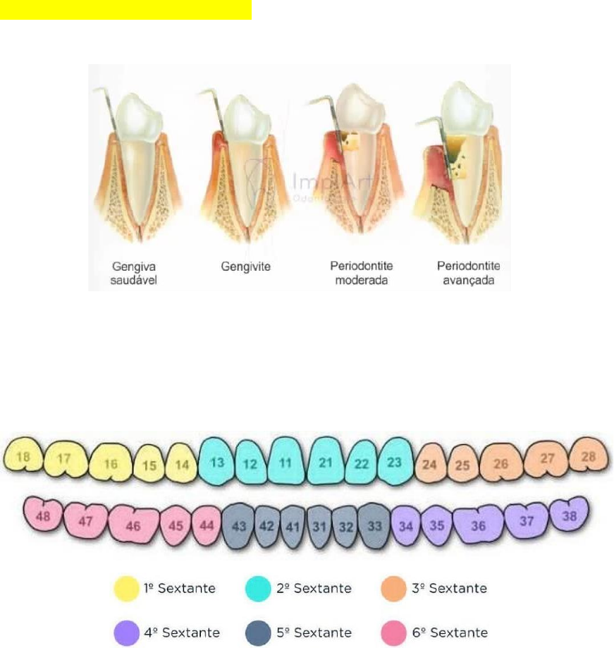 FUNDAMENTOS DE PERIODONTIA Tratamento da doença periodontal Sempre inicia o tratamento do paciente com raspagem. Nas raspagens supragengivais, geralmente, não precisam de anestesia. Já nas raspagens subgengivais possa ser que haja a necessidade de anestesia. As sessões do tratamento periodontal depende do paciente. Via de regra, os pacientes têm mais cálculos no 5º sextante e algumas partes linguais na arcada inferior. De maneira geral é no 4°, 5° e 6° sextante. Raspagem supragengival é na coroa clínica do paciente. Enquanto estiver vendo cálculo, pigmentação, alteração de cor no dente, tem que raspar. Quando a gengiva está inflamada e não tem perda óssea, tem-se bolsas falsas, isso não é caso de raspagem subgengival, é supragengival (no PSR coloca o numero que der na hora que mediu a bolsa, mesmo que seja uma falsa bolsa); o PSR é feito do jeito que o paciente estiver, não precisa limpar igual é no Odontograma. Raspagem subgengival é quando tem bolsa, profundidade de sondagem. Para fazer o PSR sempre usa, idealmente, a sonda Carolina do Norte. Faz a sondagem, de dente por dente, e a pior nota do sextante é a nota do PSR. Quando o paciente tem profundidade 3mm ou 4mm, é interessante realizar o Periograma com a sonda Carolina do Norte. Consegue colher mais detalhes a respeito dos dentes. Periograma // profundidade de sondagem, recessão gengival, nível de inserção clínica, mobilidade dentária, envolvimento de furca Perda de inserção clínica: Parâmetro clínico obtido quando o procedimento de sondagem periodontal estima a perda de suporte periodontal. • Profundidade de sondagem: Distância entre a margem gengival e a porção mais apical sondável. • Recessão gengival: Deslocamento apical da margem gengival apical a junção amelocementária. • NIC: medida que corresponde a distância da junção amelocementária (PS + RG) Mobilidade dentária: Movimento < 1mm no sentido horizontal, movimento >1 no sentido horizontal e movimento horizontal e vertical. Envolvimento de furca: Avalia se a sonda entra até 3mm, se entra mais do que 3mm ou se atravessa o dente. Os índices 3 e 4 no PSR estão diretamente associados com os pacientes que tenham quadro de periodontite. Tratamento inicial da doença periodontal Terapia periodontal não cirúrgica A fase inicial do tratamento periodontal é a raspagem supra e subgengival se for o caso. Faz profilaxia, raspagem e instrução de higiene bucal. Só deve usar clorexidina e antibióticos em casos específicos como em situações necrosantes, pós-cirúrgicos. Raspagem dental: Processo clínico por meio do qual se elimina o biofilme, cálculose e pigmentos da superfície dental a partir do epitélio juncional. Raspagem e alisamento radicular (supra e subgengival): São considerados como padrão ouro para se alcançar e manter a saúde periodontal por eliminação do biofilme bacteriano. O debridamento mecânico do biofilme e a eliminação de fatores irritantes locais são as bases de terapias iniciais periodontais. A raspagem exercida abaixo da margem gengival em região de bolsa periodontal é denominada raspagem subgengival (quando tem bolsa; para ser raspagem subgengival tem que ter profundidade de sondagem maior que 3mm). O cálculo supragengival é clinicamente visível coronal à margem gengival. O tratamento para sua remoção denomina-se raspagem supragengival. Existe a fase de manutenção de terapia periodontal que é o acompanhamento de tempos em tempos. O kit exame clínico é composto pelo espelho clínico, sonda exploradora, pinça e sonda OMS. Material de raspagem: Cureta Gracey 5/6 para dentes anteriores e pré-molares e Foice Morse 0/00. Cureta Gracey 7/8 para superfície vestibular e lingual de dentes posteriores; Cureta Gracey 11/12 para mesial de dentes posteriores; Cureta Gracey 13/14 para distal de dentes posteriores. Cálculo gengival: O cálculo supragengival é clinicamente visível coronal à margem gengival, sendo resultado do nível de depósitos bacterianos nos dentes, mas também influenciado pela secreção da glândula salivar (maior acúmulo na região de saída das glândulas salivares). O cálculo supragengival pode variar na cor, de branco a castanho escuro, dependendo da coloração das substâncias alimentícias. O cálculo subgengival predominantemente como uma associação dos produtos bacterianos com o fluido crevicular e células sanguíneas, não é normalmente visível clinicamente; O cálculo subgengival com frequência apresenta-se castanho ou preto, o que reflete a presença de produtos bacterianos ou de sangue; Estudos observam uma forte associação entre o fumo e cálculo subgengival. Terapia periodontal cirúrgica A raspagem em campo aberto é um tratamento reparador, que permite acesso direto às raízes através da confecção de um retalho. Assim, a remoção dos irritantes torna-se facilitada e o prognóstico é mais favorável, principalmente para furcas grau II e III.