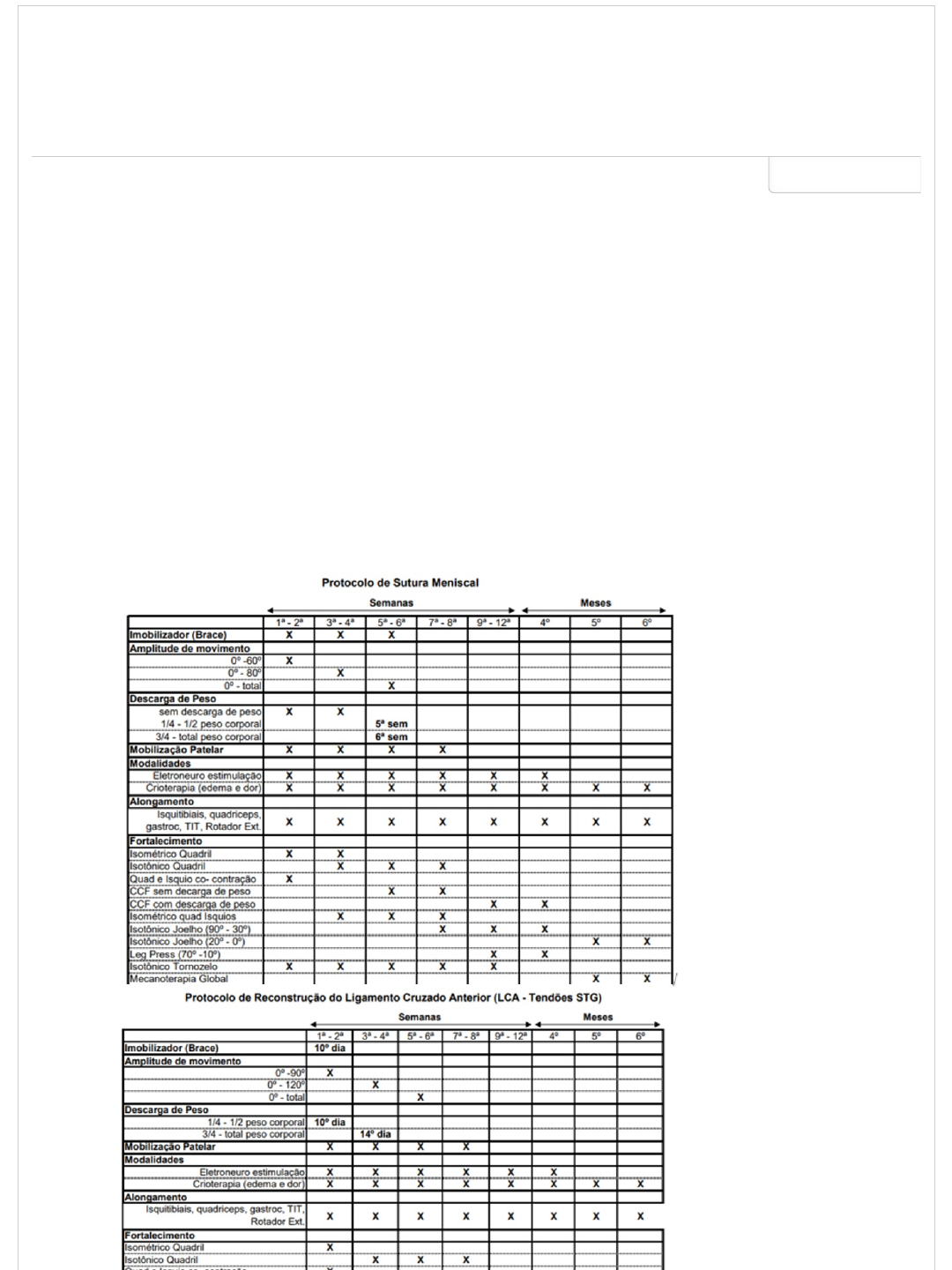 PERGUNTA 1 Uma mulher de 24 anos lesionou seu joelho direito há quinze dias durante uma viagem de férias, enquanto esquiava. Na viagem foi avaliada por um médico clínico geral, o qual recomendou medicação anti-in�amatória e crioterapia. Já no Brasil, passou por um ortopedista e após a realização da ressonância magnética o mesmo optou pela indicação da cirurgia de sutura meniscal e substituição do LCA com enxerto de semitendíneo e grácil. Após a cirurgia esta paciente foi encaminhada para a sua clínica na 1ª semana de pós-operatório. De acordo com a evolução do protocolo de tratamento abaixo para esta paciente quanto à analgesia, trabalho de mobilização, fortalecimento, descarga de peso e treino de marcha, analise qual das alternativas abaixo apresenta as indicações de tratamento adequadas ao momento atual do pós-operatório em que a paciente se encontra. Considere que esta paciente foi submetida a dois tipos de cirurgia e que você deverá levar em conta o protocolo mais restritivo. 0,5 pontos Firefox https://ava.ead.unip.br/webapps/assessment/take/launch.jsp?course_ass... 1 of 9 26/09/2023, 13:55 a. b. c. d. e. Fonte:http://www.clinicaecirurgiadojoelho.com.br/ Paciente está liberada para a amplitude máxima de �exão e extensão de joelho conforme a sua tolerância, descarga de peso parcial no membro operado e exercícios isométricos para os músculos do quadril e quadríceps com eletroestimulação funcional. Paciente está liberada para amplitude de �exão de joelho até 90 graus, extensão completa de joelho, descarga de peso parcial e exercícios isométricos para os músculos do quadril e quadríceps com eletroestimulação funcional. Paciente está liberada para amplitude de �exão de joelho até 60 graus, extensão completa de joelho, marcha de 3 pontos e exercícios isotônicos de quadríceps e quadril com eletroestimulação funcional. Paciente está liberada para amplitude completa de �exão conforme a tolerância, extensão completa, sem descarga de peso e exercícios isométricos para quadril e quadríceps com eletroestimulação funcional. Paciente está liberada para amplitude de �exão de joelho até 60 graus, extensão completa, marcha de 3 pontos, exercícios de fortalecimento isométricos para quadril e quadríceps com eletroestimulação funcional. PERGUNTA 2 Paciente WLS, 42 anos, foi submetido a uma cirurgia de artroplastia total de quadril à esquerda com colocação de prótese híbrida, devido à história de necrose avascular da cabeça de fêmur (imagem da cabeça do fêmur retirada na cirurgia abaixo), a qual foi descoberta após o paciente relatar dores na parte anterointerna de quadril, associada à claudicação na marcha e quando permanecia por longos períodos na posição sentada. Na época teve que interromper a prática de corrida devido à dor e mesmo fazendo a �sioterapia não obteve melhora. Foi então que o ortopedista lhe solicitou a ressonância magnética na qual foi con�rmado o diagnóstico de necrose avascular, sendo encaminhado para a cirurgia. Você foi indicado para atender este paciente a domicílio e iniciou a �sioterapia com ele na terceira semana de pós-operatório. Qual das alternativas abaixo descreve corretamente o tipo de cirurgia realizada e representa a conduta mais coerente com os cuidados pós-operatórios recomendados? 0,5 pontos Firefox https://ava.ead.unip.br/webapps/assessment/take/launch.jsp?course_ass... 2 of 9 26/09/2023, 13:55 http://www.clinicaecirurgiadojoelho.com.br/ http://www.clinicaecirurgiadojoelho.com.br/ http://www.clinicaecirurgiadojoelho.com.br/ http://www.clinicaecirurgiadojoelho.com.br/ a. b. c. d. A prótese híbrida, conforme observada na radiogra�a, apresenta o encaixe femoral com cimento e o acetabular �xado com parafuso, requer nesta fase descarga parcial de peso e deambulação com muletas. A �sioterapia deverá mobilizar passivamente o quadril do paciente em todas as direções conforme amplitude tolerada pelo paciente e realizar exercícios isométricos para MMII. A prótese híbrida, conforme observada na radiogra�a, apresenta o encaixe femoral e acetabular �xados com cimento, permite descarga total de peso e deambulação com bengala contralateral à cirurgia. A �sioterapia deverá mobilizar passivamente o quadril do paciente em todas as direções conforme amplitude tolerada pelo paciente e realizar exercícios isométricos para MMII. A prótese híbrida conforme observada na radiogra�a apresenta o encaixe femoral com cimento e o acetabular �xado com parafuso, requer nesta fase descarga parcial de peso e deambulação com muletas. A �sioterapia deverá mobilizar passivamente o quadril do paciente em �exão, extensão e abdução máximas de quadril conforme tolerância do paciente, sendo contraindicadas as amplitudes de adução e rotações e realizar exercícios isométricos para MMII. A prótese híbrida, conforme observada na radiogra�a, apresenta o encaixe femoral e acetabular com cimento, requer nesta fase descarga parcial de peso e deambulação com muletas. A �sioterapia deverá mobilizar passivamente o quadril do paciente em �exão até 90 graus, extensão e abdução máximas de quadril conforme tolerância do paciente, sendo contraindicadas as amplitudes de adução e rotações e realizar exercícios isotônicos para MMII e apenas isometria para o glúteo médio. Firefox https://ava.ead.unip.br/webapps/assessment/take/launch.jsp?course_ass... 3 of 9 26/09/2023, 13:55 e. A prótese híbrida, conforme observada na radiogra�a, apresenta o encaixe femoral com cimento e o acetabular �xado com parafuso, requer nesta fase descarga parcial de peso e deambulação com muletas. A �sioterapia deverá mobilizar passivamente o quadril do paciente em extensão e abdução máximas de quadril conforme tolerância do paciente, sendo contraindicada as amplitudes de adução além da linha média, �exão maior que 90 