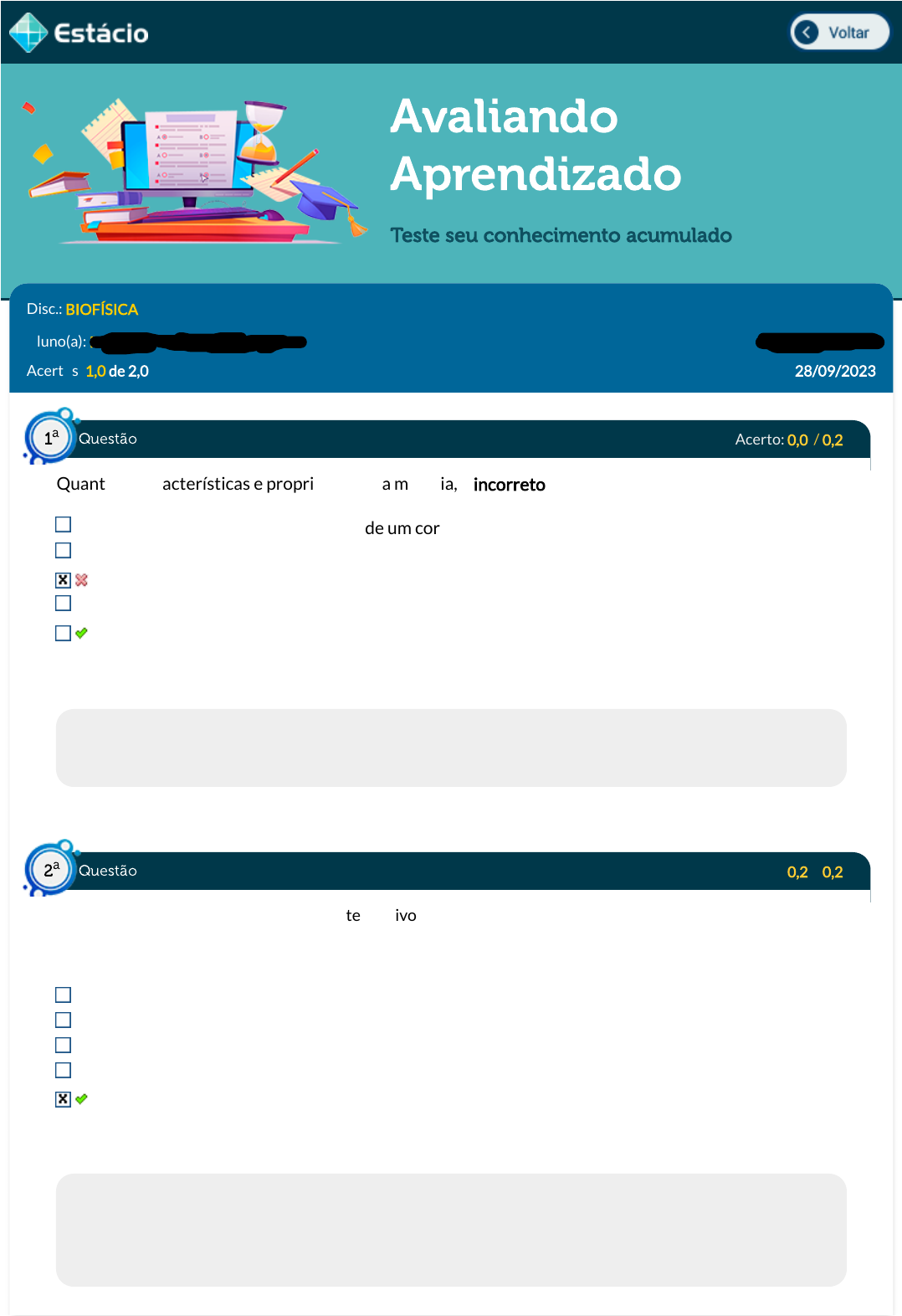 28/09/2023, 14:10 Estácio: Alunos https://simulado.estacio.br/alunos/ 1/6 Avaliando Aprendizado Teste seu conhecimento acumulado Disc.: BIOFÍSICA Aluno(a): ROSANA ALENCAR OLIVEIRA 201502822776 Acertos: 1,0 de 2,0 28/09/2023 Acerto: 0,0 / 0,2 Quanto às características e propriedades da matéria, é incorreto a�rmar que: Massa é a quantidade de matéria de um corpo Ao dividir a massa de um corpo por seu volume, calculamos a densidade Volume é o espaço ocupado por um corpo Íons são átomos que perderam ou ganharam elétrons Um átomo apresenta um núcleo composto por prótons e elétrons. Respondido em 28/09/2023 10:42:49 Explicação: A resposta correta é: Um átomo apresenta um núcleo composto por prótons e elétrons. Acerto: 0,2 / 0,2 A difusão facilitada é um tipo de transporte passivo de substâncias pela membrana em que não há gasto de energia, onde as moléculas são transportadas do meio concentrado para menos concentrado. Para que esse transporte ocorra, é necessária a ação de: um glicídio carreador. um ácido graxo transportador. um lipídio facilitador. um carboidrato transportador. uma proteína carreadora. Respondido em 28/09/2023 10:44:40 Explicação: A difusão facilitada ocorre por canais proteicos, que são seletivamente permeáveis a determinadas substâncias, e podem ser abertos ou fechados por comportas. Essas comportas podem ser reguladas por voltagem (sinais elétricos) ou por agentes químicos (dependentes de moléculas ligantes). Questão1 a Questão2 a https://simulado.estacio.br/alunos/inicio.asp https://simulado.estacio.br/alunos/inicio.asp javascript:voltar(); javascript:voltar(); 28/09/2023, 14:10 Estácio: Alunos https://simulado.estacio.br/alunos/ 2/6 Acerto: 0,0 / 0,2 As ondas eletromagnéticas também podem sofrer fenômenos como re�exão, refração e interferência, que são explorados em diversas tecnologias modernas. Como podemos de�nir as ondas eletromagnéticas? Nenhuma das anteriores Ondas que se propagam através de um meio material Ondas que são geradas por campos elétricos e magnéticos Ondas que se propagam através do espaço vazio Ondas que são produzidas por fontes sonoras Respondido em 28/09/2023 10:45:18 Explicação: As ondas eletromagnéticas são ondas que não precisam de um meio material para se propagar, podendo se propagar através do espaço vazio Acerto: 0,2 / 0,2 Considere um corpo se movendo a uma velocidade de 10 m/s. Isso signi�ca que, após 1 minuto, esse corpo terá percorrido uma distância de: 600 km. 600 m. 10 m. 9 m. 6.000 m. Respondido em 28/09/2023 10:45:42 Explicação: A resposta correta é: 600 m. Acerto: 0,0 / 0,2 Além das artérias e veias que são essenciais para circulação, temos a microcirculação com auxílio dos capilares sanguíneos que contribuem para transporte de nutrientes e oxigênio para tecido. É através dos poros na membranas dos capilares que ocorre a troca de nutrientes com o meio intersticial, nesses ambientes os líquidos se movem através das forças de Starling. A força que faz pressão no líquido para dentro dos capilares é denominada de: Pressão Capilar. Pressão plasmática capilar. Pressão coloidosmótica do líquido intersticial. Pressão coloidosmótica plasmática capilar. Pressão do líquido intersticial. Respondido em 28/09/2023 10:46:02 Questão3 a Questão4 a Questão5 a 28/09/2023, 14:10 Estácio: Alunos https://simulado.estacio.br/alunos/ 3/6 Explicação: O meio intersticial é o meio entre as células e contém cerca de 1/6 do volume corporal. Esse meio é composto basicamente por feixes de �bras de colágeno e �lamentos de proteoglicanos - estes retêm o líquido intersticial. No sangue, também encontramos líquido na forma de plasma. Nesses ambientes, o líquido se move de acordo com as chamadas forças de Starling. Pressão do líquido intersticial: Pressão que força o líquido para dentro dos capilares. Acerto: 0,2 / 0,2 Energia mecânica é um tipo de energia diretamente envolvida com o trabalho mecânico, ou seja, o movimento. Ela é a soma de dois tipos especí�cos de energia, a saber: Energia elástica e energia gravitacional Energia cinética e energia potencial Energia cinética e energia sonora Energia cinética e energia dinâmica Energia sonora e energia potencial Respondido em 28/09/2023 10:47:34 Explicação: A resposta correta é: Energia cinética e energia potencial Acerto: 0,2 / 0,2 (Adaptada - UNIFOR/ 2021) "O meio iônico intracelular, isto é, a composição de íons e água no interior das células, é completamente diferente do meio extracelular. Por exemplo: o íon sódio (Na+) é cerca de 14 vezes mais abundante no meio extracelular do que dentro da célula. Com o íon potássio (K+), dá-se o inverso: é cerca de 56 vezes mais abundante no espaço intracelular do que fora da célula. O íon cálcio (Ca++), por sua vez, é cerca de 50.000 vezes mais concentrado numa �bra muscular que no meio extracelular que a rodeia" (Ciência Hoje. v. 4, n. 21). De acordo com o texto acima, assinale a alternativa abaixo que apresente o mecanismo, que será necessário para que os íons de K+ e Ca++ se mantenham controlado no meio intracelular e extracelular: Osmose. Transporte ativo. Endocitose. Difusão simples. Difusão facilitada. Respondido em 28/09/2023 10:49:57 Explicação: Em muitas situações, a célula precisa manter concentrações de íons (Na+, K+, Ca2+, Fe2+, H+, Cl-) ou substâncias (vários carboidratos e a maioria dos aminoácidos) contra um gradiente de concentração, ou seja, transportar solutos de um meio menos concentrado para um meio mais concentrado, mecanismo que acontece no transporte ativo. Questão6 a Questão7 a 28/09/2023, 14:10 Estácio: Alunos https://simulado.estacio.br/alunos/ 4/6 Acerto: 0,2 / 0,2 Questão8 a 28/09/2023, 14:10 Estácio: Alunos https://simulado.estacio.br/alunos/ 5/6 Ondas sonoras com frequências acima de 20 kHz são chamadas de ultrassom (ondas ultrassonoras). Ap