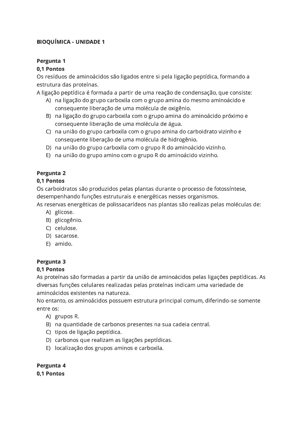 BIOQUÍMICA - UNIDADE 1 Pergunta 1 0,1 Pontos Os resíduos de aminoácidos são ligados entre si pela ligação peptídica, formando a estrutura das proteínas. A ligação peptídica é formada a partir de uma reação de condensação, que consiste: A) na ligação do grupo carboxila com o grupo amina do mesmo aminoácido e consequente liberação de uma molécula de oxigênio. B) na ligação do grupo carboxila com o grupo amina do aminoácido próximo e consequente liberação de uma molécula de água. C) na união do grupo carboxila com o grupo amina do carboidrato vizinho e consequente liberação de uma molécula de hidrogênio. D) na união do grupo carboxila com o grupo R do aminoácido vizinho. E) na união do grupo a mino com o grupo R do aminoácido vizinho. Pergunta 2 0,1 Pontos Os carboidratos são produzidos pelas plantas durante o processo de fotossíntese, desempenhando funções estruturais e energéticas nesses organismos. As reservas energéticas de polissacarídeos nas plantas são realizas pelas moléculas de: A) glicose. B) glicogênio. C) celulose. D) sacarose. E) amido. Pergunta 3 0,1 Pontos As proteínas são formadas a partir da união de aminoácidos pelas ligações peptídicas. As diversas funções celulares realizadas pelas proteínas indicam uma variedade de aminoácidos existentes na natureza. No entanto, os aminoácidos possuem estrutura principal comum, diferindo-se somente entre os: A) grupos R. B) na quantidade de carbonos presentes na sua cadeia central. C) tipos de ligação peptídica. D) carbonos que realizam as ligações peptídicas. E) localização dos grupos aminos e carboxila. Pergunta 4 0,1 Pontos Erika Realce Erika Realce Erika Realce Os hormônios esteroides são considerados fatores de transcrição pois eles entram nas células e ligam-se aos receptores nucleares. A capacidade de difusão desses compostos pelas membranas é atribuída a característica química de suas moléculas, pois elas são sintetizadas a partir de: A) triglicerídeos. B) ácidos graxos. C) colesterol. D) cerídeos. E) fosfolipídeos. Pergunta 5 0,1 Pontos As proteínas estão envolvidas em diversas funções nos organismos, podendo atuar em funções estruturais, tais como o colágeno, ou em funções metabólicas, como as enzimas. A síntese proteica é baseada nos genes que indicam a sequência de polimerização das unidades monoméricas denominadas: A) distrofina. B) actina. C) miosina. D) aminoácidos. E) tropomiosina. Pergunta 6 0,1 Pontos As proteínas atuam em diversas funções nas células, inclusive possibilitando com que reações químicas ocorram de maneira mais rápida, sem alterar o produto das reações. As proteínas que exercem essa função são as: A) neurotransmissores. B) hormônios. C) proteínas estruturais. D) enzimas. E) proteínas transportadoras. Pergunta 7 0,1 Pontos As membranas biológicas revestem as organelas membranosas e, nas células, delimitam o espaço intracelular e extracelular, atuando como uma barreira seletiva. A estrutura dessas membranas é formada principalmente por uma dupla camada de lipídeos e algumas proteínas. No entanto, os principais lipídeos envolvidos na formação das membranas são: A) triglicerídeos. B) cerídeos. C) esteroides. D) fosfolipídeos. Erika Realce Erika Realce Erika Realce Erika Realce E) colesterol. Pergunta 8 0,1 Pontos Os óleos vegetais, tais como os de oliva, de milho, de canola e de soja, são formados principalmente por triglicerídeos. Em condições ambientais normais, os óleos vegetais apresentam-se no estado líquido, pois: A) as cadeias de ácidos graxos são formadas por ligações simples entre as moléculas de carbono. B) as cadeias dos ácidos graxos que formam os triglicerídeos dos óleos vegetais são i nsatu radas. C) as cadeias dos ácidos graxos são saturadas. D) os resíduos de glicerol presentes nos óleos vegetais possibilitam o estado líquido dessas substâncias. E) os triglicerídeos se dissociam em glicerol e ácidos graxos. Pergunta 9 0,1 Pontos O DNA teve a sua estrutura desvendada em 1953 por James Watson e Francis Crick em seu trabalho "Molecular structure of the nucleic acids" publicado na revista Nature. A dupla hélice é formada por uma sequência de nucleotídeos, que possuem na sua estrutura a desoxirribose, que é classificada bioquimicamente como um (a): A) polissacarídeo. B) triase. C) tetrase. D) pentase. E) hexase. Pergunta 10 0,1 Pontos Nos sistemas biológicos, o sistema tampão é composto por um ácido fraco e a sua base conjugada, que possuem capacidade de impedir grandes variações de pH nos compartimentos celulares ou corporais. A manutenção do controle do pH é indispensável para atuação da: A) acetilcolina. B) colágeno. C) hidrolase. D) tubulina. E) queratina. Erika Realce Erika Realce Erika Realce BIOQUÍMICA - UNIDADE 2 Pergunta 1 0,1 Pontos A obtenção de elétrons ricos em energia, o acúmulo de íons H+ e a utilização da energia do movimento do H+ para produção de ATP é o mecanismo realizado por qual via metabólica estudada nessa unidade? 1. Catabolismo e anabolismo. 2. Ciclo de Krebs. 3. Cadeia respiratória. 4. Gliconeogênese. 5. Glicólise. Pergunta 2 0,1 Pontos O saldo energético final da cadeia respiratória a partir de uma molécula de glicose é de: 1. 32 ATPs. 2. 4 ATPs. 3. 25 ATPs. 4. 3 ATPs. 5. 38 ATPs. Pergunta 3 0,1 Pontos A membrana realiza o transporte passivo quando não há gasto de energia para a célula. Esse tipo de transporte acontece: 1. do meio menos concentrado para o meio mais concentrado e o principal exemplo é a bomba de sódio e potássio. 2. contra o gradiente de concentração e precisa de transportadores para moléculas maiores. 3. a favor do gradiente de concentração e pode ser classificado em difusão simples, facilitada e osmose. 4. contra o gradiente de concentração e pode ser classificado em difusão simples, facilitada e osmose. 5. a favor o gradiente de concentração e 