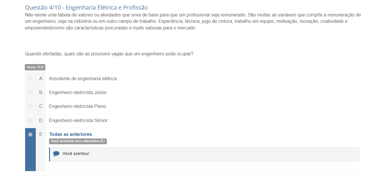 Questão 4/10 - Engenharia Elétrica e Profissão Não existe uma tabela de valores ou atividades que sirva de base para que um profissional seja remunerado. São muitas as variáveis que compõe a remuneração de um engenheiro, seja na indústria ou em outro campo de trabalho. Experiência, técnica, jogo de cintura, trabalho em inovação, criatividade e empreendedorismo são características procuradas e muito valiosas para mercado. Quando ofertadas, quais são as possíveis vagas que um engenheiro pode ocupar?