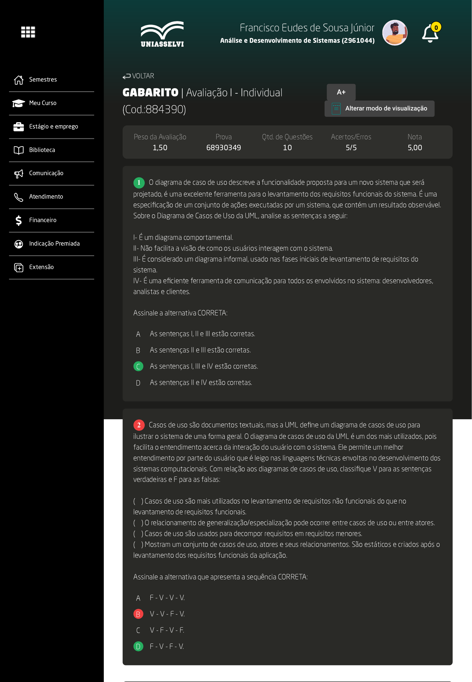 GABARITO | Avaliação I - Individual (Cod.:884390) Peso da Avaliação 1,50 Prova 68930349 Qtd. de Questões 10 Acertos/Erros 5/5 Nota 5,00 O diagrama de caso de uso descreve a funcionalidade proposta para um novo sistema que será projetado, é uma excelente ferramenta para o levantamento dos requisitos funcionais do sistema. É uma especificação de um conjunto de ações executadas por um sistema, que contém um resultado observável. Sobre o Diagrama de Casos de Uso da UML, analise as sentenças a seguir: I- É um diagrama comportamental. II- Não facilita a visão de como os usuários interagem com o sistema. III- É considerado um diagrama informal, usado nas fases iniciais de levantamento de requisitos do sistema. IV- É uma eficiente ferramenta de comunicação para todos os envolvidos no sistema: desenvolvedores, analistas e clientes. Assinale a alternativa CORRETA: A As sentenças I, II e III estão corretas. B As sentenças II e III estão corretas. C As sentenças I, III e IV estão corretas. D As sentenças II e IV estão corretas. Casos de uso são documentos textuais, mas a UML define um diagrama de casos de uso para ilustrar o sistema de uma forma geral. O diagrama de casos de uso da UML é um dos mais utilizados, pois facilita o entendimento acerca da interação do usuário com o sistema. Ele permite um melhor entendimento por parte do usuário que é leigo nas linguagens técnicas envoltas no desenvolvimento dos sistemas computacionais. Com relação aos diagramas de casos de uso, classifique V para as sentenças verdadeiras e F para as falsas: ( ) Casos de uso são mais utilizados no levantamento de requisitos não funcionais do que no levantamento de requisitos funcionais. ( ) O relacionamento de generalização/especialização pode ocorrer entre casos de uso ou entre atores. ( ) Casos de uso são usados para decompor requisitos em requisitos menores. ( ) Mostram um conjunto de casos de uso, atores e seus relacionamentos. São estáticos e criados após o levantamento dos requisitos funcionais da aplicação. Assinale a alternativa que apresenta a sequência CORRETA: A F - V - V - V. B V - V - F - V. C V - F - V - F. D F - V - F - V. VOLTAR A+ Alterar modo de visualização 1 2 Francisco Eudes de Sousa Júnior Análise e Desenvolvimento de Sistemas (2961044) 0 Semestres Meu Curso Estágio e emprego Biblioteca Comunicação Atendimento Financeiro Indicação Premiada Extensão https://ava2.uniasselvi.com.br/home https://ava2.uniasselvi.com.br/my-course https://ava2.uniasselvi.com.br/internships-and-jobs https://ava2.uniasselvi.com.br/communication https://ava2.uniasselvi.com.br/attendance https://ava2.uniasselvi.com.br/financial https://ava2.uniasselvi.com.br/award-indication https://ava2.uniasselvi.com.br/extension O diagrama de Casos de Uso auxilia no levantamento dos requisitos funcionais do sistema, descrevendo um conjunto de funcionalidades do sistema e suas interações com elementos externos e entre si. Sobre estas relações, classifique V para as sentenças verdadeiras e F para as falsas: ( ) A relação include representa subfluxos dos casos de uso. ( ) A relação extend representa os fluxos alternativos dos casos de uso. ( ) A relação de generalização é percebida entre casos de uso ou entre atores. ( ) A generalização não permite especificar comportamentos genéricos que são usados para atender a necessidades específicas. Assinale a alternativa que apresenta a sequência CORRETA: A F - V - V - F. B V - F - V - F. C V - V - V - F. D V - V - F - V. Os casos de uso de um projeto de software são descritos na linguagem UML através dos diagramas de casos de uso. Estes diagramas utilizam como primitivas atores, casos de uso e relacionamentos. Através da UML (Linguagem de Modelagem Unificada), os casos de uso que apresentam maior complexidade podem ser particionados por meio das relações include, extend e generalização. Sobre estas relações, classifique V para as sentenças verdadeiras e F para as falsas: ( ) A relação include representa subfluxos dos casos de uso. ( ) A relação extend representa os fluxos alternativos dos casos de uso. ( ) A relação de generalização é percebida entre casos de uso ou entre atores. ( ) A generalização não permite especificar comportamentos genéricos que são usados para atender a necessidades específicas. Assinale a alternativa que apresenta a sequência CORRETA: A F - V - V - F. B V - V - F - V. C V - F - V - F. D V - V - V - F. O Diagrama de Atividade da UML 2 é utilizado para modelar atividades que podem ser um método ou um algoritmo, ou mesmo um processo de negócio. Sobre este diagrama, classifique V para as sentenças verdadeiras e F para as falsas: ( ) Representa ações executadas por casos de uso. ( ) As linhas verticais do diagrama de atividade identificam o executor da ação. ( ) Ações não podem ser decompostas dentro das atividades. ( ) Ações não podem ser entendidas como pré ou pós-condições. Assinale a alternativa que apresenta a sequência CORRETA: A F - F - V - V. B F - V - V - F. C V - V - V - F. D V - V - F - F. 3 4 5 Francisco Eudes de Sousa Júnior Análise e Desenvolvimento de Sistemas (2961044) 0 Semestres Meu Curso Estágio e emprego Biblioteca Comunicação Atendimento Financeiro Indicação Premiada Extensão https://ava2.uniasselvi.com.br/home https://ava2.uniasselvi.com.br/my-course https://ava2.uniasselvi.com.br/internships-and-jobs https://ava2.uniasselvi.com.br/communication https://ava2.uniasselvi.com.br/attendance https://ava2.uniasselvi.com.br/financial https://ava2.uniasselvi.com.br/award-indication https://ava2.uniasselvi.com.br/extension A Linguagem de Modelagem Unificada é composta por treze diagramas com funções distintas, que tem como objetivo representar graficamente as diferentes partes de um sistema. Os diagramas podem ser de estrutura ou comportamento. Ambos podem ser classificados ainda em estáticos ou dinâmicos. Dentre os diagramas de