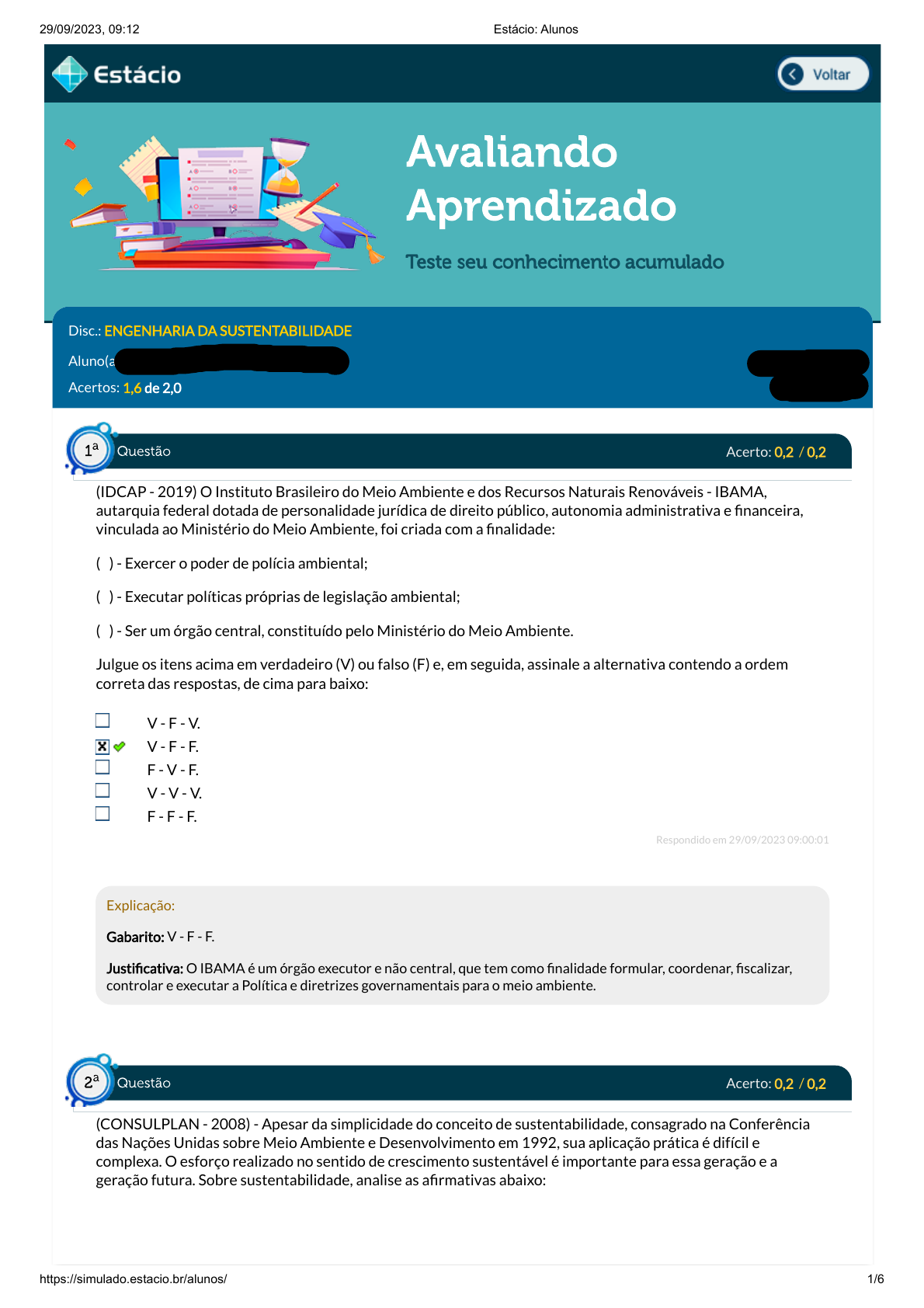 29/09/2023, 09:12 Estácio: Alunos https://simulado.estacio.br/alunos/ 1/6 Disc.: Aluno(a): Acertos: Acerto: / (IDCAP - 2019) O Instituto Brasileiro doMeio Ambiente e dos Recursos Naturais Renováveis - IBAMA, autarquia federal dotada de personalidade jurídica de direito público, autonomia administrativa e nanceira, vinculada aoMinistério doMeio Ambiente, foi criada com a nalidade: ( ) - Exercer o poder de polícia ambiental; ( ) - Executar políticas próprias de legislação ambiental; ( ) - Ser um órgão central, constituído peloMinistério doMeio Ambiente. Julgue os itens acima em verdadeiro (V) ou falso (F) e, em seguida, assinale a alternativa contendo a ordem correta das respostas, de cima para baixo: V - F - V. V - F - F. F - V - F. V - V - V. F - F - F. Respondido em 29/09/2023 09:00:01 Explicação: V - F - F. O IBAMA é um órgão executor e não central, que tem como nalidade formular, coordenar, scalizar, controlar e executar a Política e diretrizes governamentais para omeio ambiente. Acerto: / (CONSULPLAN - 2008) - Apesar da simplicidade do conceito de sustentabilidade, consagrado na Conferência das Nações Unidas sobreMeio Ambiente e Desenvolvimento em 1992, sua aplicação prática é difícil e complexa. O esforço realizado no sentido de crescimento sustentável é importante para essa geração e a geração futura. Sobre sustentabilidade, analise as armativas abaixo: 29/09/2023, 09:12 Estácio: Alunos https://simulado.estacio.br/alunos/ 2/6 I. Introduzir novas tecnologias de explotação pode acelerar o esgotamento dos recursos e comprometer ainda mais a sustentabilidade. II. A sustentabilidade é difícil de ser mantida devido à diversidade dos aspectos envolvidos, que são de natureza biológica, ambiental, tecnológica, social, econômica e política. III. Os subsídios à atividade pesqueira têm contribuído paramanter a sobrepesca e dicultado os esforços de conservação dos recursos e sua sustentabilidade. IV. Amaricultura representa amelhor alternativa para atender a demanda comercial e a preservação dos estoques naturais para as gerações futuras, sendo parte do processo de sustentabilidade. Está(ão) correta(s) apenas a(s) armativa(s): I e III I, II e III III II I, II, III e IV Respondido em 29/09/2023 09:00:41 Explicação: As armativas I, II, III e IV são as corretas. Acerto: / A Resolução n. 357 do CONAMAnormatiza o consumo humano. Sobre a resolução CONAMA357/2005, é correto armar: Enquadra as atividades potencialmente poluidoras em concordância com os euentes líquidos e dá outras providências. Dene a disposição nal dos resíduos sólidos oriundos das caldeiras e dá outras providências. Dispõe sobre a classicação dos corpos de água e seu enquadramento, estabelece padrões de lançamento de euentes e dá outras providências. Estabelece o comparativo igualitário dos euentes líquidos e resíduos sólidos em zonas periféricas e dá outras providências. Discute e torna pública a decisão de dispor os resíduos em seus espaços distritais e dá outras providências. Respondido em 29/09/2023 09:01:11 Explicação: Esta Resolução dispõe sobre a classicação e diretrizes ambientais para o enquadramento dos corpos de água superciais, bem como estabelece as condições e padrões de lançamento de euentes. Acerto: / (FCC - 2005 - adaptado) Existem vários níveis hierárquicos no gerenciamento de resíduos sólidos insustriais. No gerenciamento de resíduos industriais o último nível hierárquico a ser recomendado é: minimização dos resíduos. 29/09/2023, 09:12 Estácio: Alunos https://simulado.estacio.br/alunos/ 3/6 incineração dos resíduos. reutilização dos resíduos. aterramento dos resíduos. reciclagem dos resíduos. Respondido em 29/09/2023 09:03:10 Explicação: O último nível é a disposição nal, no caso o aterro. Acerto: / Extremamente importante para implantação do Sistema de Gestão Ambiental, a comunicação, na norma 14001:2015 estabelece-se que no(s) seu(s) processo(s) de comunicação, a organização deve: levar em consideração exclusivamente seus requisitos legais. reter informação documentada sem evidências. apenas realizar a comunicação sem feedback das respostas. assegurar que a informação comunicada seja coerente com a informação gerada dentro do SGC. estabelecer processo(s) necessário(s) somente para comunicações internas. Respondido em 29/09/2023 09:03:53 Explicação: assegurar que a informação comunicada seja coerente com a informação gerada dentro do SGC. A organização deve estabelecer, implementar emanter processo(s) necessário(s) para comunicações internas e externas pertinentes para o Sistema de Gestão Ambiental. Ao estabelecer o(s) seu(s) processo(s) de comunicação, a organização deve levar em consideração seus requisitos legais e outros requisitos; assegurar que a informação ambiental comunicada seja coerente com a informação gerada dentro do Sistema de Gestão Ambiental e que seja conável, assim como a organização deve responder às comunicações pertinentes, referentes ao seu Sistema de Gestão Ambiental e reter informação documentada como evidência de suas comunicações. Acerto: / (IF-TO - 2017) No âmbito das preocupações com os impactos ambientais das atividades industriais surgiram diversos conceitos, dentre os quais dois têm ganhado destaque: a ecoeciência e a produçãomais limpa. Sobre esses dois termos, analise as armações abaixo. I. A Ecoeciência é uma losoa de gestão que visa minimizar os danos ecológicos, ao mesmo tempo em que maximiza a eciência dos processos de produção da empresa. Isso pode ocorrer através de iniciativas como a redução do consumo de água, energia, materiais, aumento da reciclagem e a eliminação de emissões e/ou de subprodutos perigosos. II. A Ecoeciência consiste em um dos grandes desaos gerenciais da atualidade, posto que ela visa conciliar duas variáveis tecnicamente antagônicas.