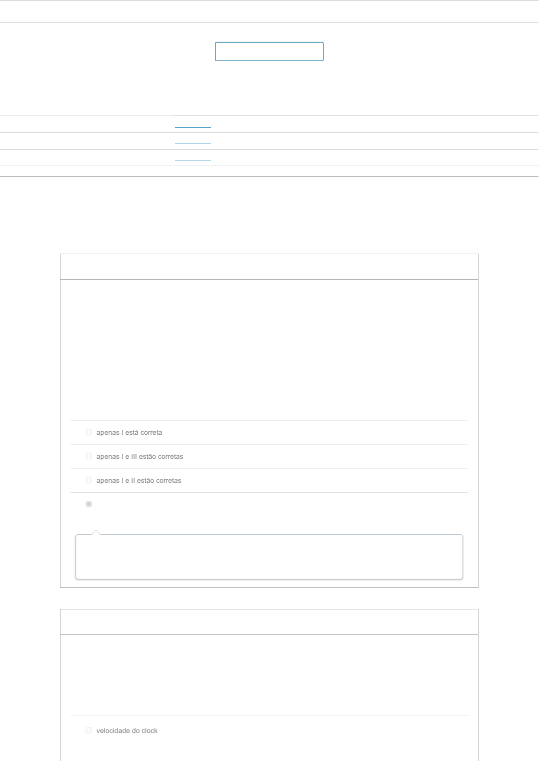 29/09/2023, 14:26 Atividade Objetiva Unidade 4: 05 - Projeto (Design) de Software (2023) https://pucminas.instructure.com/courses/146486/quizzes/387912 1/3 Atividade Objetiva Unidade 4 Entrega Sem prazo Pontos 15 Perguntas 5 Limite de tempo Nenhum Tentativas permitidas Sem limite Histórico de tentativas Tentativa Tempo Pontuação MANTIDO Tentativa 2 2 minutos 15 de 15 MAIS RECENTE Tentativa 2 2 minutos 15 de 15 Tentativa 1 7 minutos 12 de 15 As respostas corretas estão ocultas. Pontuação desta tentativa: 15 de 15 Enviado 29 set em 14:26 Esta tentativa levou 2 minutos. Fazer o teste novamente 3 / 3 ptsPergunta 1 Considere as assertivas abaixo sobre a visão de componentes e conectores 1. A visão de componentes e conectores representa elementos de implementação. 2. Na visão de componentes e conectores os componentes podem possuir diferentes tipos dependendo do estilo arquitetural empregado na documentação. 3. A ligação é a relação definida na visão de componentes e conectores. Sobre as assertivas podemos afirmar que: apenas I está correta apenas I e III estão corretas apenas I e II estão corretas apenas II e III estão corretas A afirmativa 1 está incorreta pois a visão de componentes e conectores representa elementos de execução da arquitetura e não de implementação. As afirmativas 2 e 3 estão corretas. 3 / 3 ptsPergunta 2 Algumas propriedades dos elementos de ambiente devem ser documentadas na arquitetura para garantir a correta alocação dos elementos de software. Todas as propriedades abaixo são relevantes para os elementos de ambiente EXCETO: velocidade do clock https://pucminas.instructure.com/courses/146486/quizzes/387912/history?version=2 https://pucminas.instructure.com/courses/146486/quizzes/387912/history?version=2 https://pucminas.instructure.com/courses/146486/quizzes/387912/history?version=1 https://pucminas.instructure.com/courses/146486/quizzes/387912/take?user_id=256033 29/09/2023, 14:26 Atividade Objetiva Unidade 4: 05 - Projeto (Design) de Software (2023) https://pucminas.instructure.com/courses/146486/quizzes/387912 2/3 consumo de recursos Justificativa: Os elementos de ambiente neste caso são as máquinas, ou os elementos de hardware. A velocidade do clock, o número de processadores e a capacidade de memória são relevantes de serem documentadas. O consumo de recursos computacionais é uma propriedade de um elemento de software. número de processadores capacidade da memória 3 / 3 ptsPergunta 3 Em uma interface, os pontos de interação são denominados recursos. São tipos comuns de recursos das interfaces EXCETO: modificação de protocolo de comunicação em tempo de execução Justificativa: A modificação de protocolo de comunicação em tempo de execução não é viável pois pode causar corrupção dos dados entre outros prejuízos. Todas as outras alternativas são recursos das interfaces e representam um ponto de interação. memória compartilhada chamadas de funções ou métodos requisições à web services 3 / 3 ptsPergunta 4 Considere as vantagens abaixo sobre microsserviços: I) Cada microsserviço possui limites bem estabelecidos. II) A implantação dos microsserviços acontece de forma independente. III) Cada microsserviço de uma aplicação pode ser desenvolvido usando uma linguagem de programação diferente ou tecnologias específicas e diversas dos outros microsserviços. IV) Arquiteturas de microsserviços são mais facilmente implementadas. Quais das vantagens listadas acima realmente se relacionam a microsserviços? Apenas III é vantagem de microsserviços. Apenas II e III são vantagens de microsserviços. Apenas I ,II e III são vantagens de microsserviços. 29/09/2023, 14:26 Atividade Objetiva Unidade 4: 05 - Projeto (Design) de Software (2023) https://pucminas.instructure.com/courses/146486/quizzes/387912 3/3 Apenas as assertivas I, II e III estão corretas. Arquiteturas de microsserviços são mais difíceis de se implementar pois em arquiteturas distribuídas, chamadas remotas correm o risco de falharem e são mais demoradas de serem executadas e fornecerem as respostas. Apenas I e II são vantagens de microsserviços. 3 / 3 ptsPergunta 5 O estilo de camadas utilizado na visão de módulos para descrever uma arquitetura de software deve ser usado para os fins listados abaixo, EXCETO: facilitar testes incrementais e independentes por camada promover reuso melhorar o desempenho da aplicação expandindo o número de camadas da arquitetura Justificativa: Camadas em geral exigem um esforço maior de comunicação entre camadas do que uma arquitetura sem camadas. Este esforço extra acaba prejudicando o desempenho da aplicação. Então quanto mais camadas maior é a tendência do desempenho cair. Por outro lado, camadas promovem o reuso pois uma ou mais camadas podem ser reutilizadas em outras aplicações. Camadas promovem a separação de preocupações sendo que cada interesse fica contido dentro de uma camada. Camadas facilitam os testes independentes por uma camada pois é fácil de isolar e passar valores esperados na dependência. E favorecem os testes incrementais, cada hora acrescentando mais uma camada. promover a separação de interesses ou preocupações representando abstrações em diferentes níveis Pontuação do teste: 15 de 15