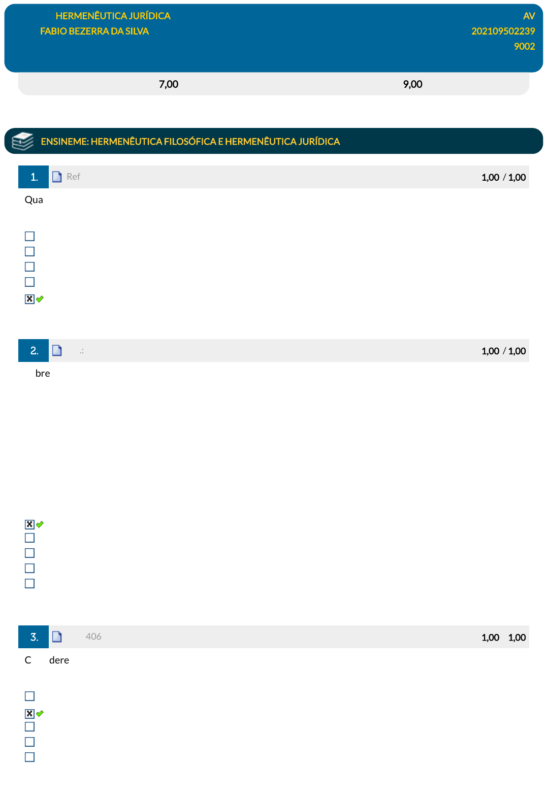 03/05/2023, 20:29 EPS https://simulado.estacio.br/alunos/ 1/4 Disciplina: HERMENÊUTICA JURÍDICA AV Aluno: FABIO BEZERRA DA SILVA 202109502239 Turma: 9002 ARA0825_AV_202109502239 (AG) 28/04/2022 07:50:23 (F) Avaliação: 7,00 pts Nota SIA: 9,00 pts ENSINEME: HERMENÊUTICA FILOSÓFICA E HERMENÊUTICA JURÍDICA 1. Ref.: 4068442 Pontos: 1,00 / 1,00 Quando um tribunal inclui um conceito originalmente não previsto em um texto legal, mas que guarda relação com o propósito da norma, que método interpretativo está aplicando? Histórico Sistemático Literal Sociológico Teleológico 2. Ref.: 4068436 Pontos: 1,00 / 1,00 Sobre a origem da hermenêutica �losó�ca, analise as a�rmativas a seguir: I - Aristóteles posicionava-se sobre a hermenêutica de forma distinta da atual, uma vez que a via com caráter muito mais explicativo do que compreensivo. II - Dilthey defendia que as Ciências Humanas não possuíam método, o que permitia a elas maior liberdade de investigação. III - Apolo é o deus grego que representa a hermenêutica, uma vez que ilumina o mundo ao redor, tal como a interpretação de um texto. Está(ão) correta(s): I apenas II apenas I, II e III I e II III apenas 3. Ref.: 4068438 Pontos: 1,00 / 1,00 Considere a seguinte a�rmação: As autoridades devem ser seguidas de forma acrítica, pois o que importa realmente é o poder que elas possuem. À luz da autoridade compreendida pela hermenêutica, esta a�rmação está: Correta, pois os juízos da autoridade são sempre legítimos. Incorreta, pois a autoridade não exclui a possibilidade de re�exão crítica. Incorreta, pois as autoridades não devem ser seguidas, mesmo que tenham poder para tanto. Correta, pois a autoridade afasta a capacidade de crítica. Incorreta, pois somente a autoridade estatal é assim. javascript:alert('C%C3%B3digo da quest%C3%A3o: 4068442.'); javascript:alert('C%C3%B3digo da quest%C3%A3o: 4068436.'); javascript:alert('C%C3%B3digo da quest%C3%A3o: 4068438.'); 03/05/2023, 20:29 EPS https://simulado.estacio.br/alunos/ 2/4 ENSINEME: LÓGICA E RETÓRICA 4. Ref.: 4113368 Pontos: 0,00 / 1,00 Sobre o quadro das oposições de Aristóteles, analise as alternativas abaixo: "Todo ser humano é ambicioso" é uma assertiva contrária a "Nenhum ser humano é ambicioso". "Nenhum cão consegue falar" é contraditória em relação a "Alguns cães falam". "Todo jogador de futebol gosta de samba e pagode" tem por subalterna "Alguns jogadores de futebol não gostam de samba e pagode". São verdadeiras as assertivas: I e II Apenas I II e III Apenas a III I e III 5. Ref.: 4110380 Pontos: 0,00 / 1,00 Qual dos argumentos abaixo representa um modus ponens: Todo mar é revolto. As águas do Wormink são revoltas. O Wormink é um mar. Todas as churrascarias servem fraldinha. No Gugu é servida uma fraldinha manteiga. Logo, o Gugu é uma churrascaria. Todo orador tem o dom da palavra. O pastor Damião tem o dom da palavra. Logo, ele é um orador. Todo animal é silvestre. As Raposas são silvestres. Logo, as raposas são animais. Todo advogado é treinado para defender o cliente. Marco Túlio Cícero é um advogado. Portanto, ele é treinado para defender clientes. 6. Ref.: 4116348 Pontos: 0,00 / 1,00 Qual dos argumentos abaixo pode ser identi�cado como um raciocínio indutivo? Pesquisas recentes demonstraram que, em 90% dos casos, os brasileiros preferem fazer operações bancárias pelo celular. Por isso, os bancos irão ampliar suas operações digitais. Os diplomatas têm ampla habilidade negocial. Simon Peres, diploma peruano, demonstrou ser um excelente negociador. Os argentinos amavam o grande jogador Diego Maradona. Nosso vizinho argentino, Juan Perón, sofreu bastante com o falecimento do grande jogador portenho. As crianças amam bolo de chocolate. Julinha (5 anos), está ansiosa pelo seu pedaço. Todo criminoso, algum momento, violou pelo menos uma norma jurídica. O assaltante Marcos Pereira é um criminoso. Marcos Pereira violou normas jurídicas. ENSINEME: TEORIAS DA ARGUMENTAÇÃO javascript:alert('C%C3%B3digo da quest%C3%A3o: 4113368.'); javascript:alert('C%C3%B3digo da quest%C3%A3o: 4110380.'); javascript:alert('C%C3%B3digo da quest%C3%A3o: 4116348.'); 03/05/2023, 20:29 EPS https://simulado.estacio.br/alunos/ 3/4 7. Ref.: 4119278 Pontos: 1,00 / 1,00 No auditório universal, espaço de argumentação abrangente que ultrapassa a esfera do contexto local, podemos a�rmar, segundo a Nova Retórica de Chaïm Perelman e Lucie Olbrechts que são debatidos temas como: As necessidades materiais especí�cas de uma comunidade As presunções sobre os fatos cientí�cos. Os valores morais que ultrapassam a esfera da comunidade Os fatos acerca da história da comunidade As relações de bem-estar e utilidade �nanceiras 8. Ref.: 4122266 Pontos: 1,00 / 1,00 Num determinado momento, Marco Antônio passou a esclarecer o público sobre como o aquecimento global estava sendo causado pelas emissões de dióxido de carbono. Para fazer sua exposição, Marco Antônio a todo momento demonstrava fórmulas cientí�cas por meio de silogismos. A forma pela qual Marco Antônio estava expressando sua fala pode ser caracterizada por: Discurso epidíctico Discurso deliberativo Discurso cientí�co Discurso político Discurso judicial ENSINEME: TEORIAS DO DIREITO E O PAPEL DOS JUÍZES 9. Ref.: 4053529 Pontos: 1,00 / 1,00 Sobre o positivismo jurídico, assinale abaixo a alternativa que não corresponde aos pilares e postulados dessa teoria do Direito: O positivismo jurídico é uma ciência ou teorização que consiste fundamentalmente na identi�cação do Direito com o direito positivo. O positivismo jurídico em geral defende a ideia de que o ordenamento jurídico é composto por um conjunto de normas postas por uma autoridade, sem, contudo, defender a ideia de completude desse ordenamento, uma vez que admite a possibilidade de existência de lacunas na lei. O positivismo jurídico em sentido amplo é aquele a�rma 