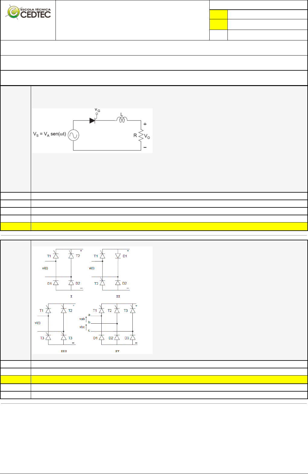 Pincel Atômico - 27/09/2023 21:14:15 1/2 WASHINGTON RODRIGUES DO PRADO Exercício Caminho do Conhecimento - Etapa 6 (27273) Atividade finalizada em 27/09/2023 19:41:10 (1192573 / 2) LEGENDA Resposta correta na questão # Resposta correta - Questão Anulada X Resposta selecionada pelo Aluno Disciplina: ELETRÔNICA DE POTÊNCIA [838974] - Avaliação com 4 questões, com o peso total de 6,50 pontos [capítulos - 113] Turma: Curso Técnico: Eletrotécnica - Grupo: EAD - 05/23 - EAD ELE [88424] Aluno(a): 91146911 - WASHINGTON RODRIGUES DO PRADO - Respondeu 4 questões corretas, obtendo um total de 6,50 pontos como nota [350057_1887 18] Questão 001 O circuito da figura abaixo representa um retificador de meia-onda, controlado a tiristor (SCR), alimentando uma carga constituída por um reristor R em série com um indutor L. Levando em conta que o circuito está operando em modo descontínuo e que pulso de disparo do tiristor aplicado à porta (gate) apresenta uma duração desprezível em comparação com o período da tensão na entrada VS, considere as afirmativas abaixo. I - No instante em que VS = 0, o tiristor corta e só volta a conduzir corrente novamente quando um novo pulso de disparo for aplicado ao seu terminal de porta (gate). II - Quando o tiristor conta, a presença do indutor L no circuito faz com que a tensão na saída VO, sobre o resistor R, inverta a sua polaridade imediatamente. III - Diferentemente de um retificador com carga puramente resistiva, o nível médio de tensão na saída VO do circuito acima é dependente da carga. É CORRETO o que se afirma em: II e III, apenas I e II, apenas I, apenas. I, II e III X III, apenas [350057_1887 19] Questão 002 Considere as quatro ponte retificadoras abaixo: Está CORRETO o que consta APENAS em: I, II e IV II e IV X I, III e IV II, III e IV I, II e III Pincel Atômico - 27/09/2023 21:14:15 2/2 [350059_1887 16] Questão 003 Analise o circuito a seguir, utilizando as formas de onda apresentadas. Após análise, é CORRETO afirmar: Este circuito representa um conversor trifásico não controlado. Com uma carga puramente resistiva, a corrente de saída será negativa e pulsante, enquanto a tensão de saída será contínua sem ondulações. X O circuito conversor monofásico controlado apresenta uma carga altamente indutiva, proporcionando uma corrente de saída contínua elivre de ondulações. Esse conversor monofásico semicontrolado apresenta uma tensão de saída negativa para qualquer valor de α, operando no terceiro quadrante Durante o semiciclo positivo da tensão de entrada, os transistores T3 e T4 estão polarizados diretamente e conduzem por todo o semiciclo. [350058_1887 14] Questão 004 O circuito apresentado na figura abaixo se refere ao: Retificador monofásico, de onda completa, a diodo. Retificador trifásico de onda completa, a diodo. Retificador monofásico, de onda completa, a Tiristor. Retificador trifásico de meia onda, a diodo. X Retificador trifásico de onda completa, a Tiristor.
