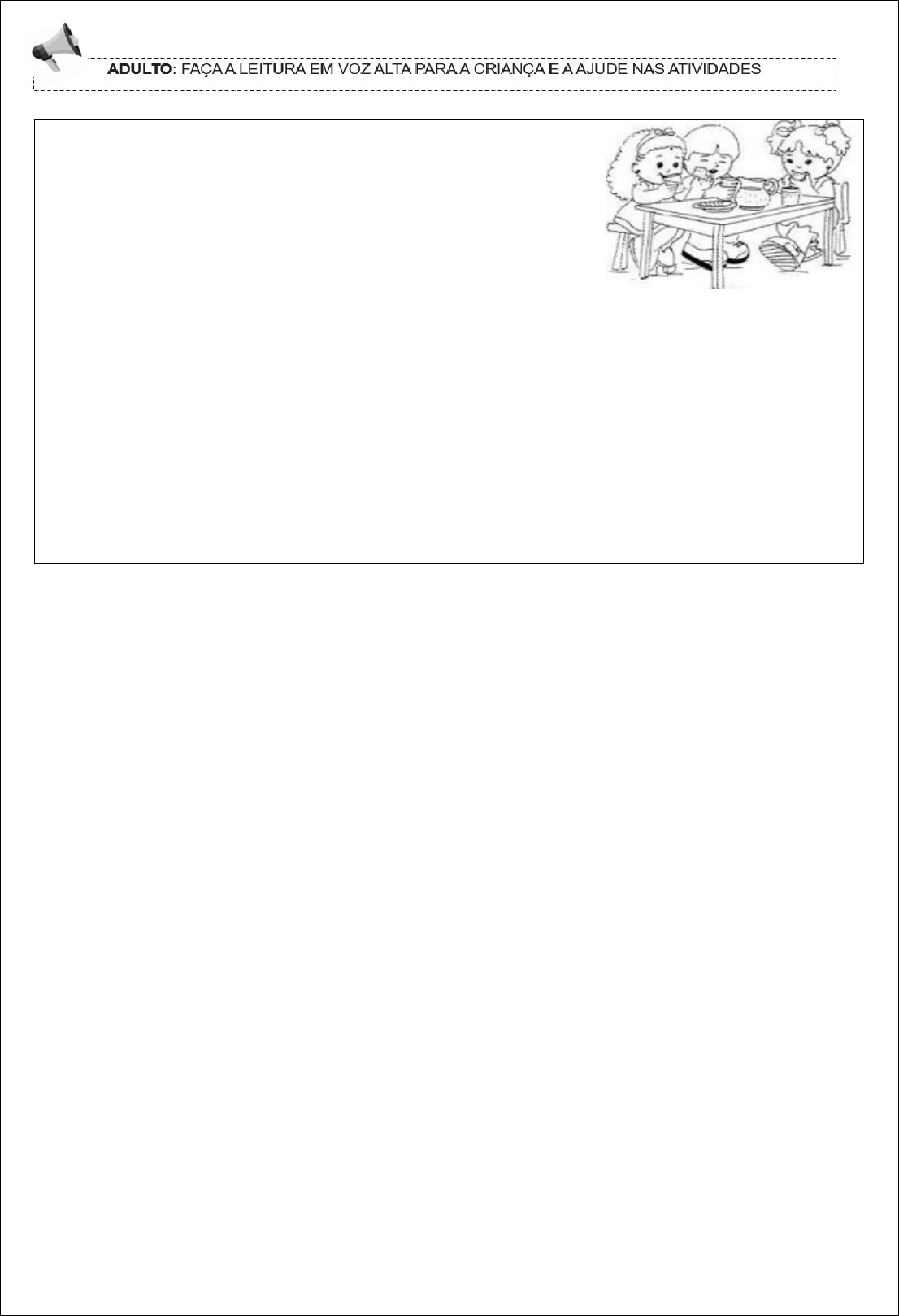 ALIMENTAÇÃO SAUDÁVEL OS ALIMENTOS SÃO ESSENCIAIS À MANUTENÇÃO DA VIDA. ELES SÃO OS RESPONSÁVEIS PELO FORNECIMENTO DA ENERGIA NECESSÁRIA A TODAS AS ATIVIDADES DIÁRIAS: ANDAR, TRABALHAR, COMER, DORMIR, FALAR, CORRER, ETC. PARA CRESCER FORTE E SAUDÁVEL É PRECISO COMER DIARIAMENTE ALIMENTOS COMO CEREAIS (ARROZ, MILHO), TUBÉRCULOS (BATATAS), RAÍZES (MANDIOCA, MACAXEIRA, AIPIM), CARNES E PEIXES, PÃES E MASSAS, DISTRIBUINDO ESSES ALIMENTOS NAS REFEIÇÕES E LANCHES AO LONGO DO DIA. ALÉM DE COMER LEGUMES E VERDURAS NAS DUAS PRINCIPAIS REFEIÇÕES DO DIA E FRUTAS NAS SOBREMESAS E LANCHES. TEMOS QUE EVITAR ALIMENTOS DOCES, SANDUÍCHES, HAMBÚRGUERES E BEBER MUITO REFRIGERANTE POR NÃO SER UMA ALIMENTAÇÃO NUTRITIVA. 1. RESPONDA DE ACORDO COM O TEXTO: a) O TEXTO FALA SOBRE O QUE? _______________________________________________. b) PARA CRESCE FORTE É PRECISO COMER O QUE? __________________________________________________________________________. ___________________________________________________________________________. c) OS ALIMENTOS SÃO OS RESPONSAVEIS PELO? __________________________________________________________________________. d) QUE TIPO DE ALIMENTO DEVEMOS EVITAR? ___________________________________________________________________________. e) DEVEMOS COMER FRUTAS EM QUAIS REFEIÇÕES? ___________________________________________________________________________. 2. CIRCULE DE VERDE OS ALIMENTOS SAUDÁVEIS E CICURLE DE VERMERLHO OS ALIMENTOS QUE NÃO FAZEM BEM PARA A SAÚDE QUANDO CONSUMIDO EM EXCESSO: 3. LEIA O NOME DOS ALIMEMTOS E ESCREVA DENTRO DO PRATO O QUE VOCÊ MAIS GOSTA DE COMER NO ALMOÇO: ARROZ SALADA DE ALFACE BIFE DE BOI BATATA COZIDA FEIJÃO CHUCHU MACARRÃO OVO BIFE DE PORCO TOMATE ABÓBORA REPOLHO FRANGO FAROFA COUVE BATATA FRITA 4. LIGUE DE FORMA CORRETA A IMAGEM AO SEU NOME.