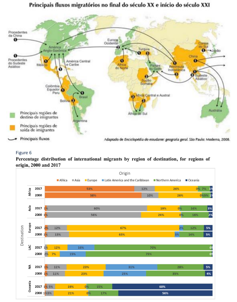 População mundial – Migrações Internacionais Dados essenciais: ❖ 281 milhões de pessoas nasceram em um país e vivem em outro ❖ Os Estados Unidos é o país que mais recebe imigrantes – o que não significa que a maioria do país seja composta por migrantes (apenas 15% da população). Em comparação com os Emirados Árabes, por exemplo, onde quase 90% da população é composta por migrantes, a parcela da população americana que é composta por migrantes não é tão expressiva (em comparação ao total populacional). ❖ A rota migratória africana ocorre principalmente dentro do próprio continente ❖ O crescimento da migração internacional está acontecendo em termos absolutos e relativos ❖ Em 2022, 3,6% da população mundial é imigrante ❖ A pandemia alterou o ritmo da migração mas não diminuiu o número de migrantes ❖ É equilibrada a questão de gênero quando se fala de migração ❖ A maior parte dos migrantes é composta por trabalhadores; os refugiados representam em torno de 30 milhões, cerca de 10% do número de migrantes. ❖ A maioria dos migrantes internacionais se encontram em idade ativa (20-64 anos); no caso dos refugiados, há grande número de crianças. 1 – tradicionais migrações Sul > Norte 3 – migrações Sul > Sul Nos últimos anos, a migração Sul-Sul teve maior número que a migração Sul-Norte. Além das migrações entre países pobres e ricos, é interessante pensar também em sistemas de migrações regionais. A ideia de que as migrações estão globalizadas, mas que permitem a identificação de sistemas regionais, dialogam com as ideias do geografo alemão Ravenstein, que escreveu “The birthplaces of the People and the Laws of Migration (1876)” – que fala da influência da distância sobre os deslocamentos e dos fatores de repulsão e atração (como a economia). Embora os avanços tecnológicos tenham diminuído consideravelmente o peso da distância nesses deslocamentos, isso não significa que ele tenha desaparecido. Importante frisar que a mitigação das distâncias proporcionadas pelos avanços tecnológicos tem caráter seletivo – ou seja, é maior para os que conseguem arcar com os custos desse avanço. Dessa forma, os que não podem arcar com os custos da tecnologia continuam sendo influenciados pelo fator distância. O advento das redes sociais também cria uma importante concentração de migrantes de uma mesma nacionalidade em um mesmo local – as pessoas veem outras de sua nacionalidade em um determinado lugar e esse destino se torna atrativo para a migração, criando uma comunidade (como é o caso de brasileiros em algumas cidades dos EUA, por exemplo). A despeito da ideia de migração Sul>Norte, que é uma imigração importante, ao pegar dados é possível perceber que a maioria das migrações – com exceção da América Latina (sobretudo por conta da proximidade com os EUA), a maioria das migrações ocorrem entre países da mesma região. OBS: a migração Sul>Norte é importante; entretanto, a corrente Sul>Sul também é muito expressiva mas aparece pouco nos veículos midiáticos; em 2017, a migração Sul>Sul superou a migração Sul>Norte. O migrante não só rejuvenesce a população (visto que a maior parte está em idade ativa) como gera maior produtividade; há mais benefícios para os países receptores do que malefícios. Já para os países de saída, há mais malefícios – normalmente relacionados à “fuga de cérebros”, perda de potencial e mão de obra, etc. A vantagem para os países de saída se encontra sobretudo nas remessas internacionais – uma vantagem que se vê na Balança de Pagamentos, quando o migrante envia dinheiro de volta ao seu país de origem. Migrações forçadas No final de 2020, 82 milhões de pessoas são consideradas migrantes forçados; desses 82, 48 milhões são deslocados internos (saída de uma região para outra dentro do próprio território nacional). O restante desse número, cerca de 34 milhões de pessoas, são refugiados. Desse número, 4 milhões são “asylum-seekers” – ainda esperam o status de refugiado. Com a situação da Ucrânia, esse número deve aumentar ainda mais (tanto com refugiados como com deslocados internos). O Afeganistão liderou por 30 anos o ranking de emissão de refugiados, e nesses 30 anos, o país que mais recebeu refugiados afegãos foi o Paquistão; com a Síria, a Turquia; com o caso da Venezuela, a Colômbia passou a ser grande receptora de refugiados venezuelanos. Com a guerra na Ucrânia, certamente a Polônia será a maior receptora de refugiados ucranianos. *A maioria dos venezuelanos não requisitou status de refugiado. É importante ressaltar que, na migração forçada, a fatia de crianças é superior em comparação à pirâmide etária das demais migrações. População brasileira – migrações brasileiras A participação do Brasil e dos brasileiros nos circuitos internacionais de migração Uma grande onda imigratória de 1850 a 1934 vem ao Brasil (com auge de 1890 a 1910); 1934 é o ano marco por conta da Lei de Cotas de Imigração de Vargas. A consolidação da emigração de brasileiros se dá nos anos 80 e 90 do século XX. A quantidade de brasileiros morando nos EUA é quase o triplo do número de brasileiros morando em todos os demais países da América do Sul – o que mostra o perfil do emigrante: de maior renda. O Brasil vira um país emigrador na década de 80 por conta das frustrações econômicas da classe média. Com a crise do subprime em 2008, muitos dos brasileiros que saíram começam a retornar – inicialmente, a crise não atinge o Brasil como atingiu os países desenvolvidos. Os efeitos da crise, entretanto, vão chegar ao Brasil e em 2014, o país volta a ter um perfil emigrador. A migração circular ou rotatividade migratória é a coexistência de números expressivos de saída e chegada. De 1870 a 1953, Italianos lideraram o número de imigrantes vind