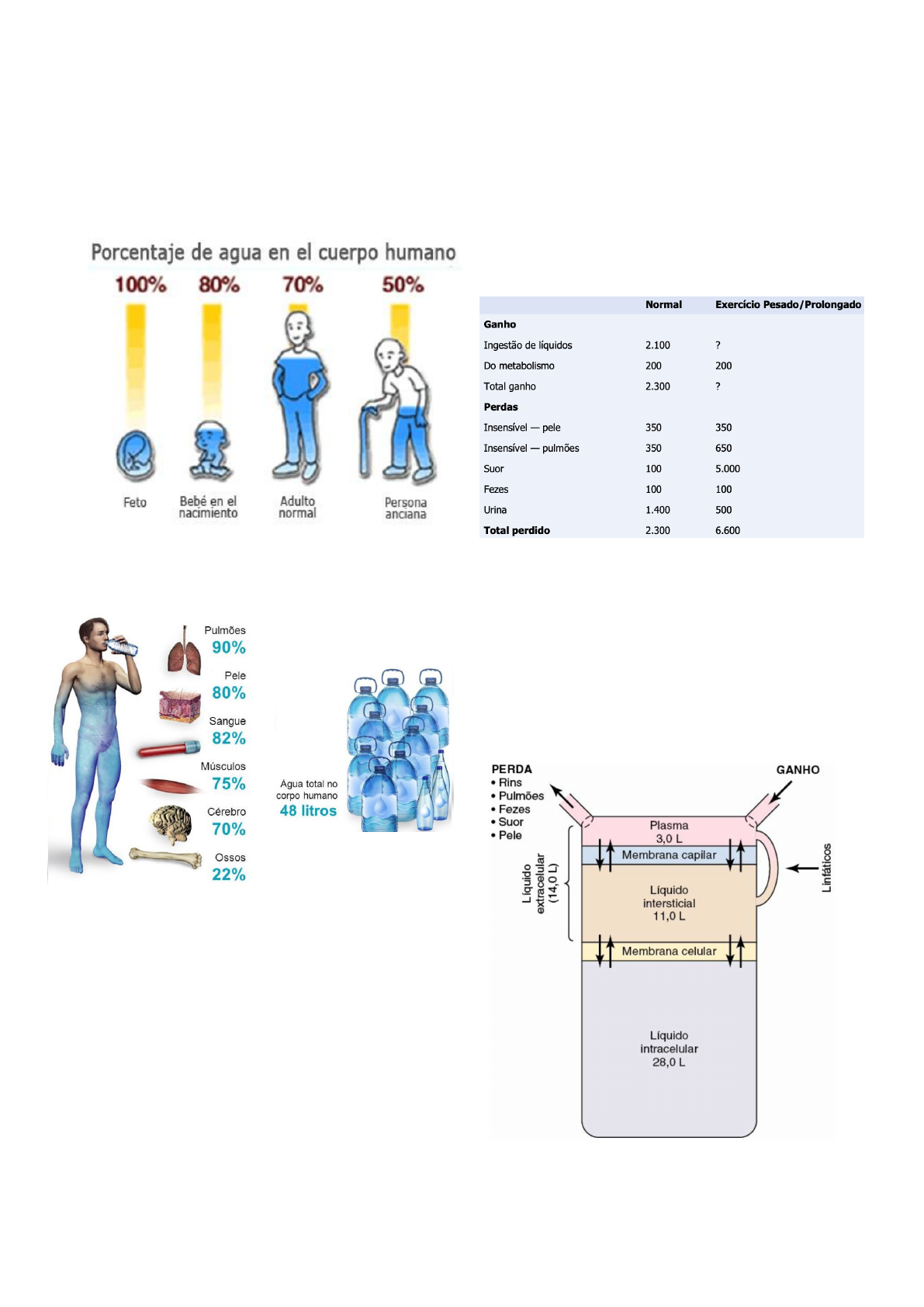Os líquidos corporais e os rins A quantidade de água no corpo humano apresenta variações, que ocorre tanto na fase de desenvolvimento do indivíduo quanto em alguns órgãos, com proporções por órgãos ou regiões do corpo. Sempre muito importante estar ciente do estado de hidratação do idoso Ganho x Perda de água Entrada diária de água Ingestão de água em líquidos ou alimentos, com cerca de 2100mL/dia Síntese de água a partir da oxidação de carboidratos de cerca de 200mL/dia Perda diária de água Perda insensível na pele e nos pulmões 700mL/dia Suor que leva à perda 100mL/dia em condições normais, ou de 1 a 2 L/hora em exercícios Perda de água nas fezes com cerca de 100mL/dia Perda de água pelos rins com cerca de 0,5 L/ dia (estado de desidratação) ou 20 L/dia (em hiper-hidratação). Compartimentos dos líquidos corporais Líquido extracelular O líquido intersticial representa 11 L de água e plasma sanguíneo 3 L Nessa figura é possível perceber que o total de 14 L no líquido extracelular sendo 3 L de plasma e 11 L do líquido intersticial. A membrana capilar que faz trocas constantes entre o meio intra e extracelular, permite o controle do fluxo dessa água e também de outras substâncias. O plasma troca continuamente substâncias com o líquido intersticial através dos poros das membranas capilares. Esses poros são altamente permeáveis, o que garante uma composição aproximada exceto pela concentração de proteínas. Então, se mudar a concentração de proteínas no líquido intersticial ou no plasma o fluxo da água acompanha a concentração das proteínas. Portanto, as alterar os níveis plasmáticos de albumina, por exemplo, pode aumentar o volume de água do plasma. Líquido intracelular Entre 28 a 42L, correspondendo a 40% do peso corporal, sendo uma quantidade exagerada de água quando comparado ao plasma ou ao líquido intersticial. O Líquido de cada célula contém sua compos ição ind iv idua l de d i fe rentes substâncias, porém as concentrações são semelhantes de uma célula para outra. Então, apesar de ter composições diferentes de uma célula para outra as concentrações são praticamente as mesmas para garantir o volume intracelular de água. Lembrando-se sempre da osmose. Líquido Transcelular Líquido dos espaços sinoviais, peritoniais, per icárd icos, in t raocu lares e l íqu ido ce fa lo r raqu id iano . Todo os l í qu idos transcelulares, juntos, somam de 1 a 2L. São líquidos que estão extracelulares, mas pertencem a uma cavidade específica. Volume sanguíneo O volume sanguíneo é de extrema importância para a dinâmica cardiovascular, aumentar ou diminuir representa grandes alterações metabólicas e funcionais do indivíduo. Contém tanto líquido extracelular (plasma), como intracelular (nas hemácias e leucócitos); O sangue é considerado compartimento líquido separado por ter sua própria câmara, o sistema circulatório. O volume sanguíneo faz controle da dinâmica cardiovascular. Sendo constituído em média por 60% de plasma e 40% hemácias. Hematócrito Com o hematócrito é possível calcular o vo lume p lasmá t i co e o de cé lu l as , comparando o de alguns indivíduos que estão com algum processo de anemia, desidratação, entre outras patologias. Coleta-se uma pequena quantidade de sangue através de um tubo bem fino, que pelo fenômeno de capilaridade, onde as paredes desse tubo conseguem atrair o sangue, amassa-se a ponta do tubo, coloca em uma centrífuga e separa-se plasma das hemácias. No homem o hematócrito medido está normalmente em torno de 0,40 e nas mulheres de 0,36. Em quadro de anemia grave chega até 0,10 e a policitemia aumenta para 0,65. A dinâmica vascular, é de grande importância, sendo observada em diversas patologias. Constituintes dos l íquidos extra e intracelular No meio extracelular tem-se uma alta taxa de sódio, pouquíssimo cálcio e potássio. Além disso, alta concentração de cloreto, um pouco de bicarbonato e um pouco de proteínas. No meio intracelular, tem-se alta concentração de potássio, um pouco de magnésio e fosfatos e ân ions o rgân i cos , ass im como a l t a concentração de proteínas. Essa variação de íons do meio intracelular e extracelular, garante a osmose e o volume adequado de água em cada um desses meios. S ó d i o e p o t á s s i o s ã o o p o s t o s e m concentração e essa variação permite o movimento adequado da água e o volume adequado de água em cada um dos compartimentos. Determinação do volume de diferente compartimentos Importante para compreender o fluxo desses íons e da água pelo corpo. Existem várias formas para medir a quantidade de água e outras substâncias do corpo. Medida da água total do corpo É possível medir a água total do corpo utilizando os elementos deutério (2H) e tritium (3H), que são elementos radioativos e eles podem emitir essa radiação que permite a quantificação do volume de água. Usando o mesmo princípio de diluição, é possível medir a quantidade total de água no corpo. 3H2O ou 2H2O. Essa quantificação é baseada nos princípios da diluição, então ejeta-se esses elementos na circulação sanguínea observa- se a diluição e será calculado a quantidade de deutério diluído ou tritium. Outra substância utilizada para esse fim é a antipirina, que é altamente lipossolúvel e pode rapidamente se difundir pela membrana celular e se distribuir uniformemente pelo compartimento intra e extracelular. Então o mesmo princípio da diluição será utilizado para verificar a quantidade de água total no corpo. Princípios básicos da osmose e pressão osmótica A osmose é o movimento da água de acordo com as concentrações de íons. No corpo, tem- se a membrana plasmática que é semi- permeável a água tem possibilidade de atravessar livremente a membrana plasmática das células e para garantir que permaneça uma quantidade ideal de água em um c o m